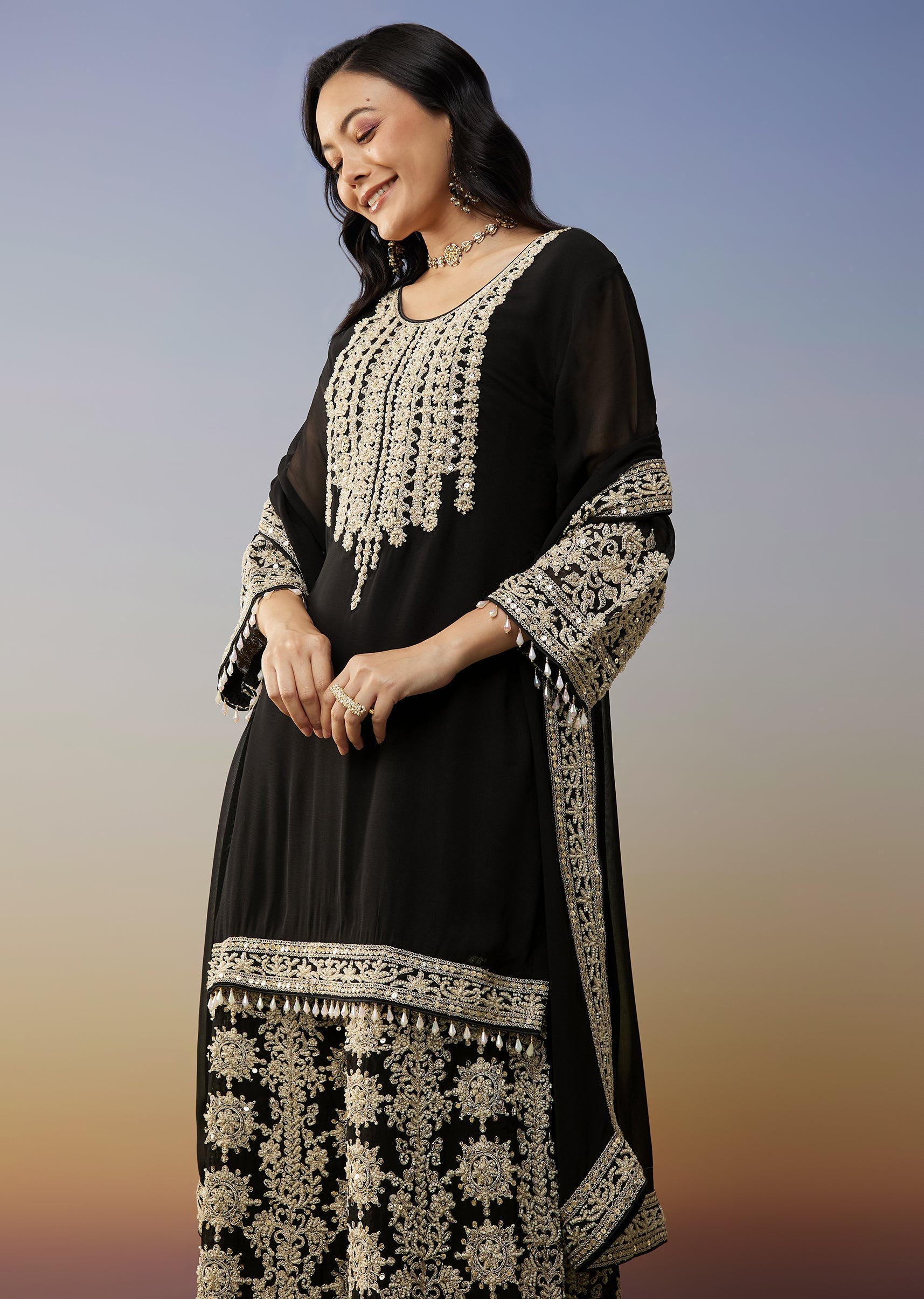 This black palazzo suit blends Pakistani inspired elegance with festive charm making it ideal for mehendi and sangeet celebrations. Crafted in a soft georgette fabric the ensemble features delicate zari... More Product Details