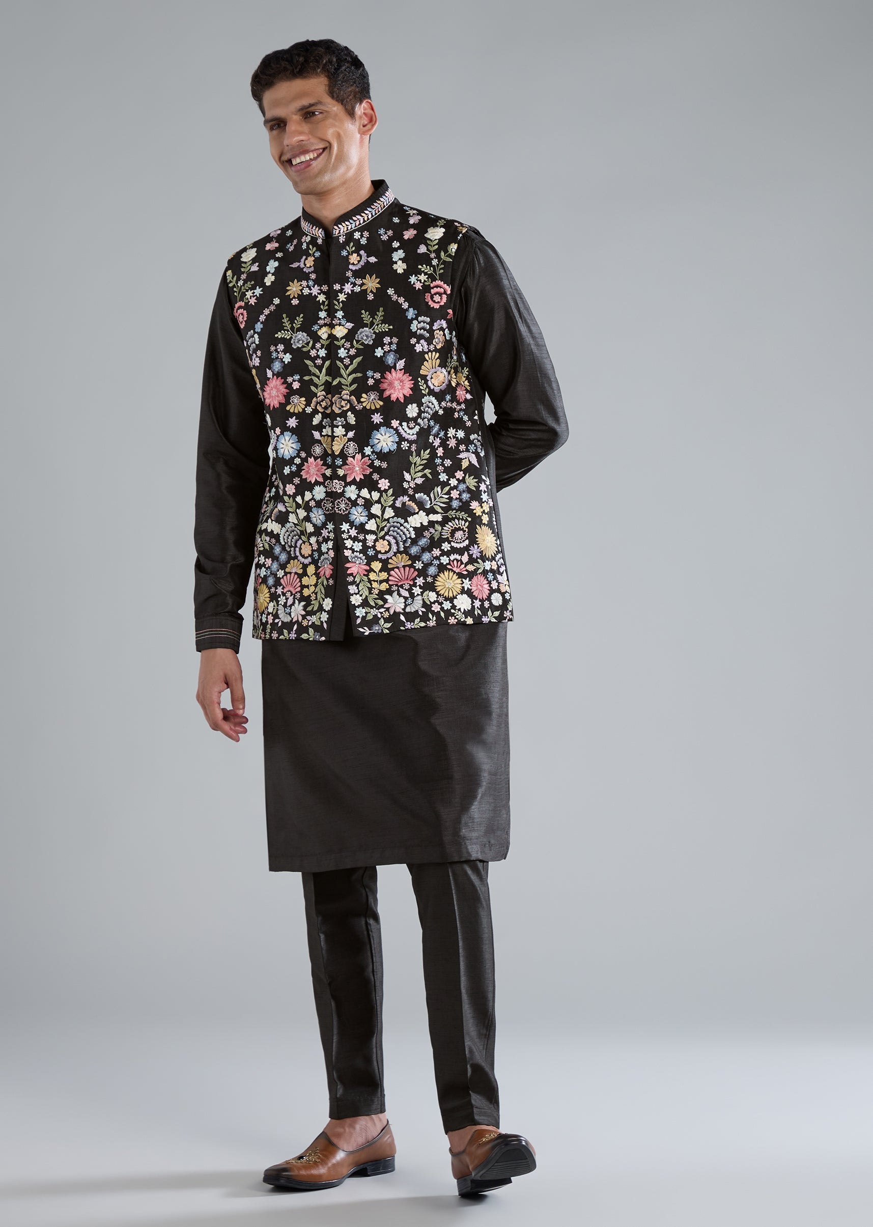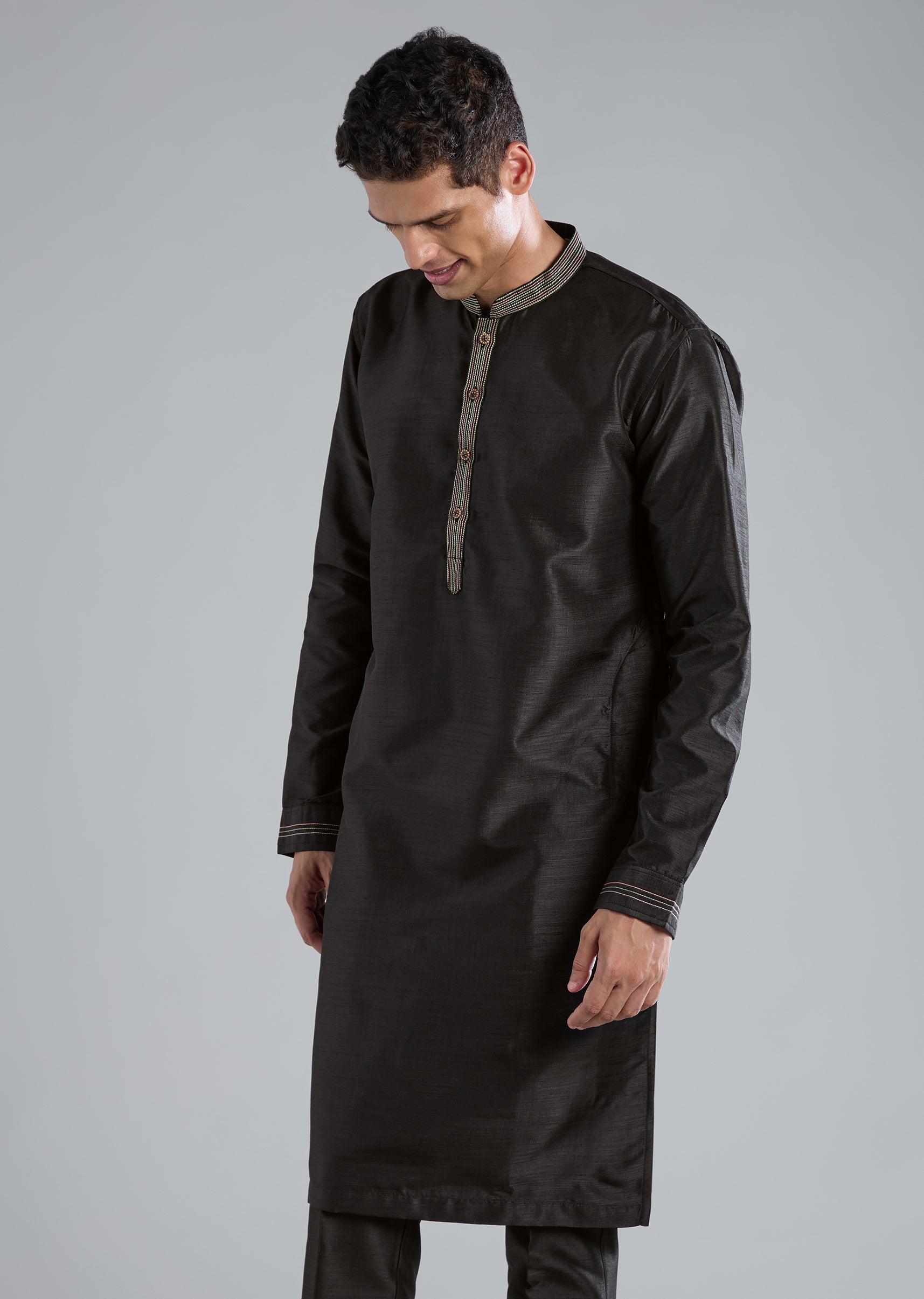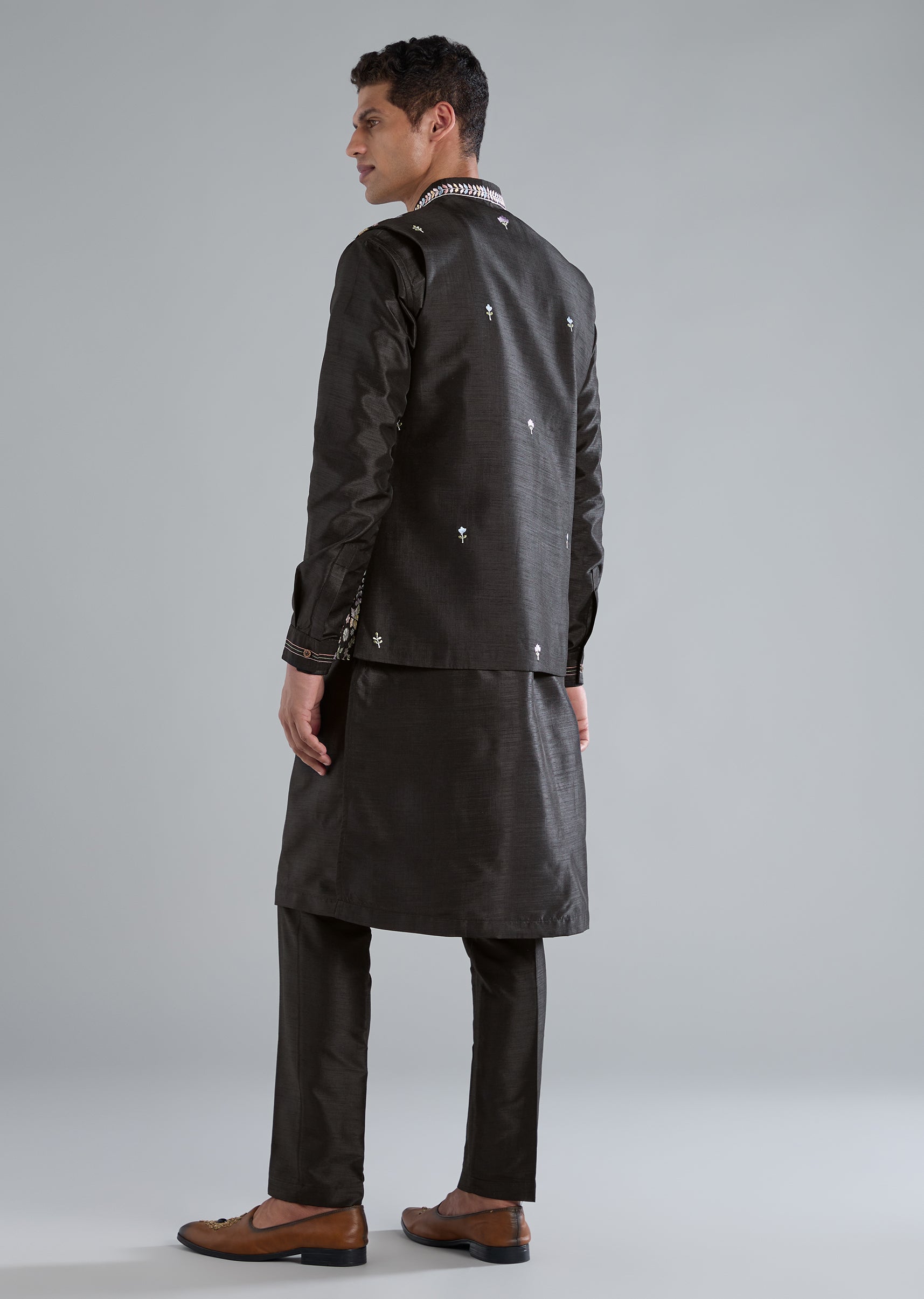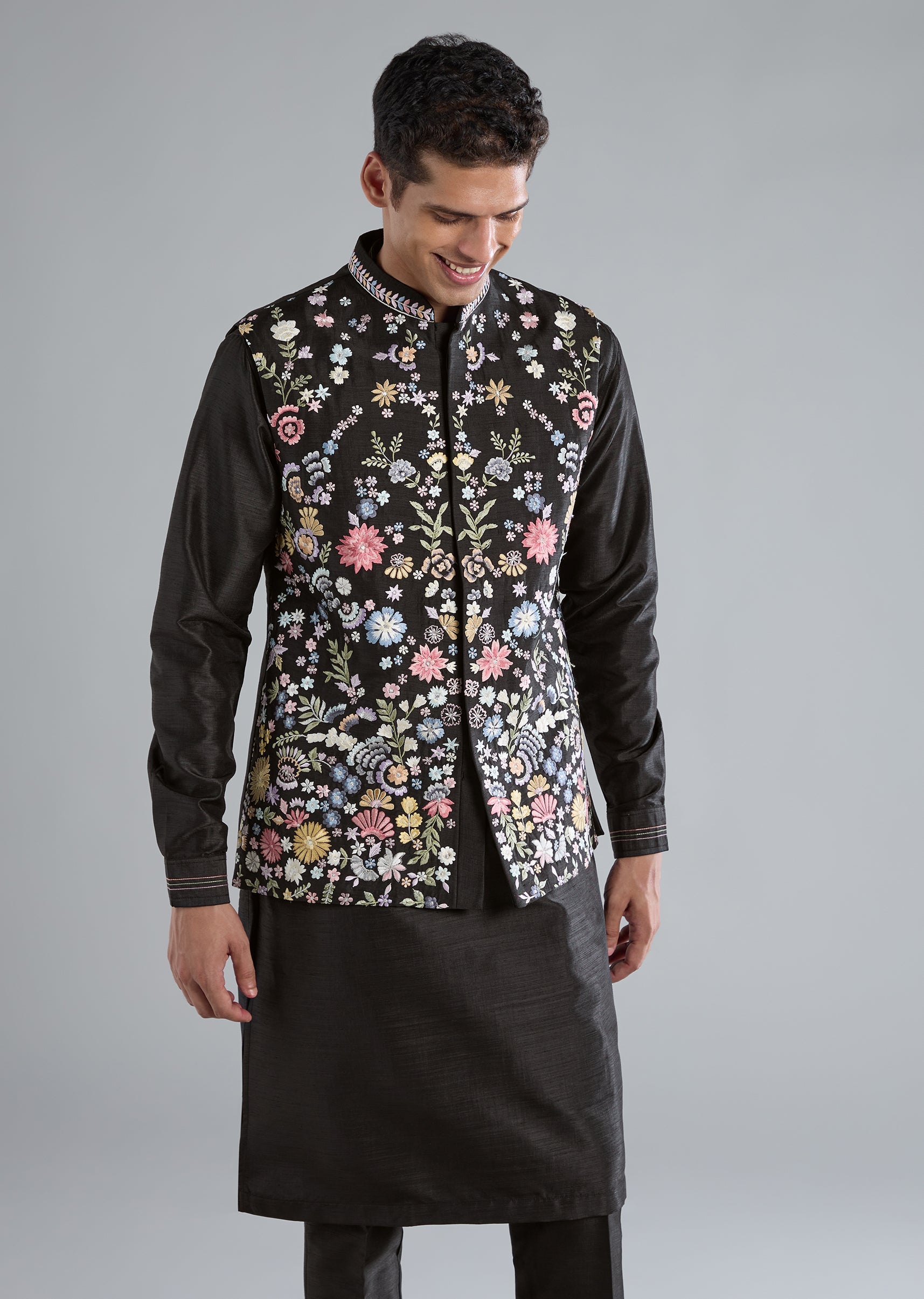 This black kurta jacket set is crafted in smooth silk and highlighted with refined thread resham work, giving it a sophisticated touch perfect for receptions, festive evenings, and wedding celebrations. It features full sleeves, a mandarin collar, a front hook eye top closure, and a matching hook eye bottom closure. The coordinated jacket, kurta, and pants come together to create an elegant and polished look. Awarded as the Most Trusted Brand, we're delivering styles you love, just as promised.