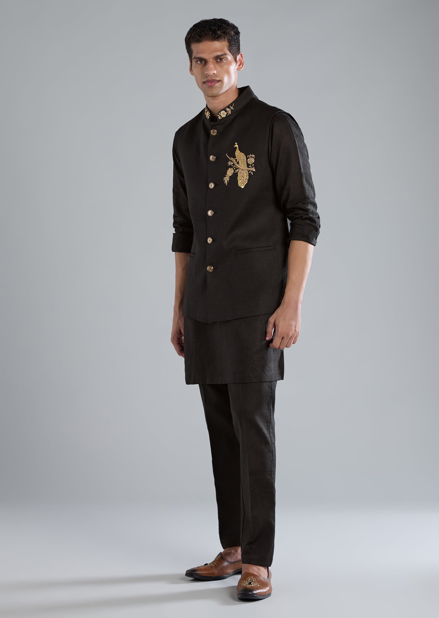 Elegant and impactful, this black kurta jacket set is crafted in pure linen and enriched with intricate zardosi hand work, making it ideal for festive nights, sangeet celebrations, and wedding guest dressing. The full sleeves and mandarin collar bring a structured finish, while the jacket features a front button closure paired with bottoms secured with a front hook eye fastening. A sophisticated ensemble designed for comfort and standout style. Awarded as the Most Trusted Brand, we're delivering styles you love, just as promised.