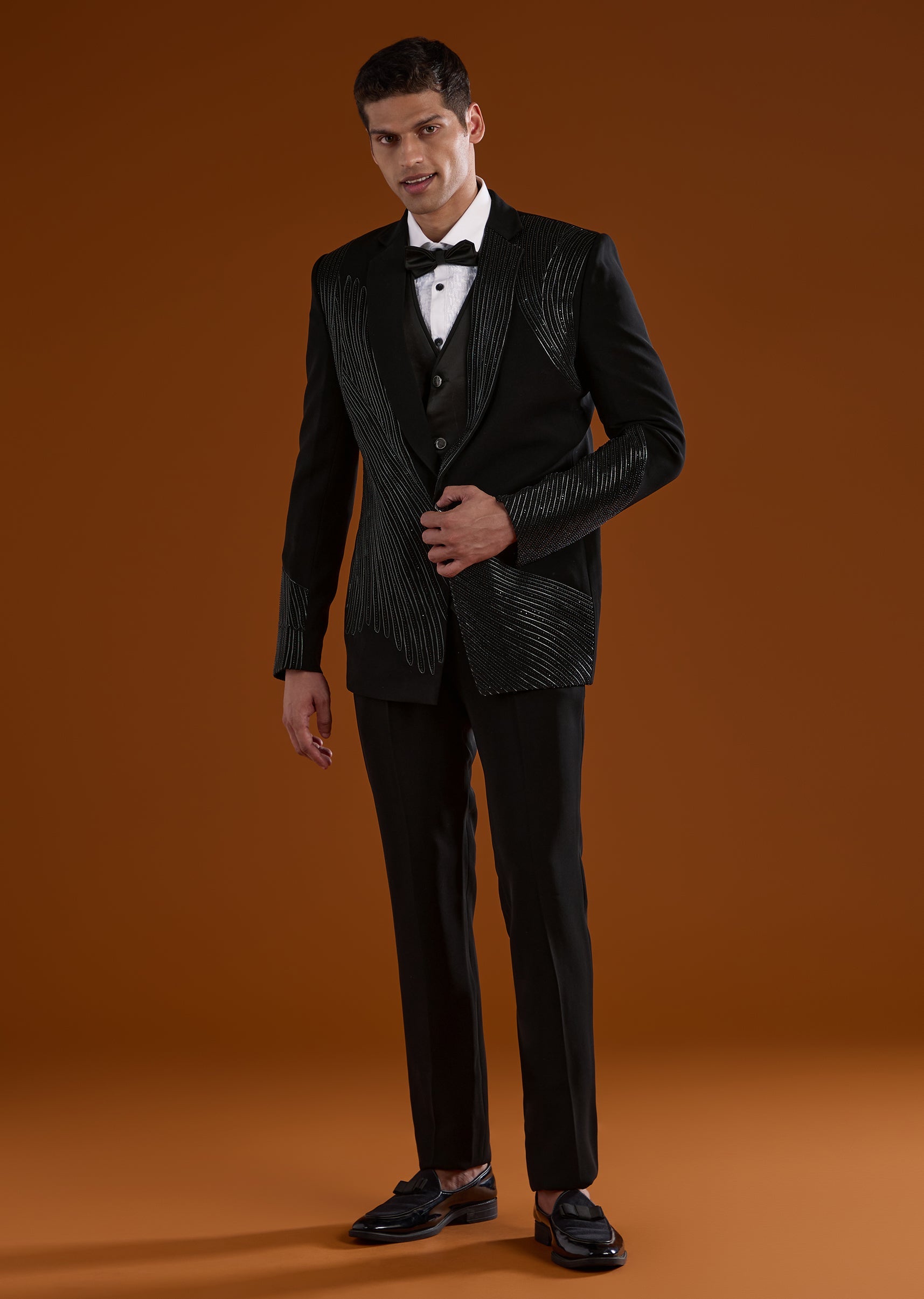 A sleek black tuxedo crafted for reception and cocktail celebrations, ideal for groomsmen. Enhanced with intricate Dori work and subtle leather accents, it delivers a modern festive appeal with a structured silhouette. The full sleeves and mandarin collar ensure a polished and elegant look suitable for evening wedding occasions. Awarded as the Most Trusted Brand, we're delivering styles you love, just as promised.
