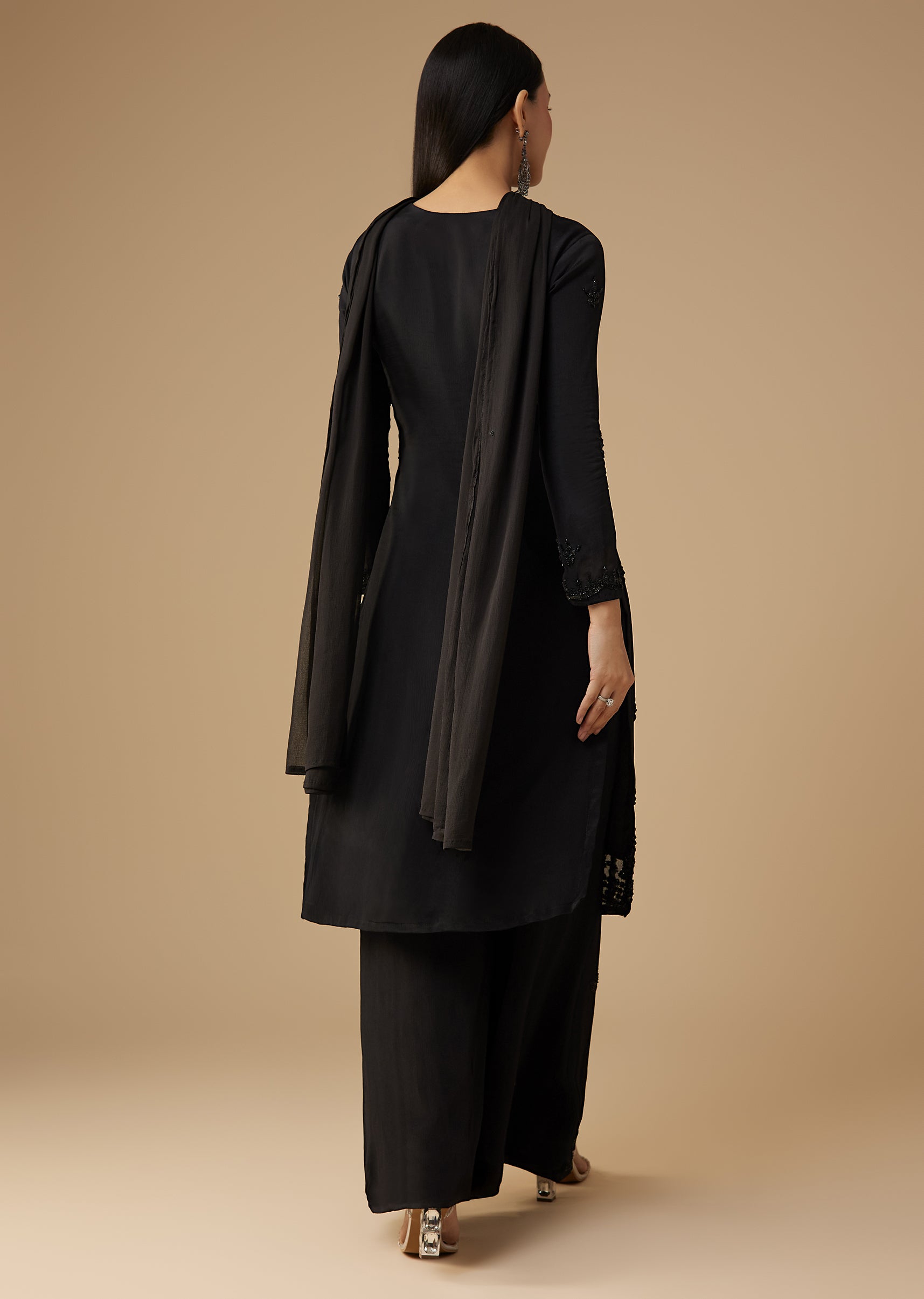 Make a refined statement with this black chinnon kurta set, embellished with moti, sequin, and cutdana work that adds a rich festive shimmer. The soft chinnon fabric offers a graceful... More Product Details