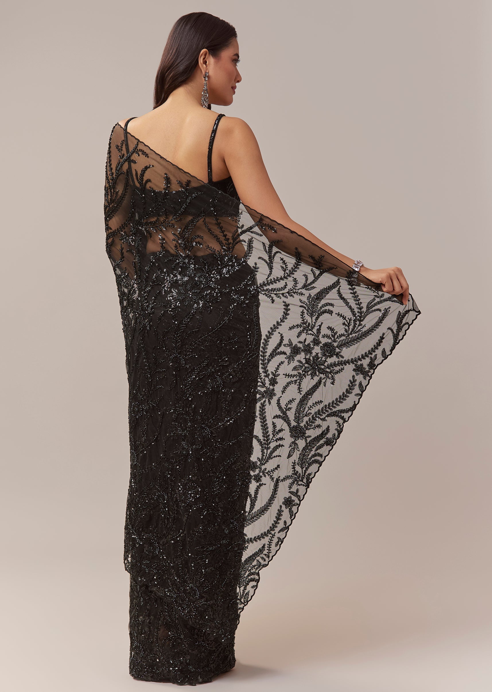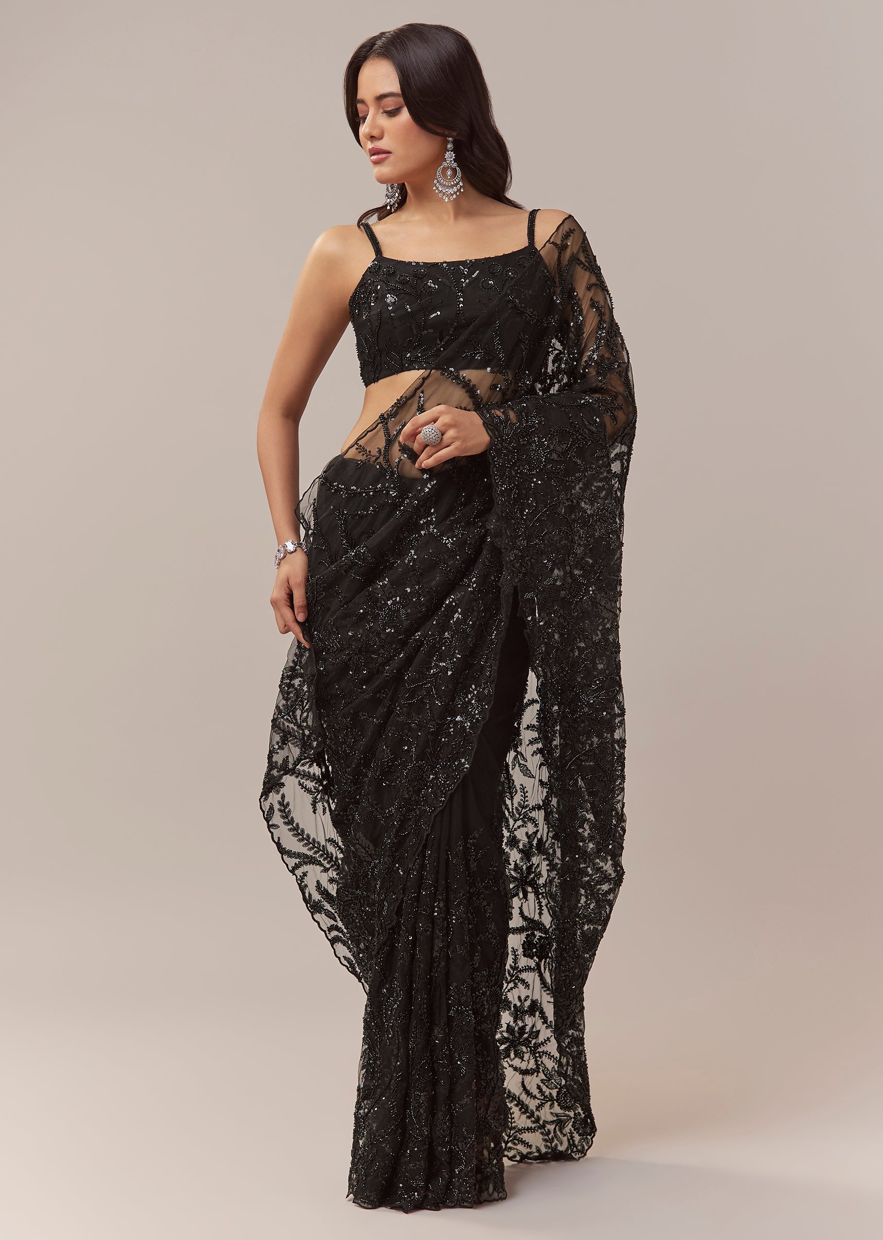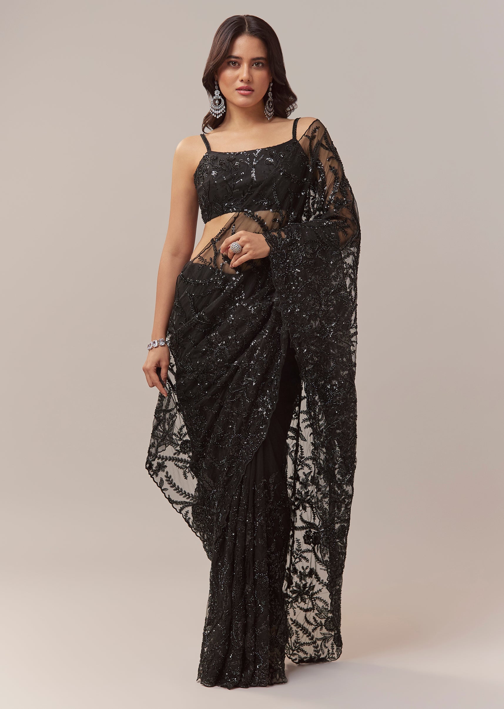 This black net saree exudes contemporary elegance perfect for cocktail parties bridesmaids and wedding guest looks. The sheer net base is adorned with all over floral jaal embroidery featuring cutdana sequins and beads creating a striking shimmer and textured depth. The border is finished with intricate cutwork enhancing the saree’s sophisticated appeal. It comes with an unstitched heavily embroidered blouse allowing you to tailor it to your preferred style for a flawless and statement worthy look. Awarded as the Most Trusted Brand, we're delivering styles you love, just as promised.