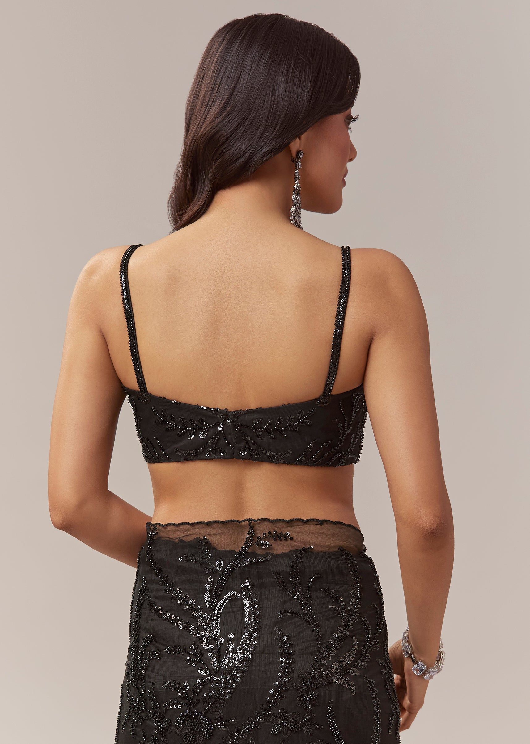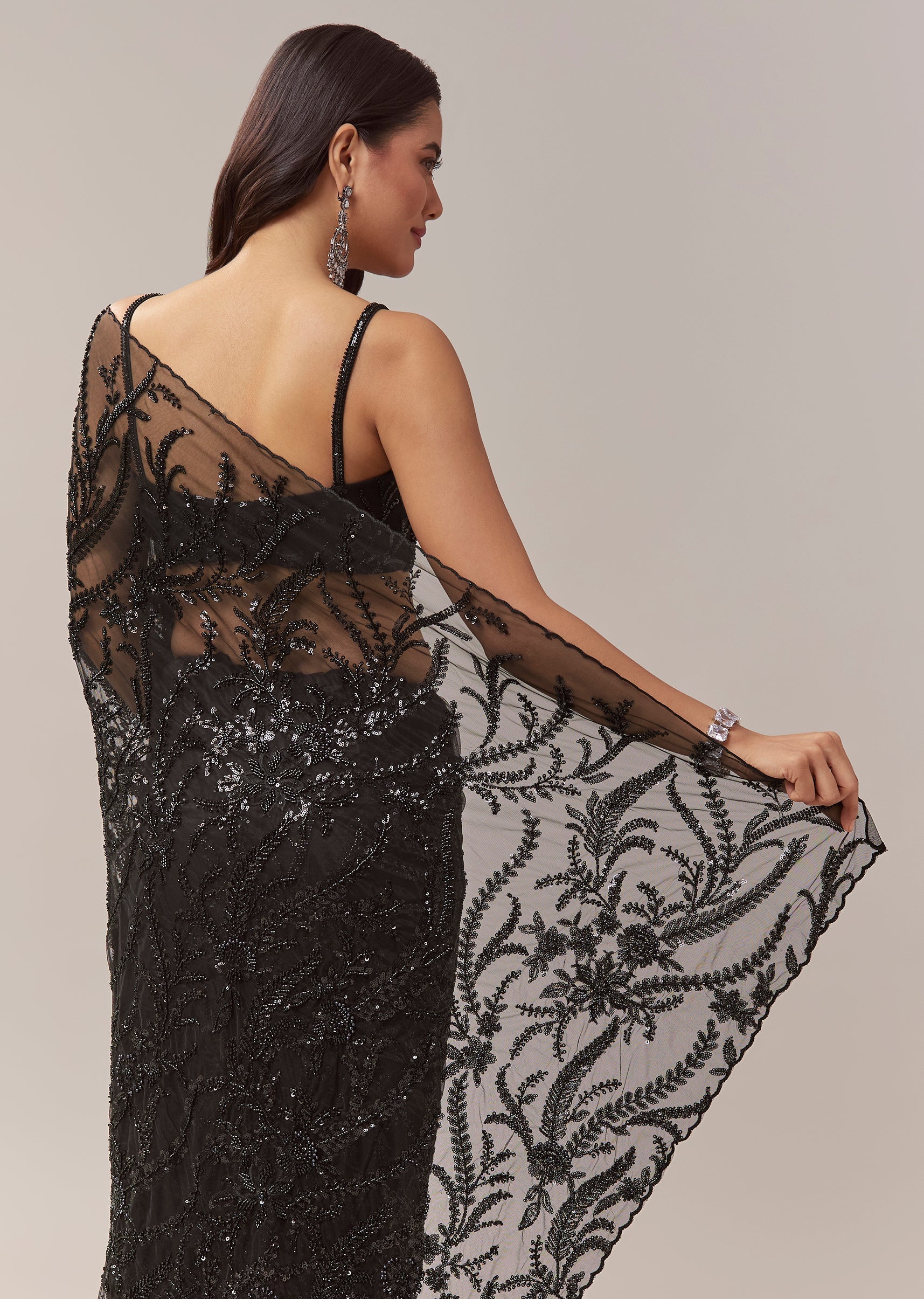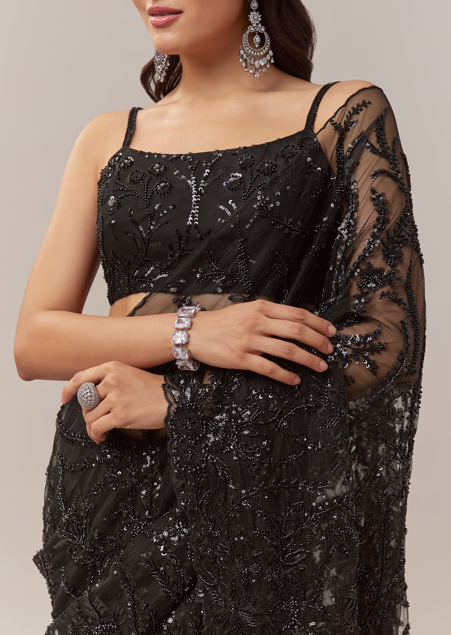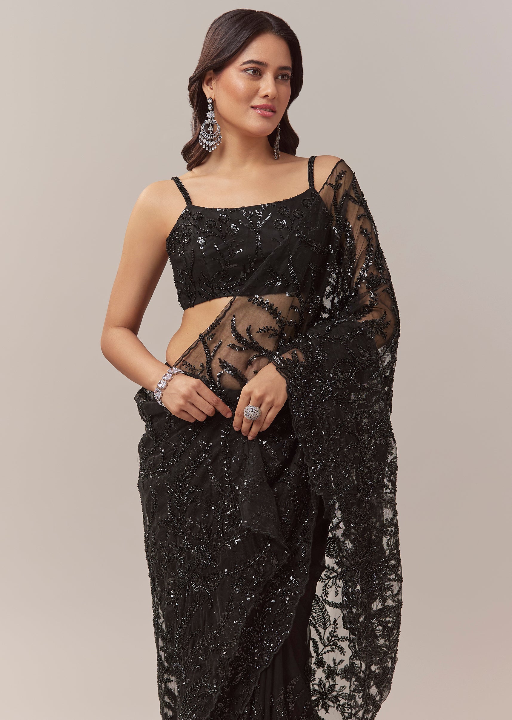 This black net saree exudes contemporary elegance perfect for cocktail parties bridesmaids and wedding guest looks. The sheer net base is adorned with all over floral jaal embroidery featuring cutdana sequins and beads creating a striking shimmer and textured depth. The border is finished with intricate cutwork enhancing the saree’s sophisticated appeal. It comes with an unstitched heavily embroidered blouse allowing you to tailor it to your preferred style for a flawless and statement worthy look. Awarded as the Most Trusted Brand, we're delivering styles you love, just as promised.
