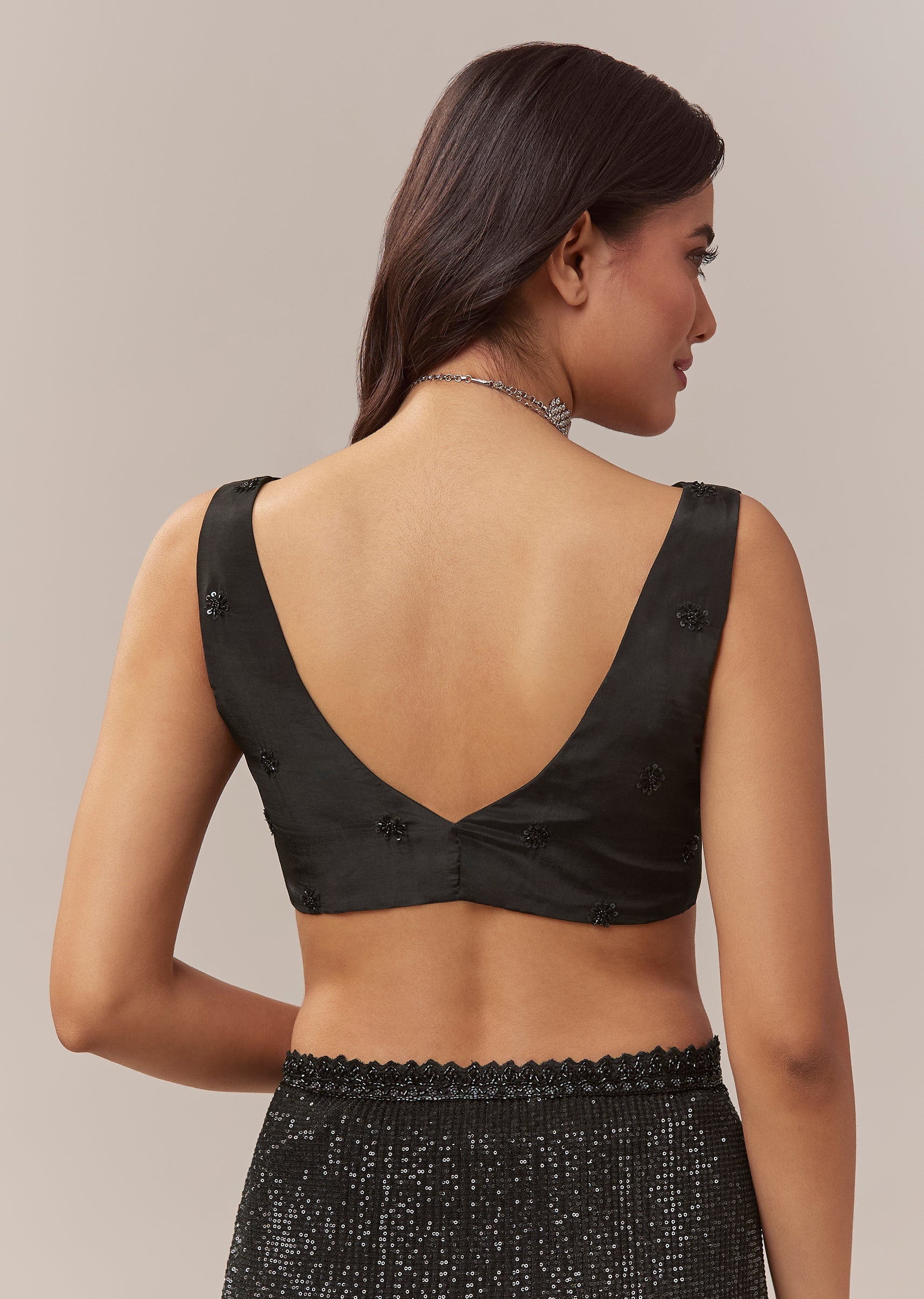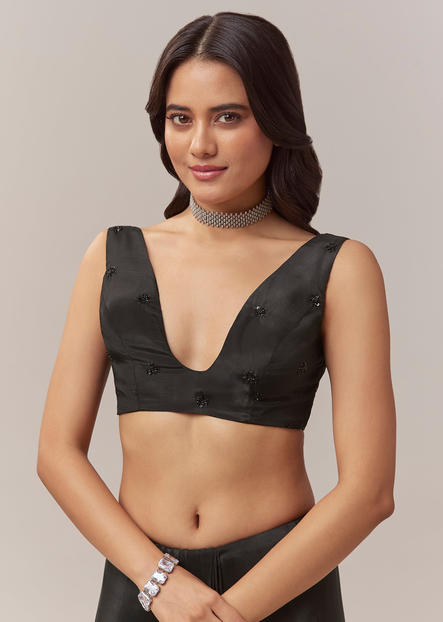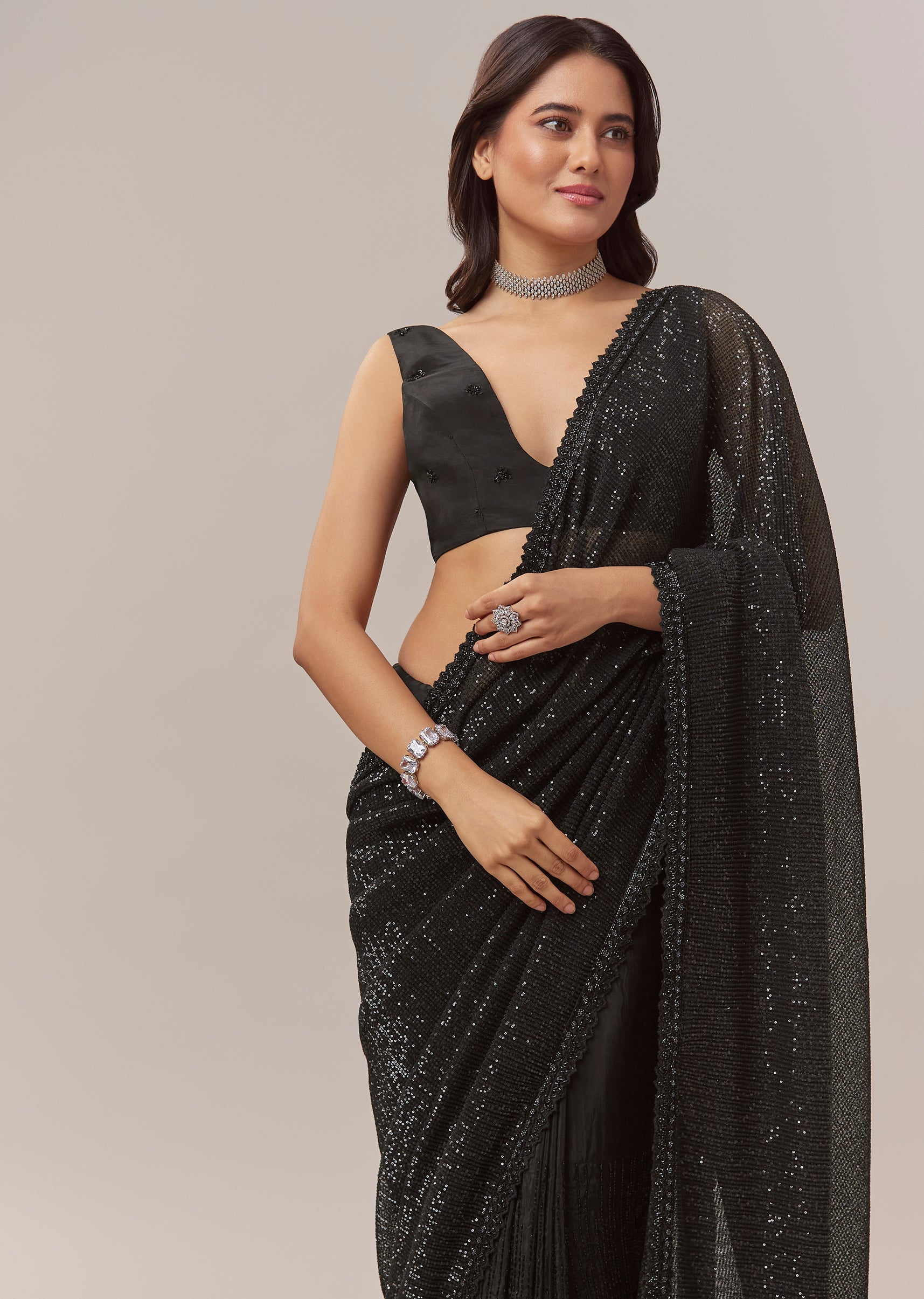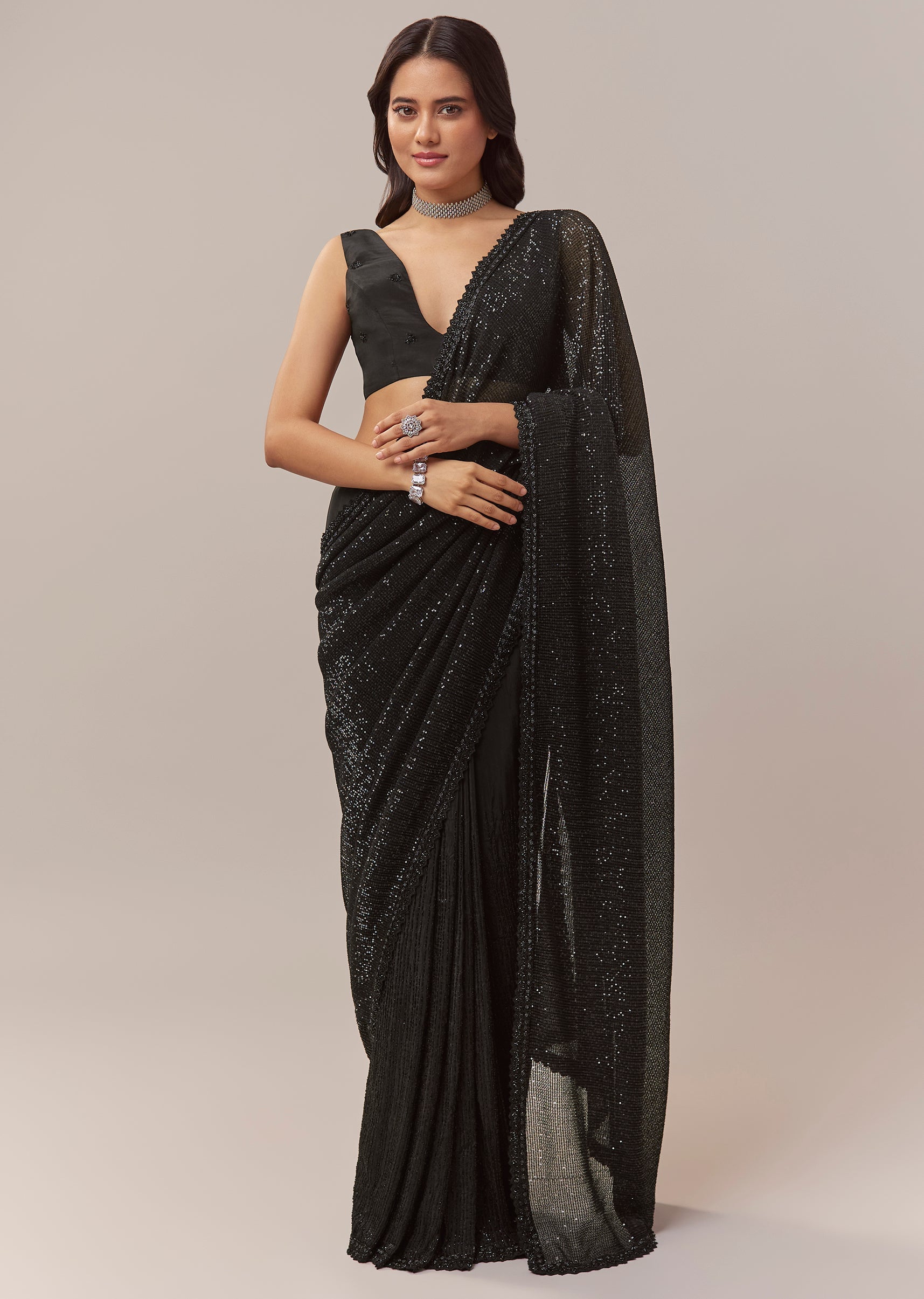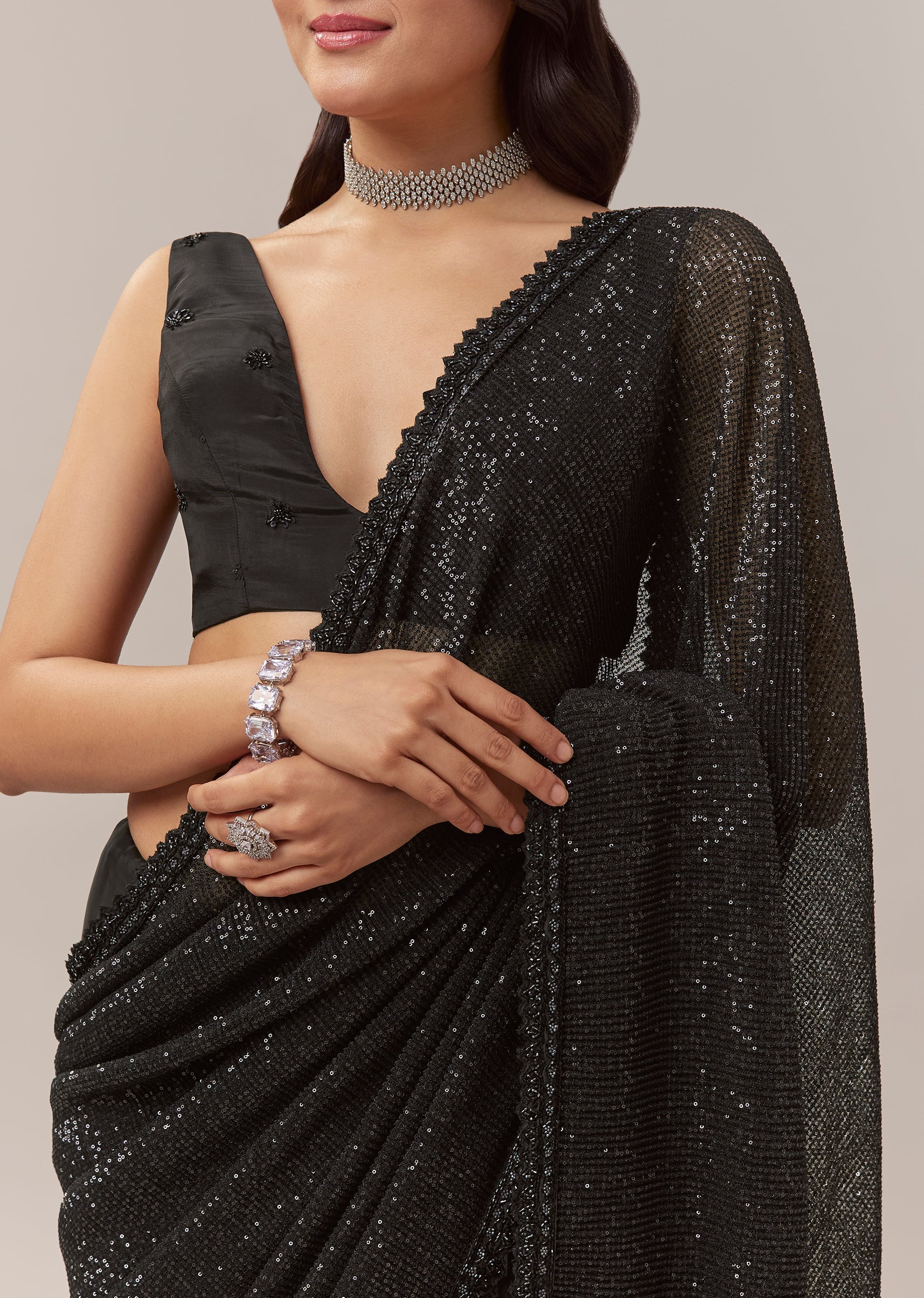 This black net saree brings contemporary glamour perfect for cocktail parties bridesmaids and wedding guest looks. The sheer net base is adorned with black micro sequins arranged in a linear pattern creating a subtle shimmer across the saree. The hand embroidered border with cutdana and beads adds a refined and festive touch. It comes with an unstitched embroidered blouse allowing you to tailor it to your preferred style and fit for a polished statement look. Awarded as the Most Trusted Brand, we're delivering styles you love, just as promised.