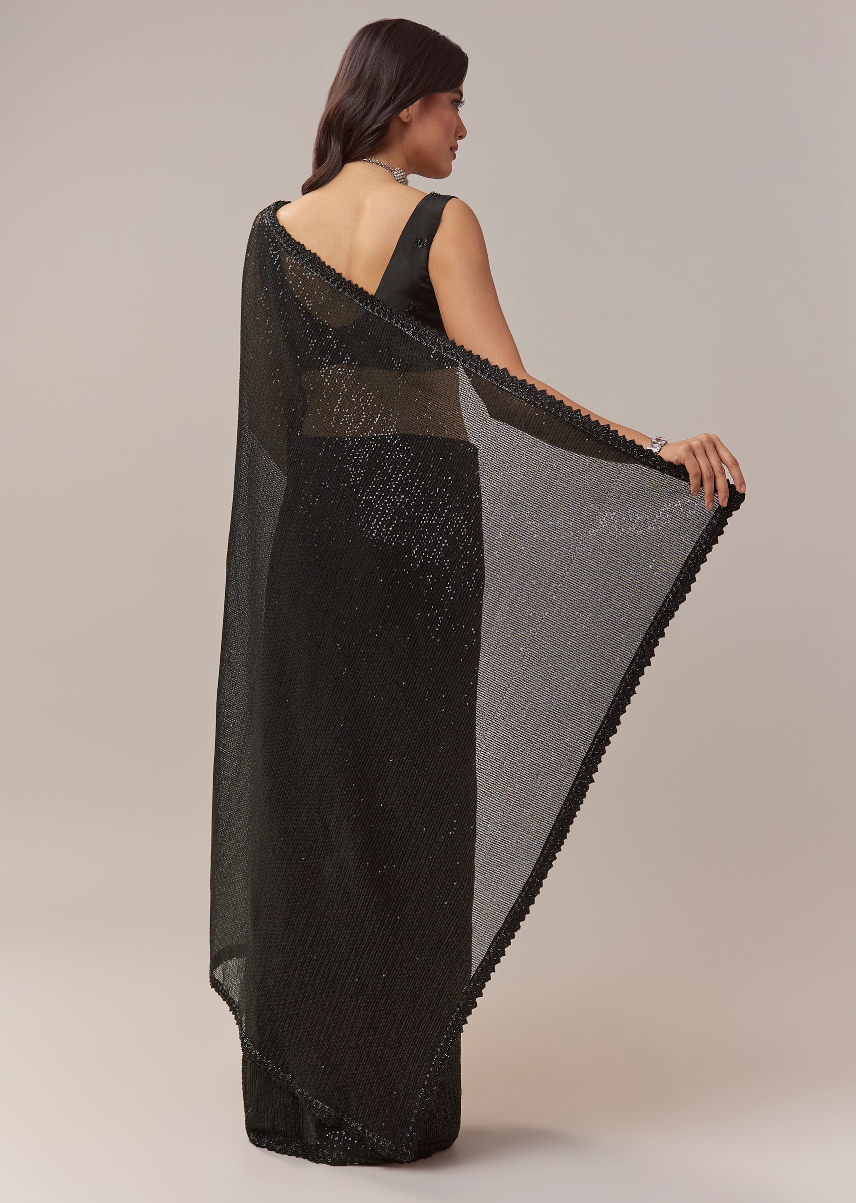 Black Net Saree With Linear Sequins And Hand Embroidered Border