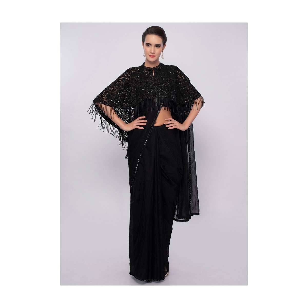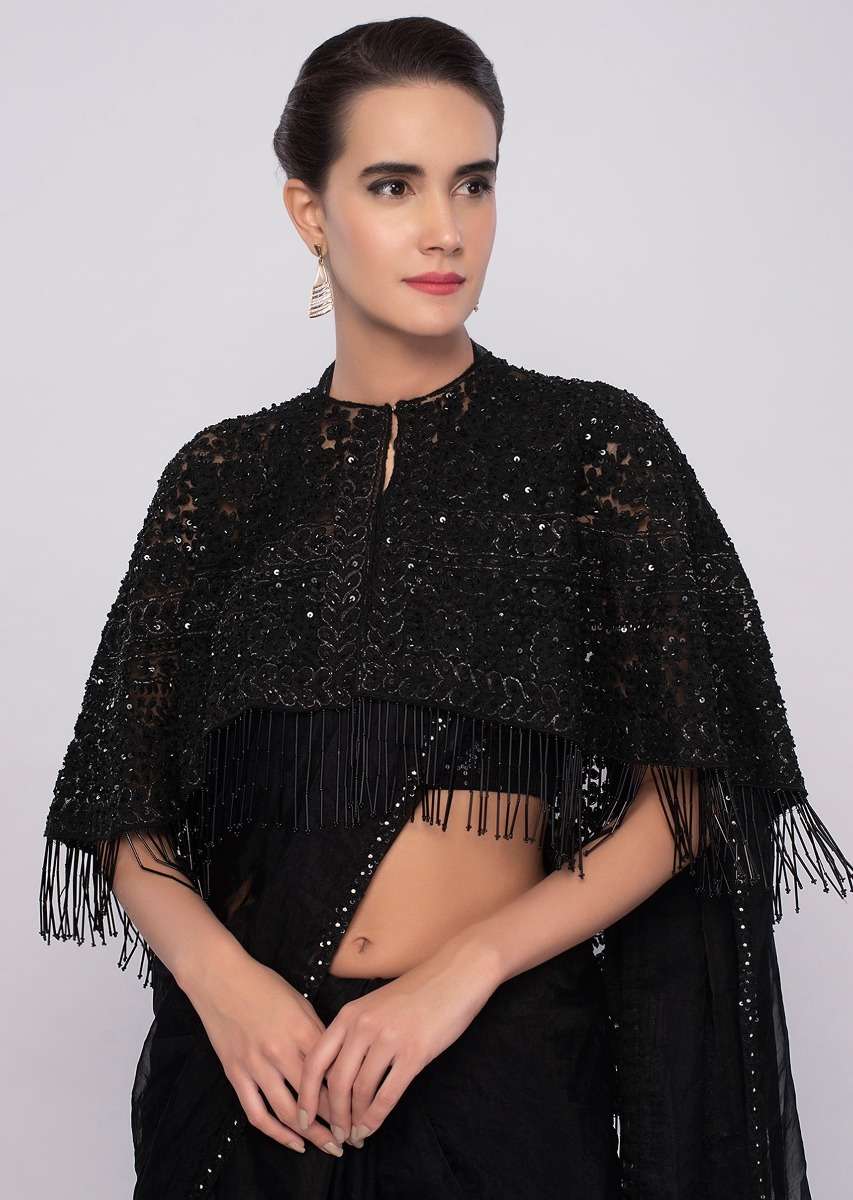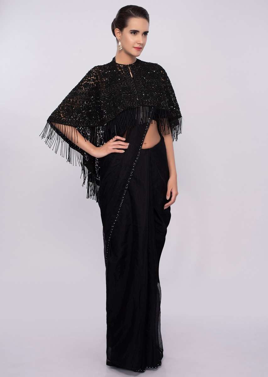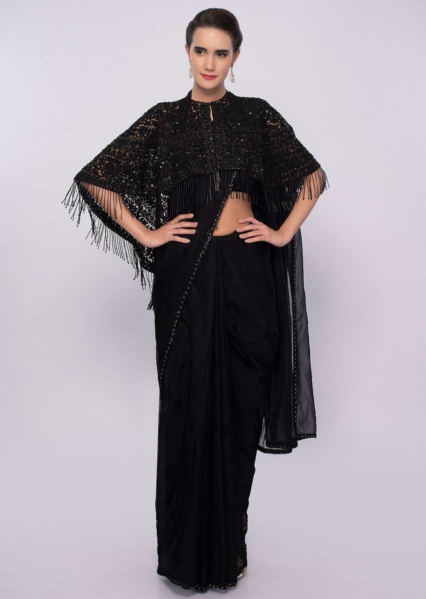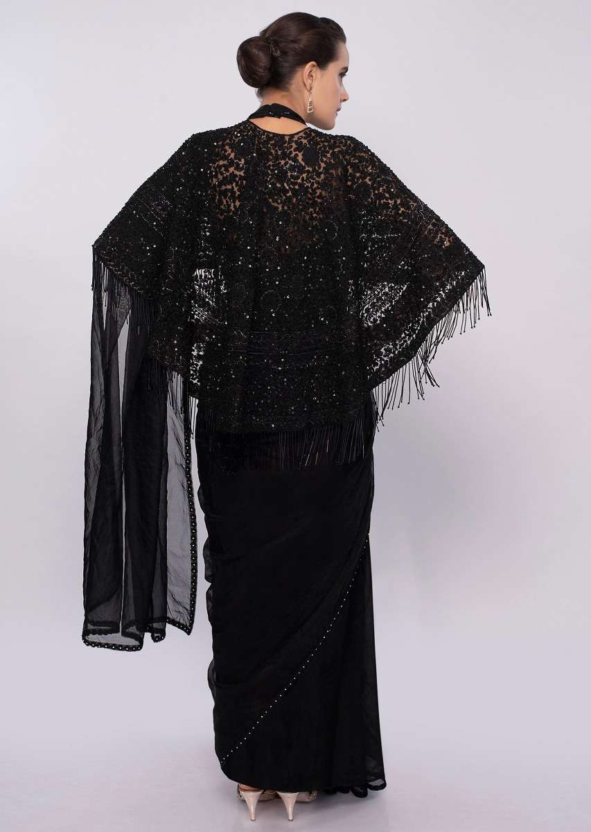 Black Organza Saree With Net Embroidered Cape Online - Kalki Fashion