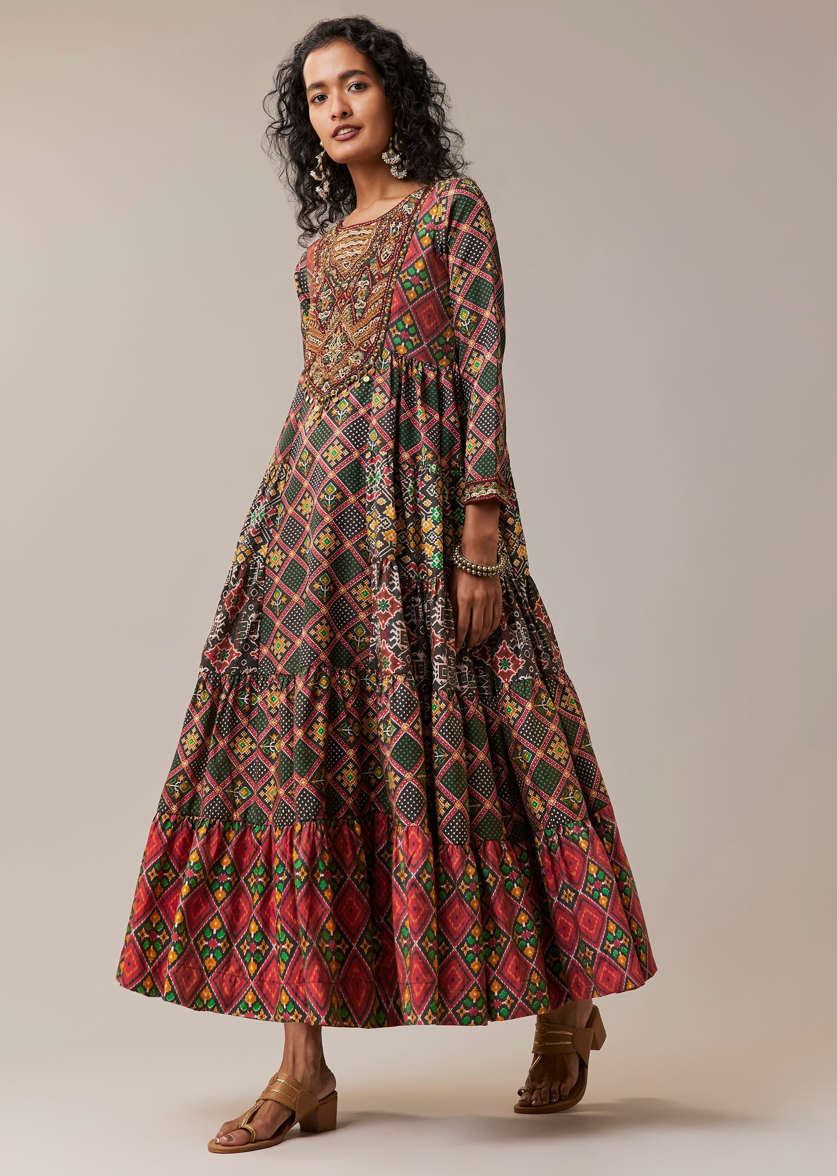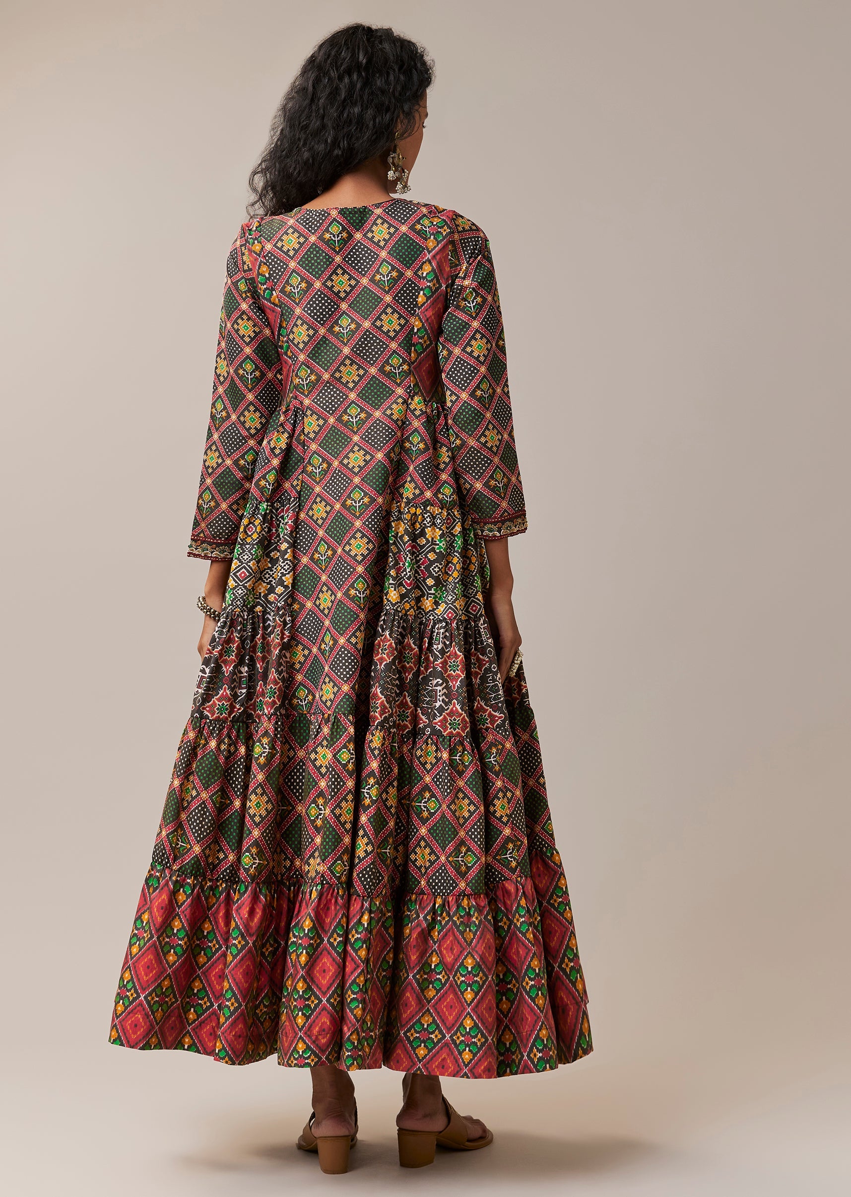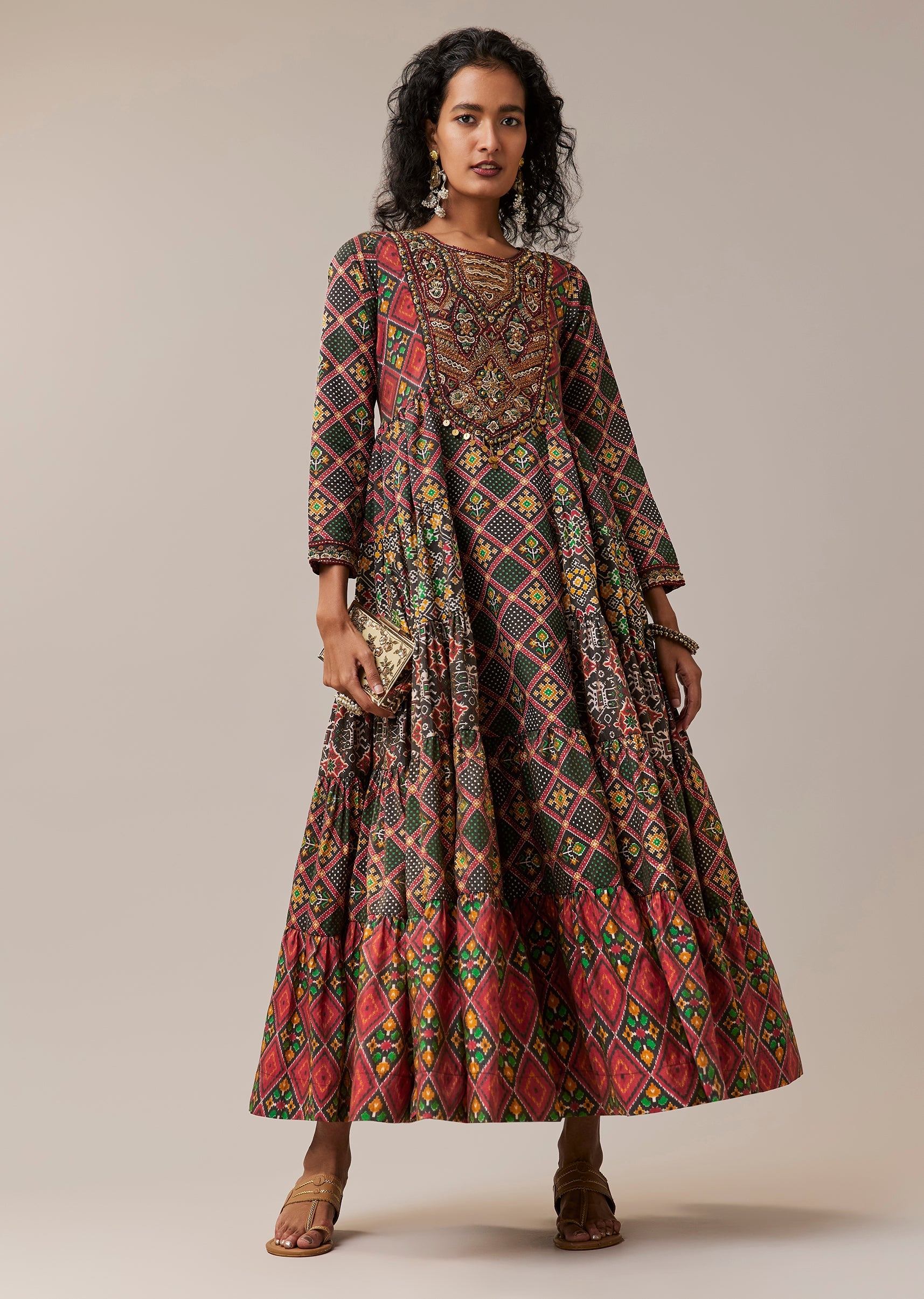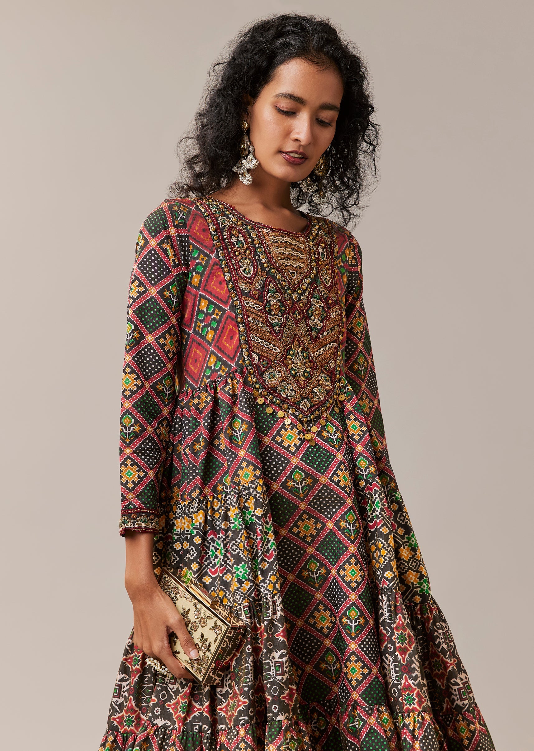 Style with oxidised or gold toned earrings and comfortable juttis or block heels, keeping accessories minimal to let the Patola print stand out.