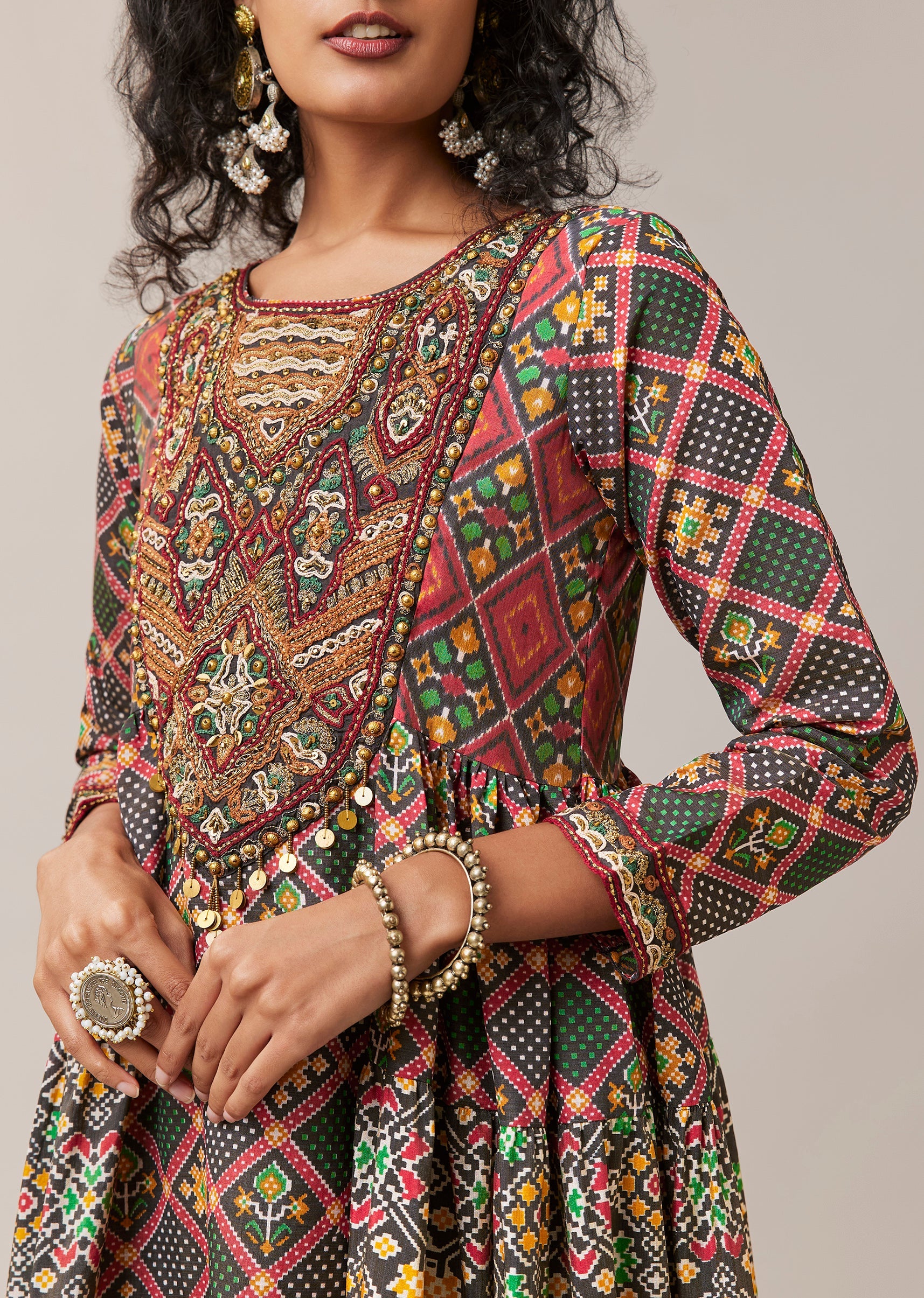 Rich in cultural character, this Patola print long kurti is a timeless addition to festive and everyday ethnic wear. Crafted in silk, it features delicate thread and resham work that subtly enhances the vibrancy of the traditional Patola pattern. The round neckline and 3/4th sleeves keep the silhouette classic and versatile, while the elongated cut adds graceful movement. Ideal for festive gatherings, cultural events, and elegant daywear. Awarded as the Most Trusted Brand, we're delivering styles you love, just as promised.