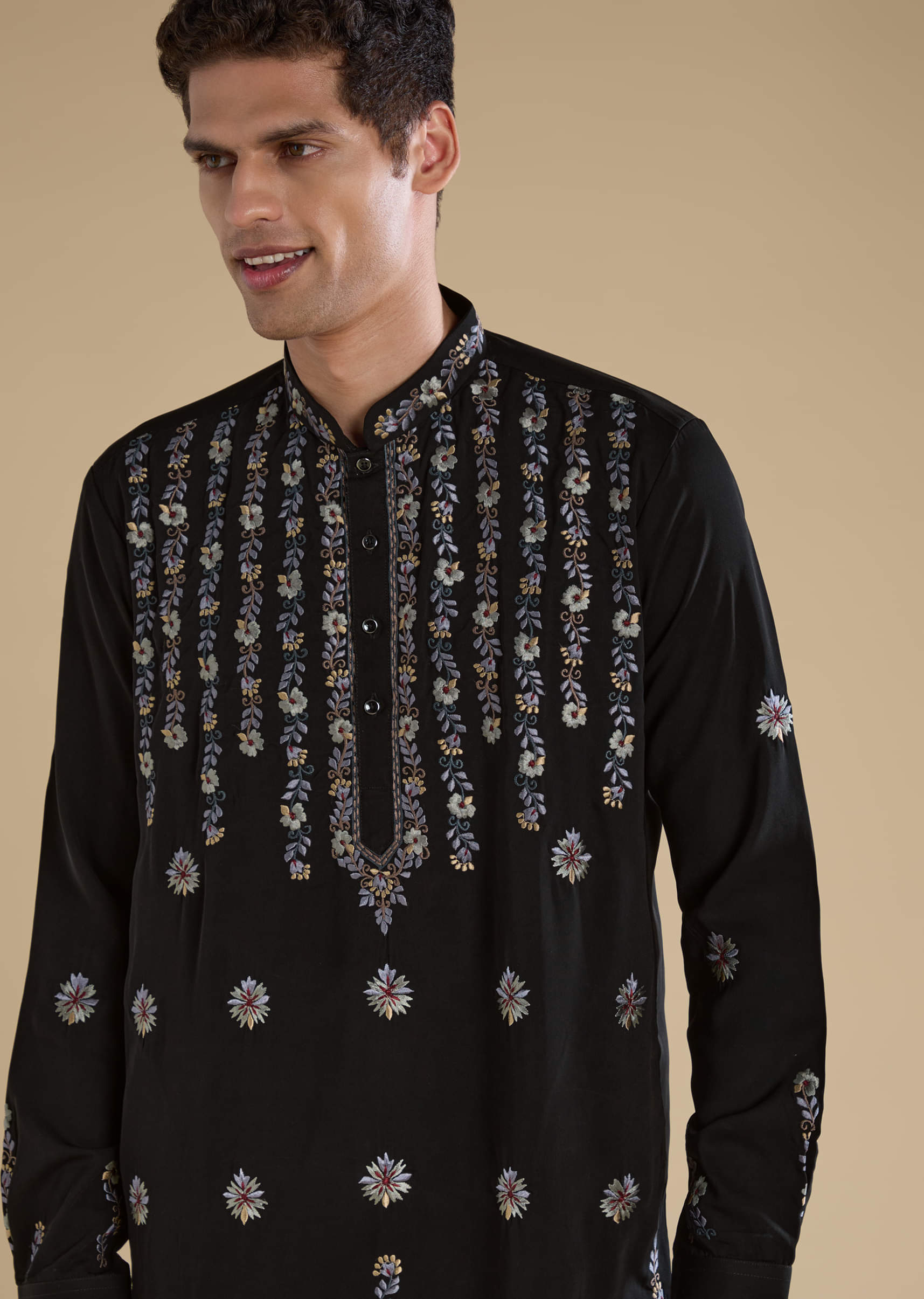 Black Resham Work Straight Mens Kurta and Pant Set
