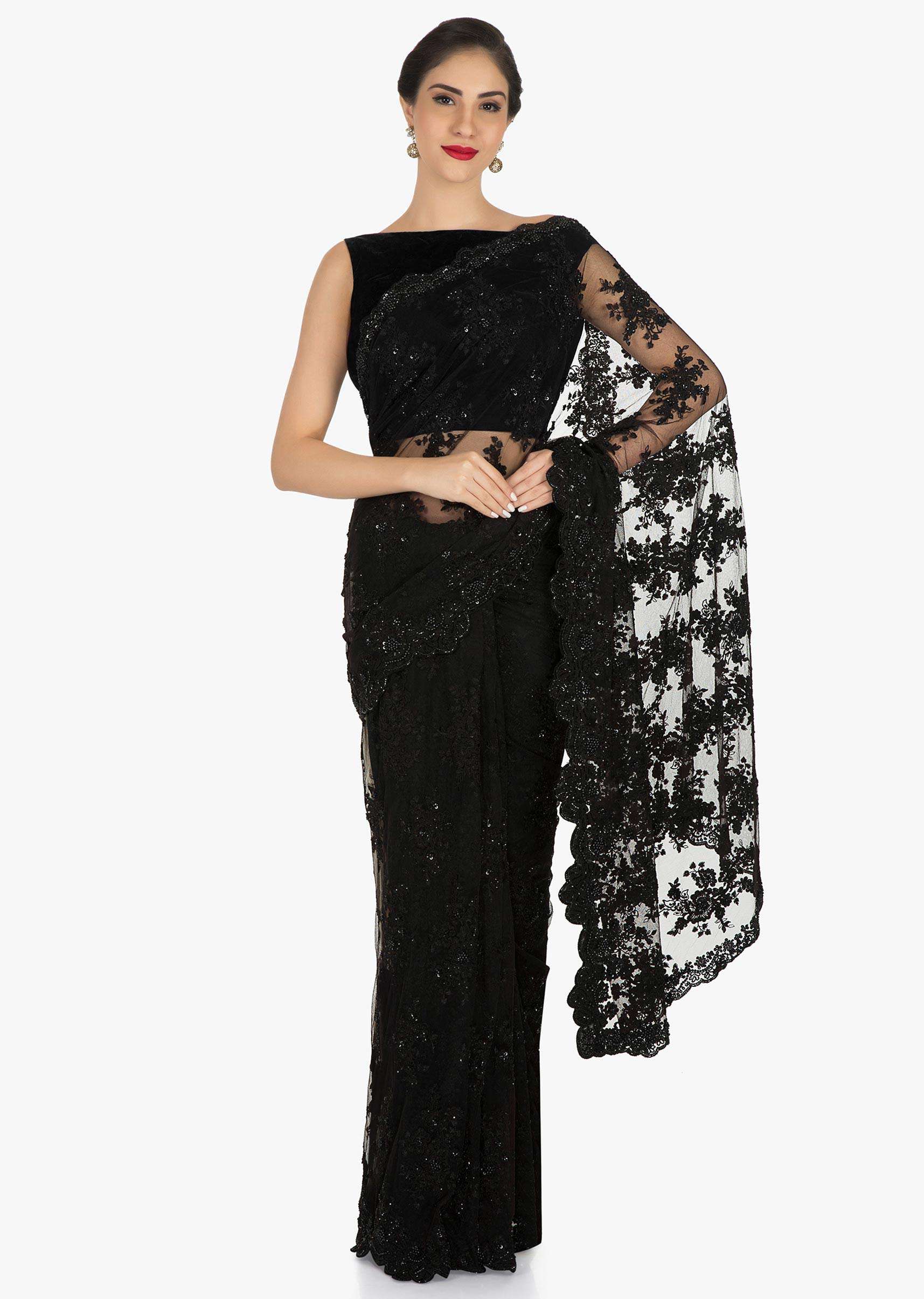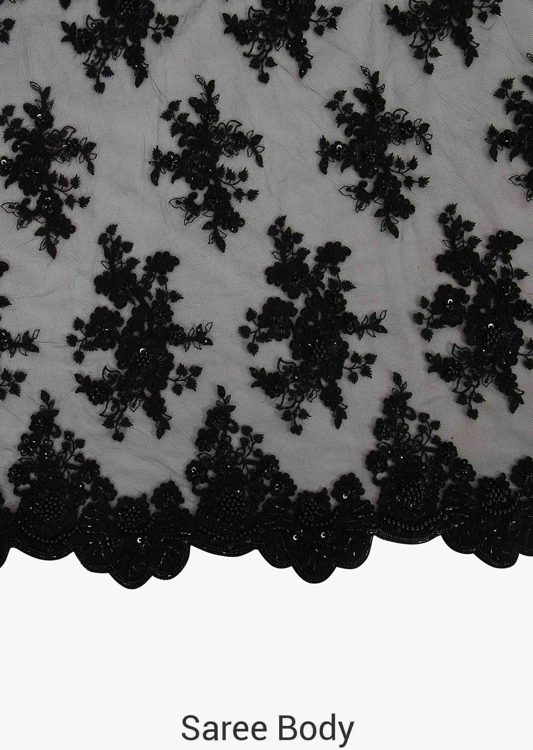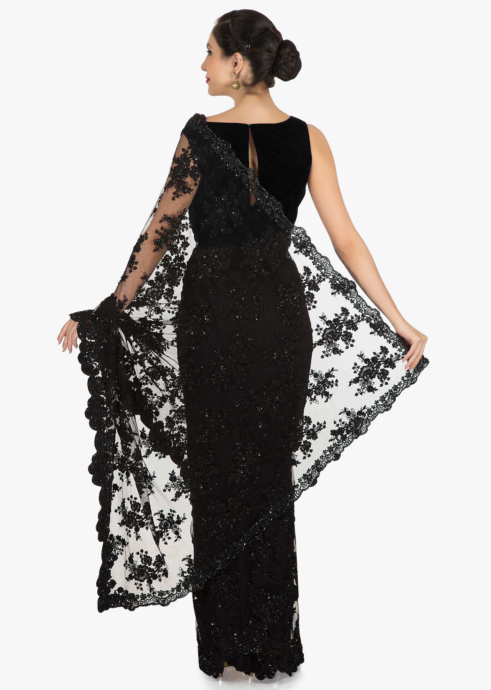 Black Saree In Embroidered Net Beautified In Floral Motifs With Resham And Moti Work Online - Kalki Fashion