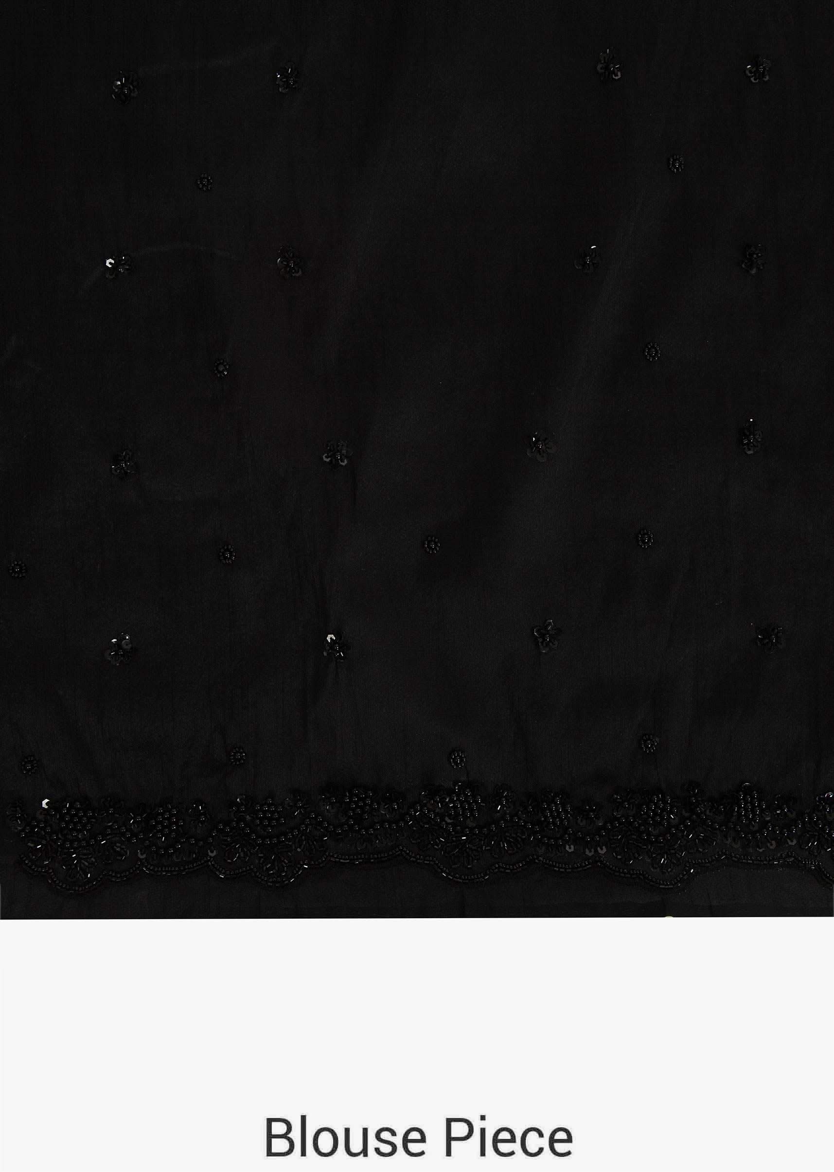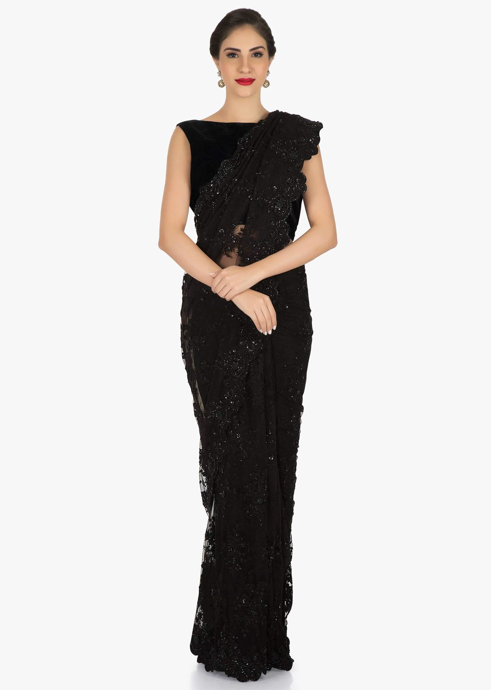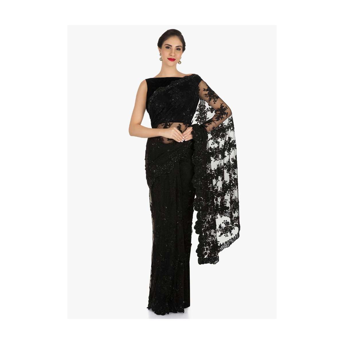 Black Saree In Embroidered Net Beautified In Floral Motifs With Resham And Moti Work Online - Kalki Fashion