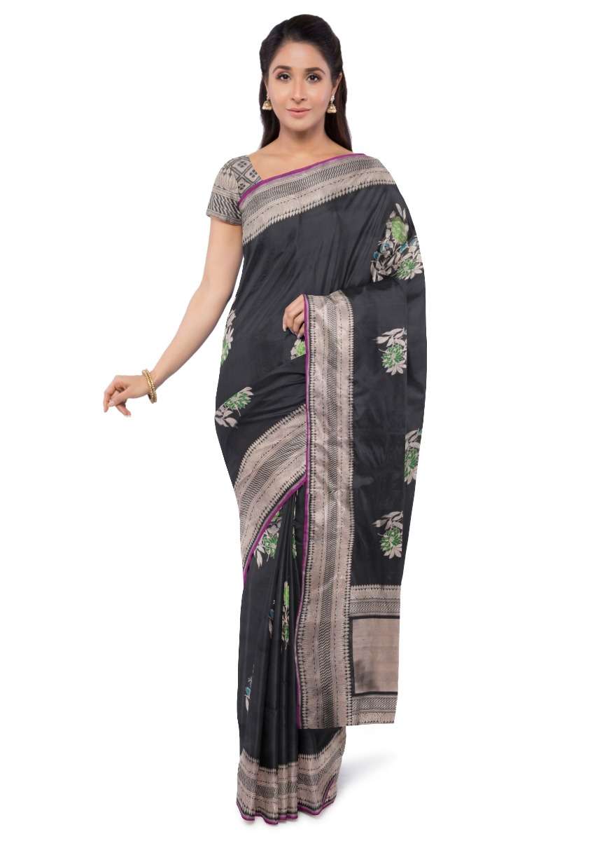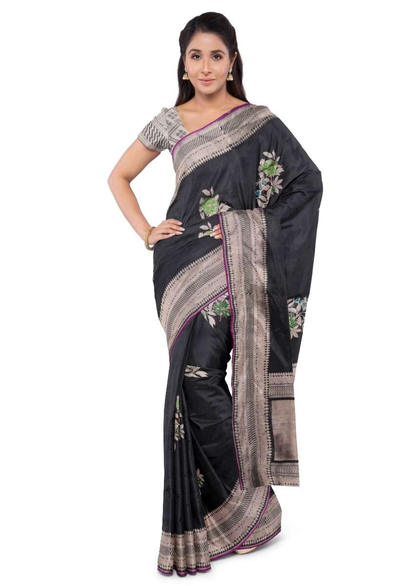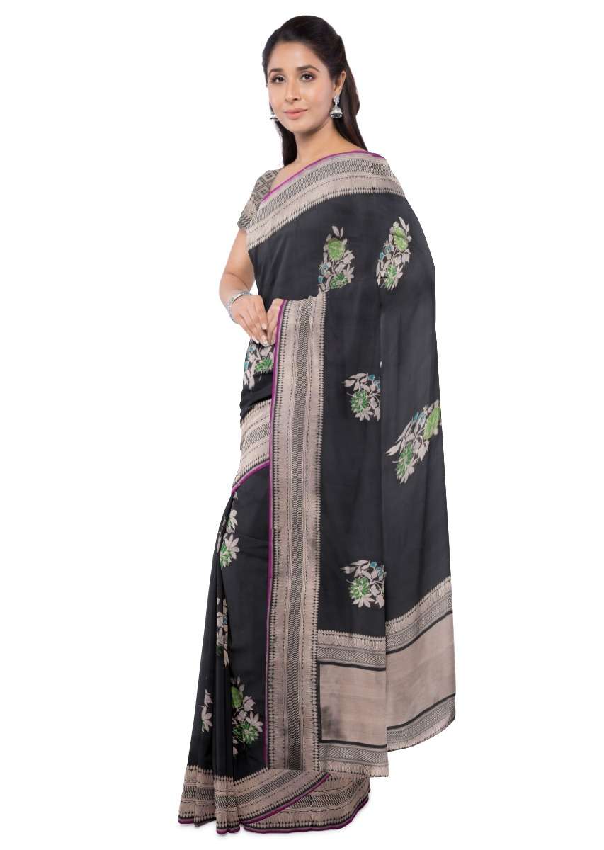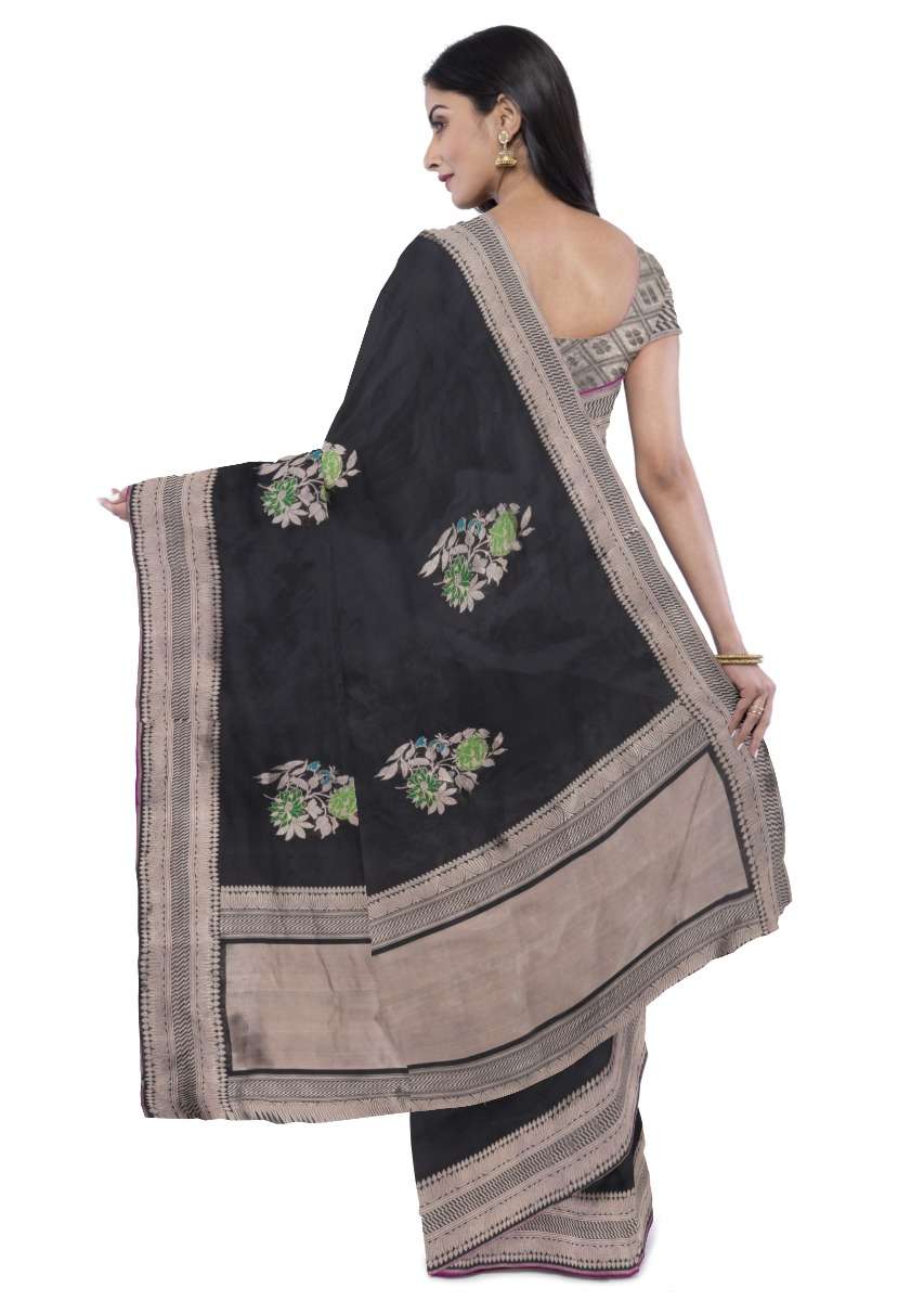 Black Saree In Jacquard Chanderi Silk With Matching Blouse Piece Online - Kalki Fashion