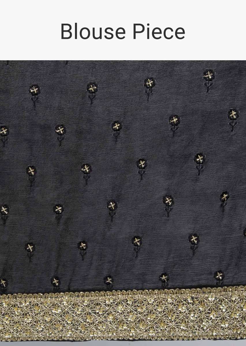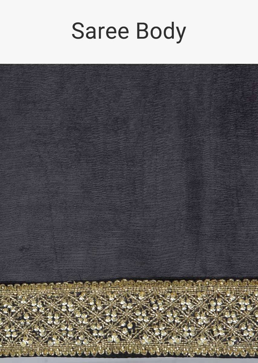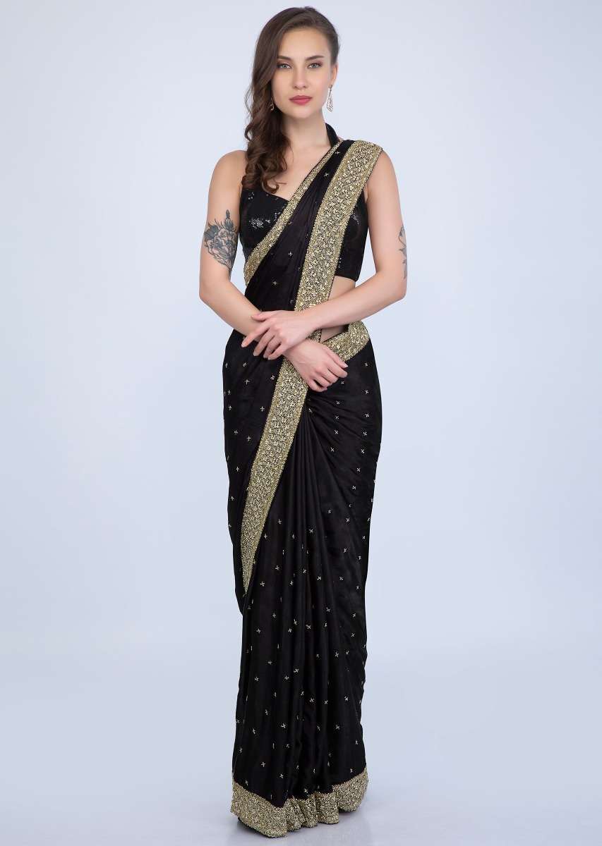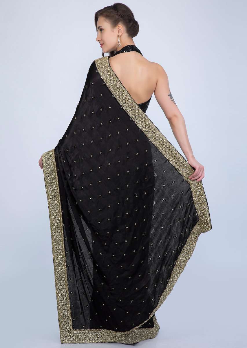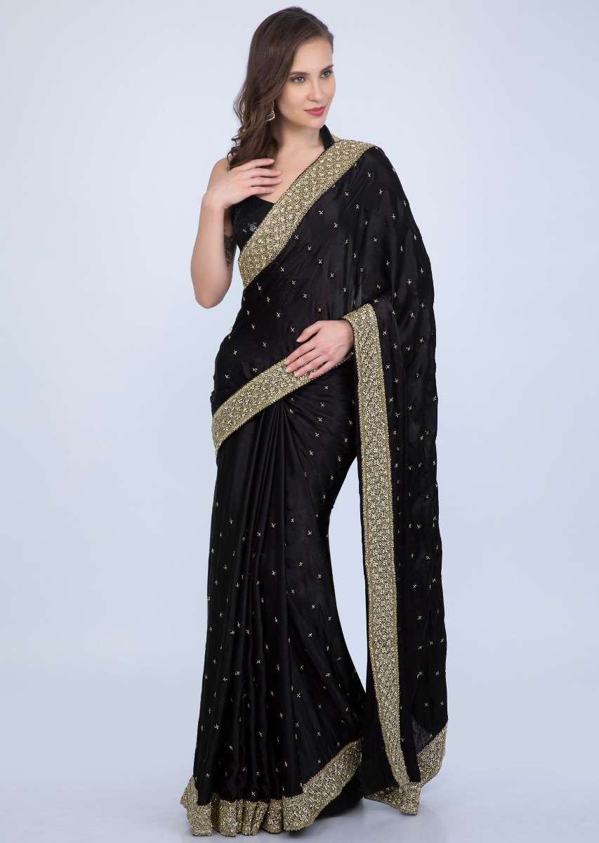 Black Saree In Satin Chiffon With Golden Cut Dana And Sequins Embroidered Border Online - Kalki Fashion