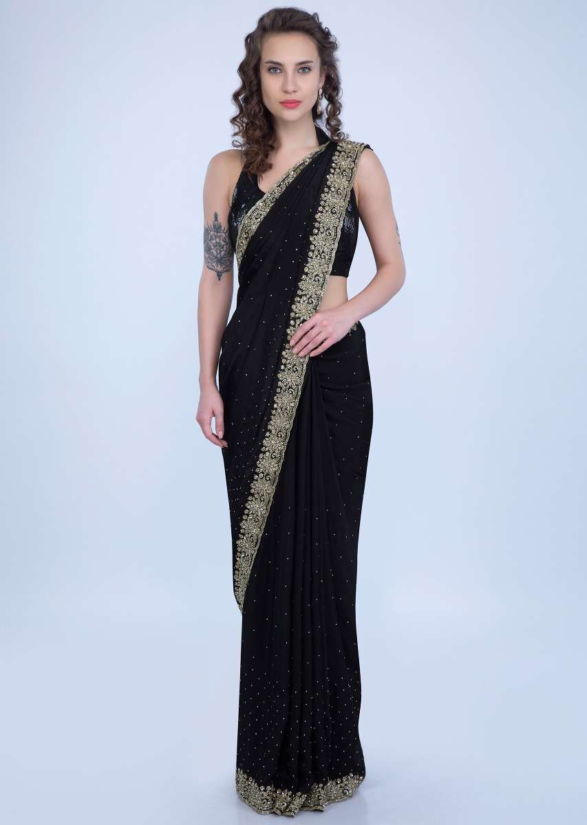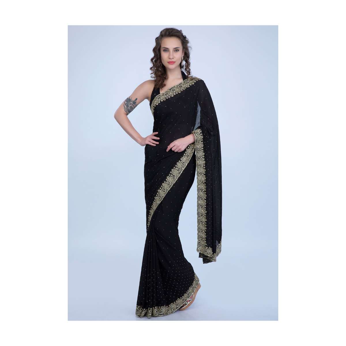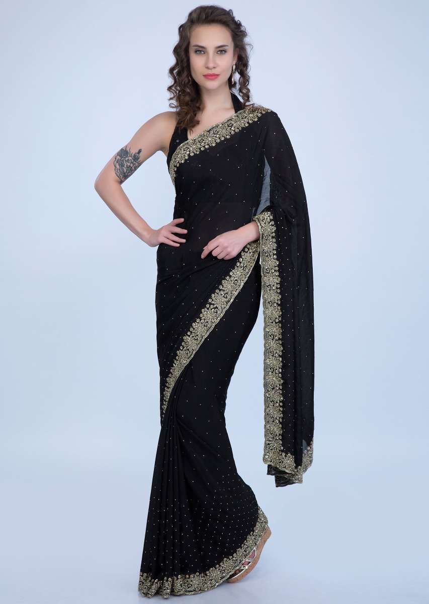 Black Satin Saree In Chiffon With Heavy Floral Embroidered Border Online - Kalki Fashion
