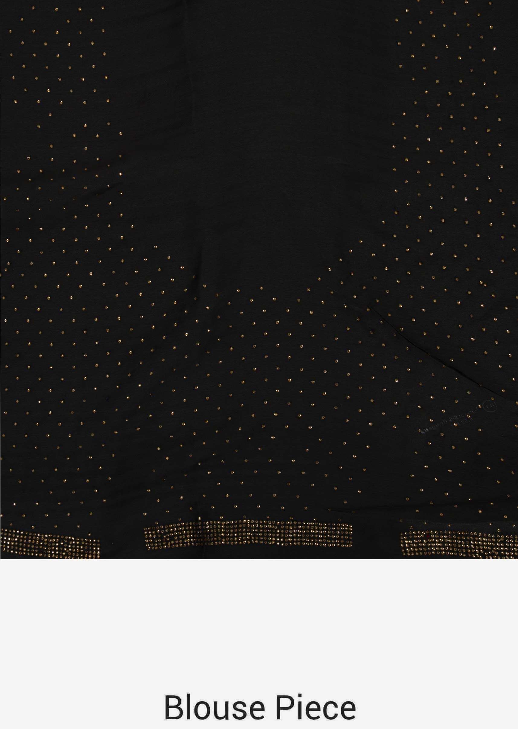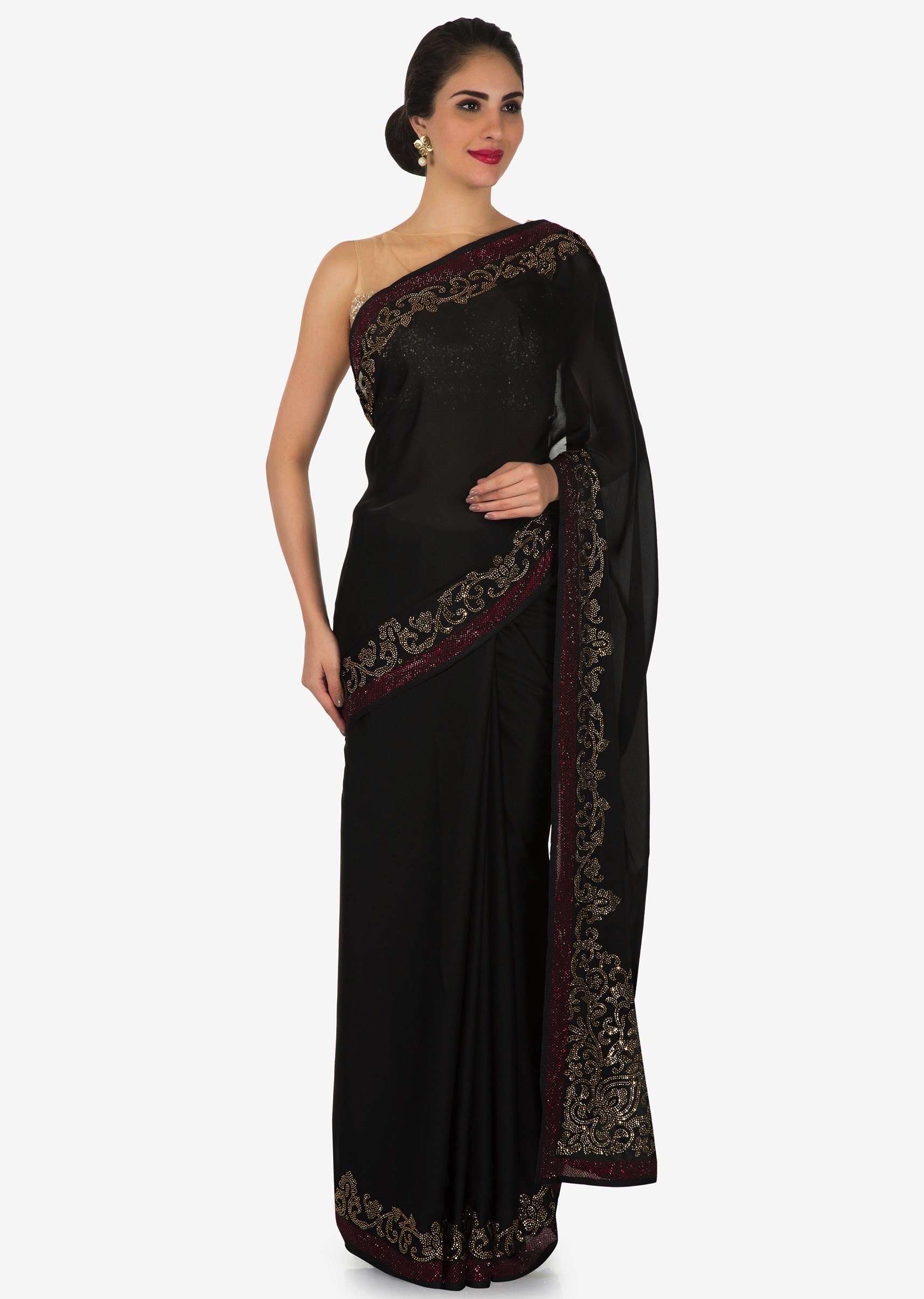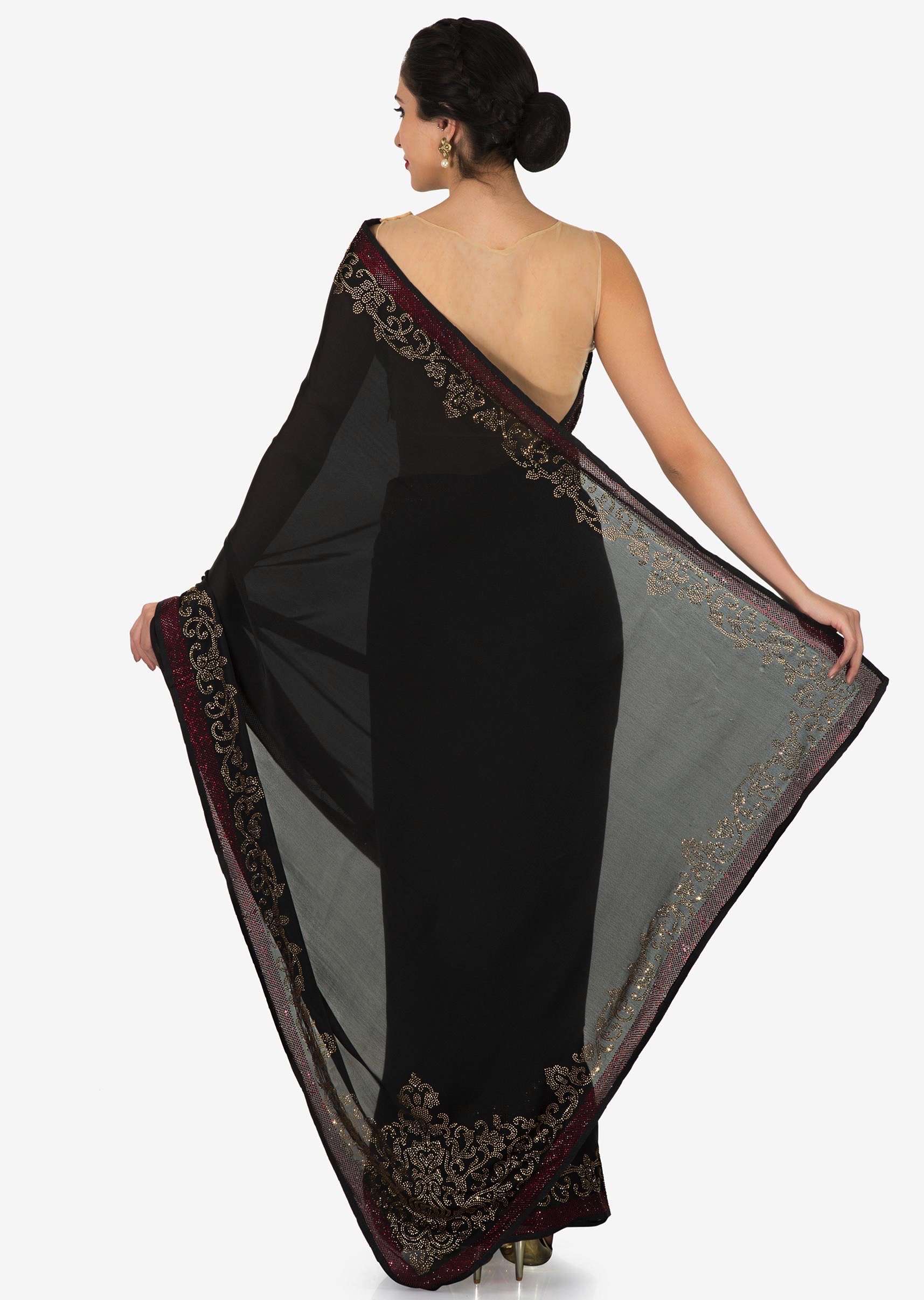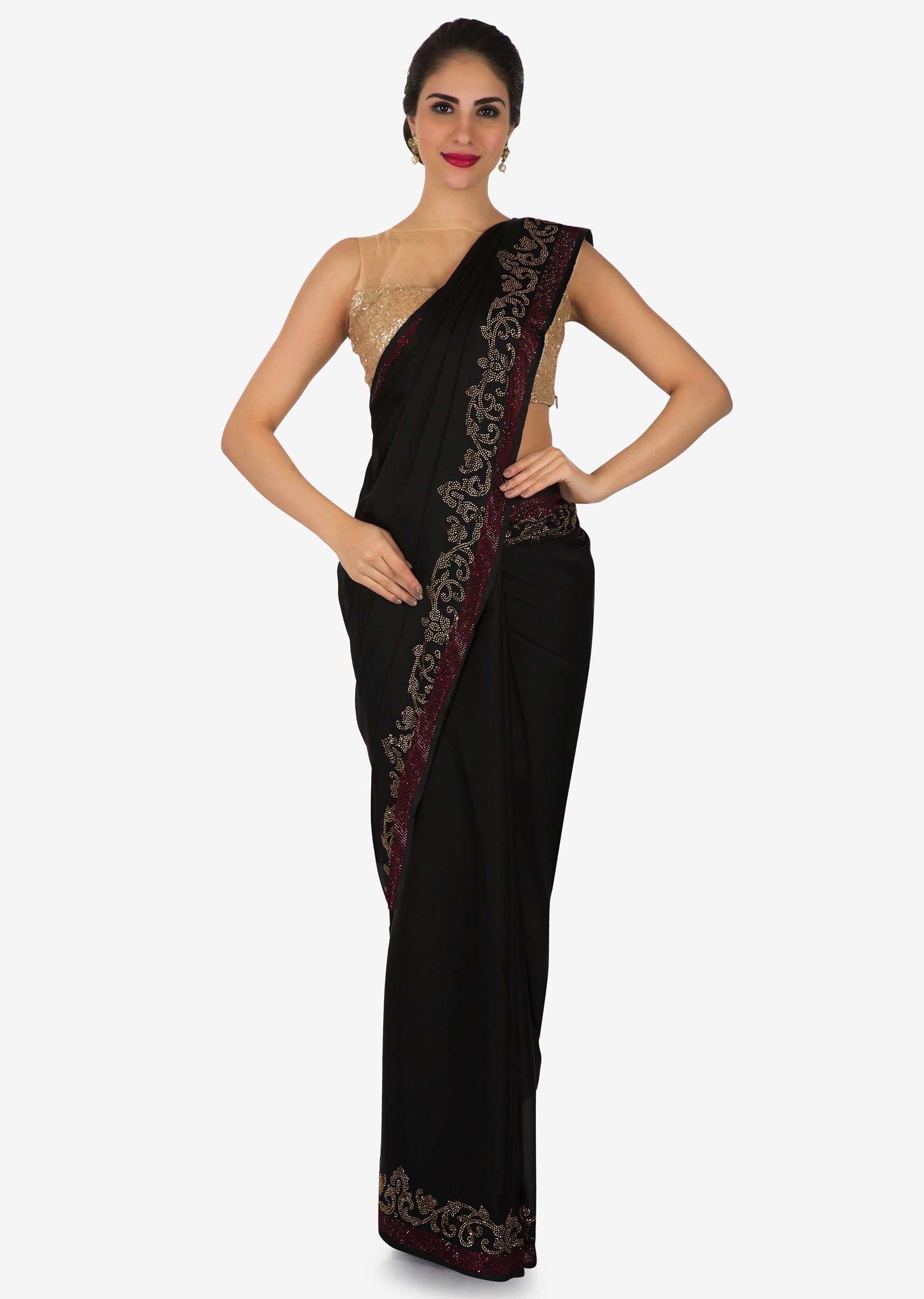 Black satin silk saree with unstitched blouse adorn in kundan embroidery work only on Kalki