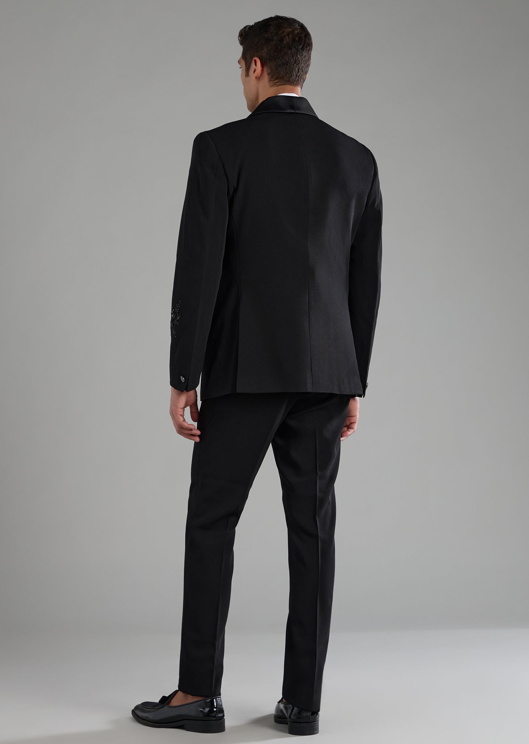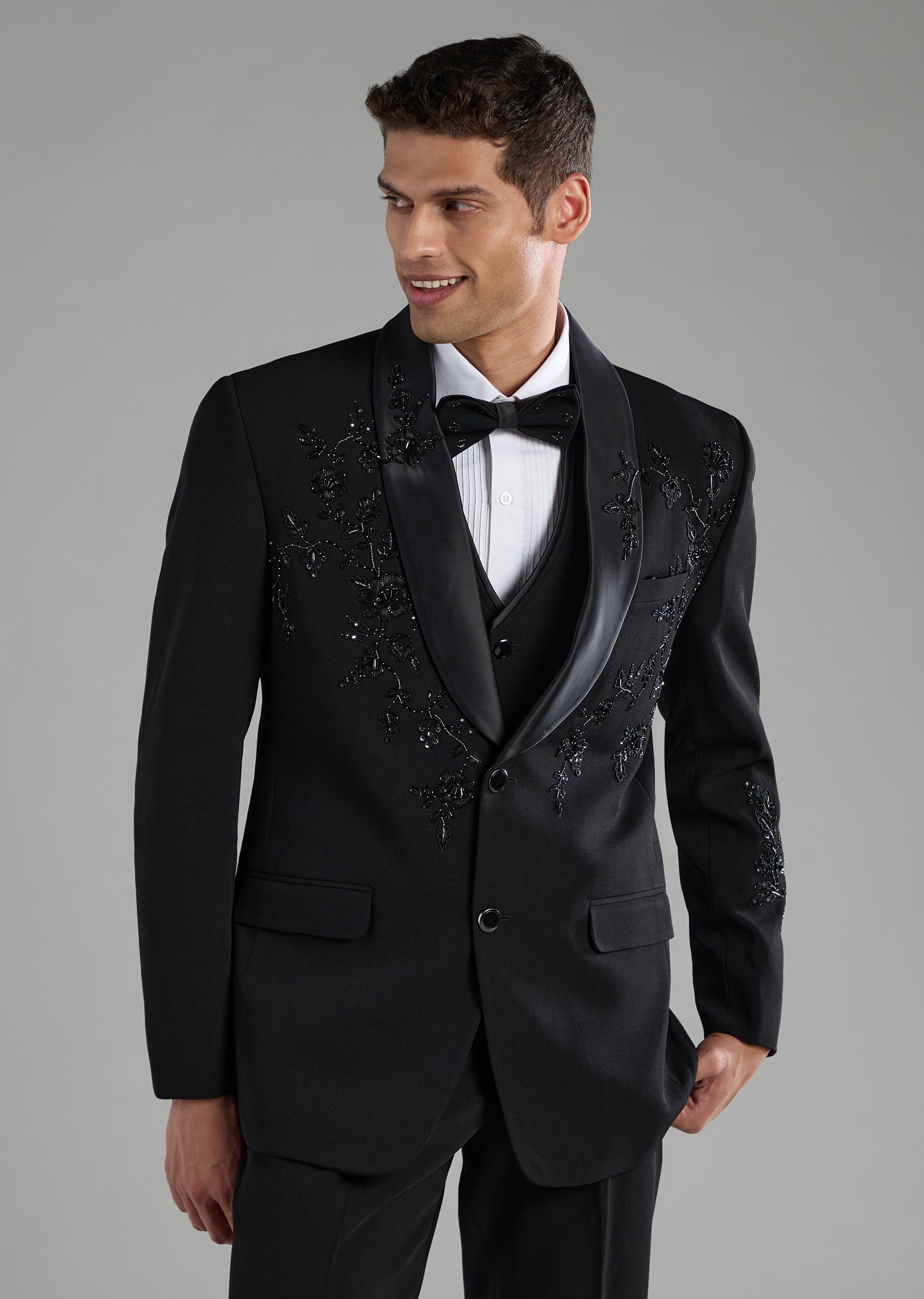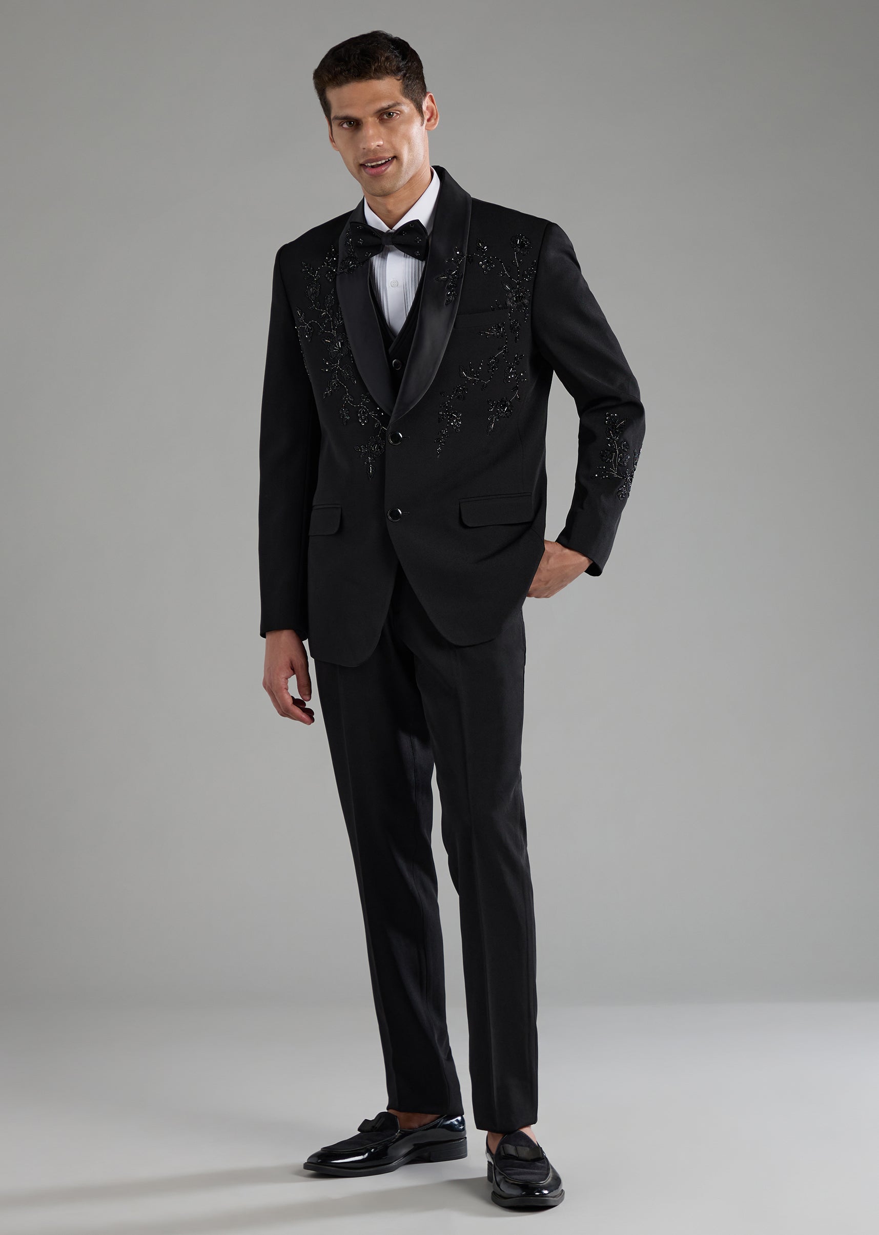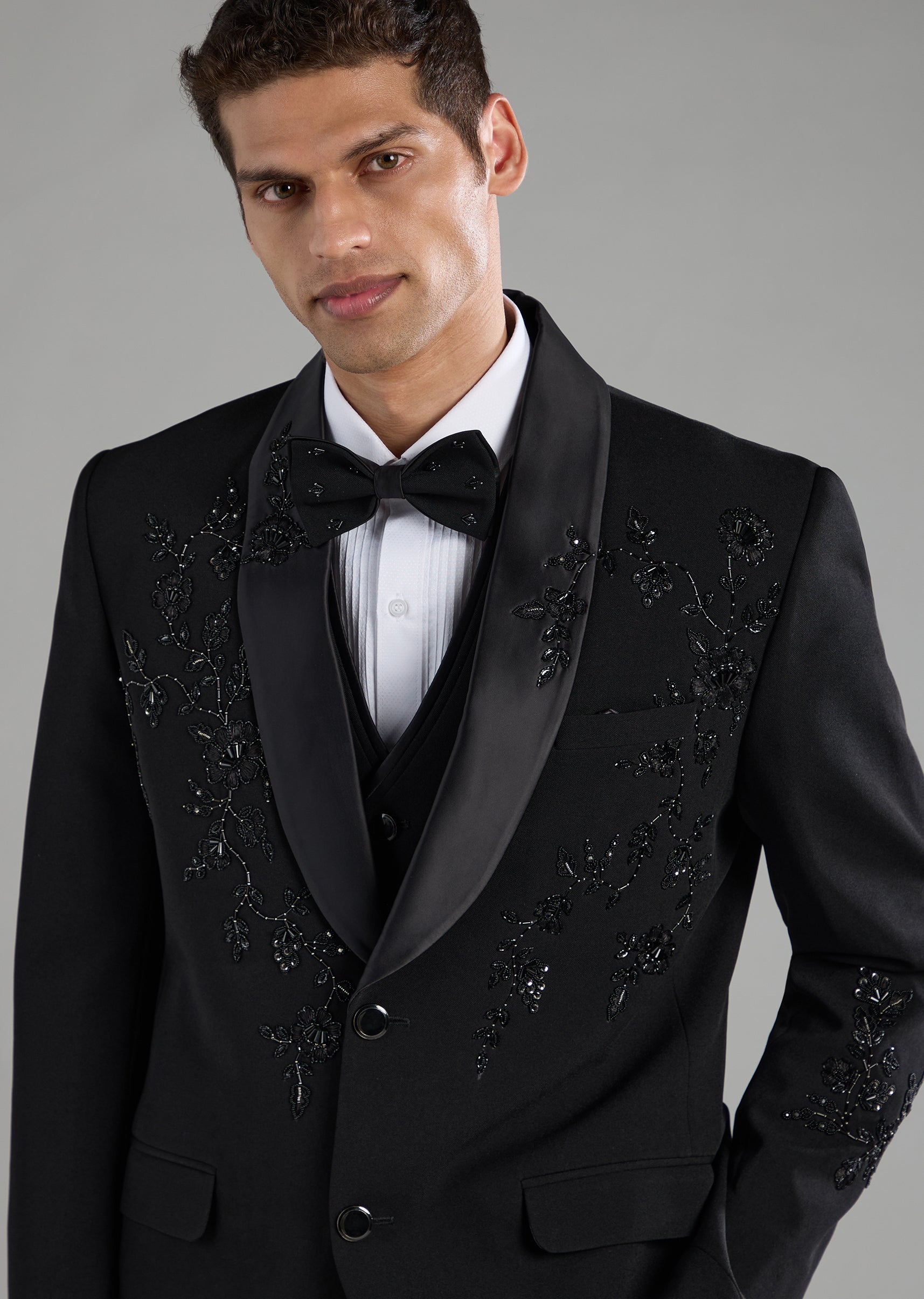 Black Silk Cutdana Embellished Tuxedo Set with Bow Tie