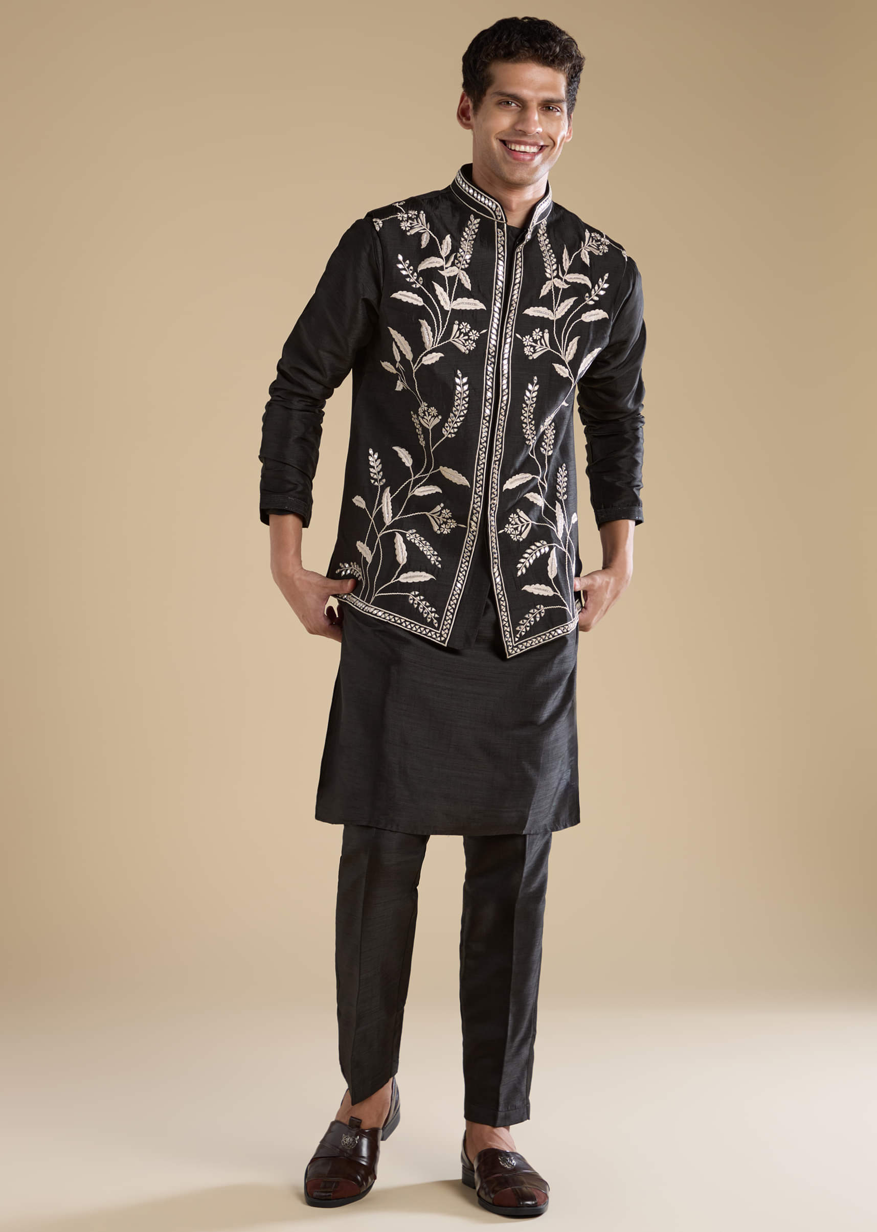 Black Silk Mirror Work Mens Jacket Kurta and Pant Set