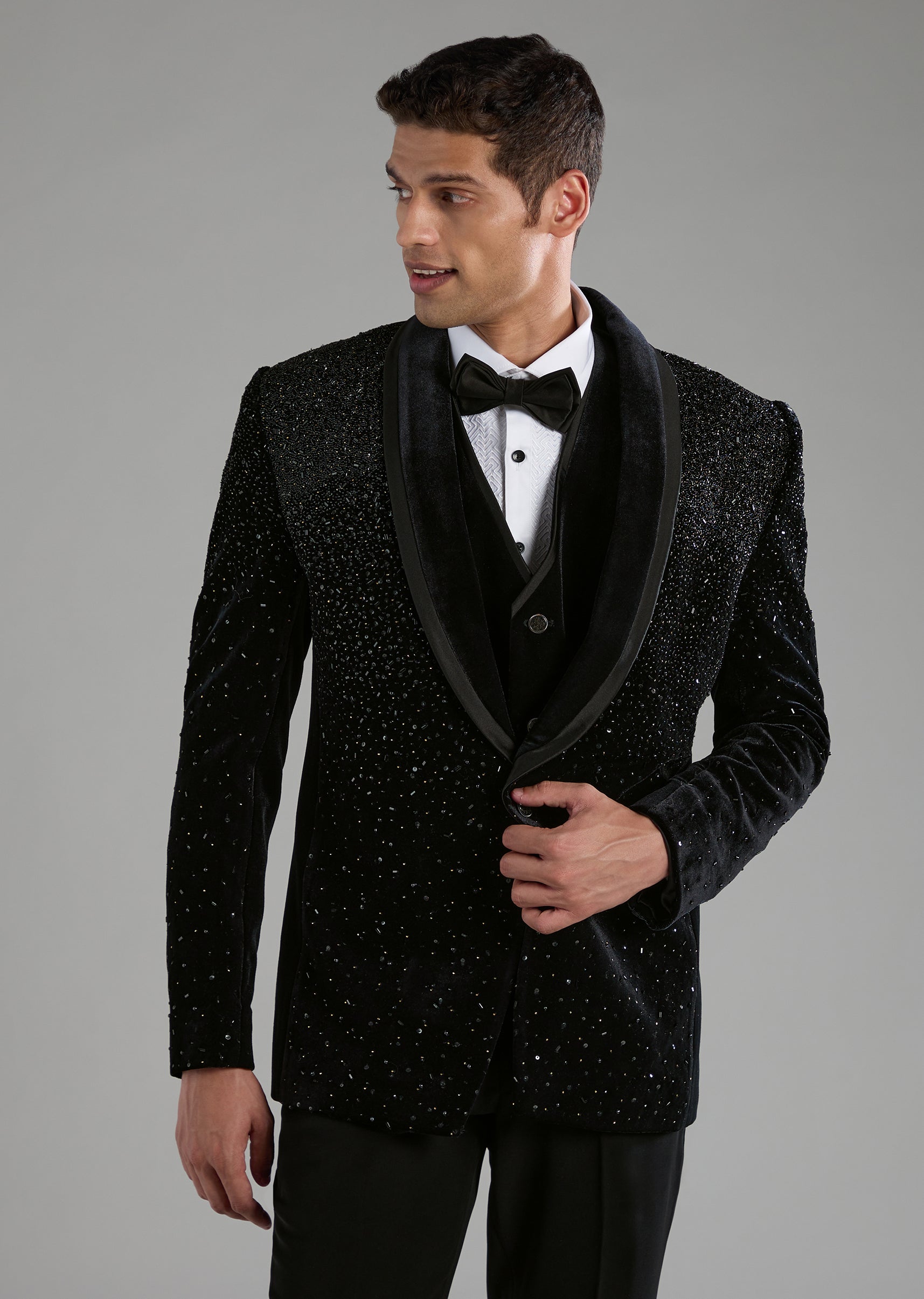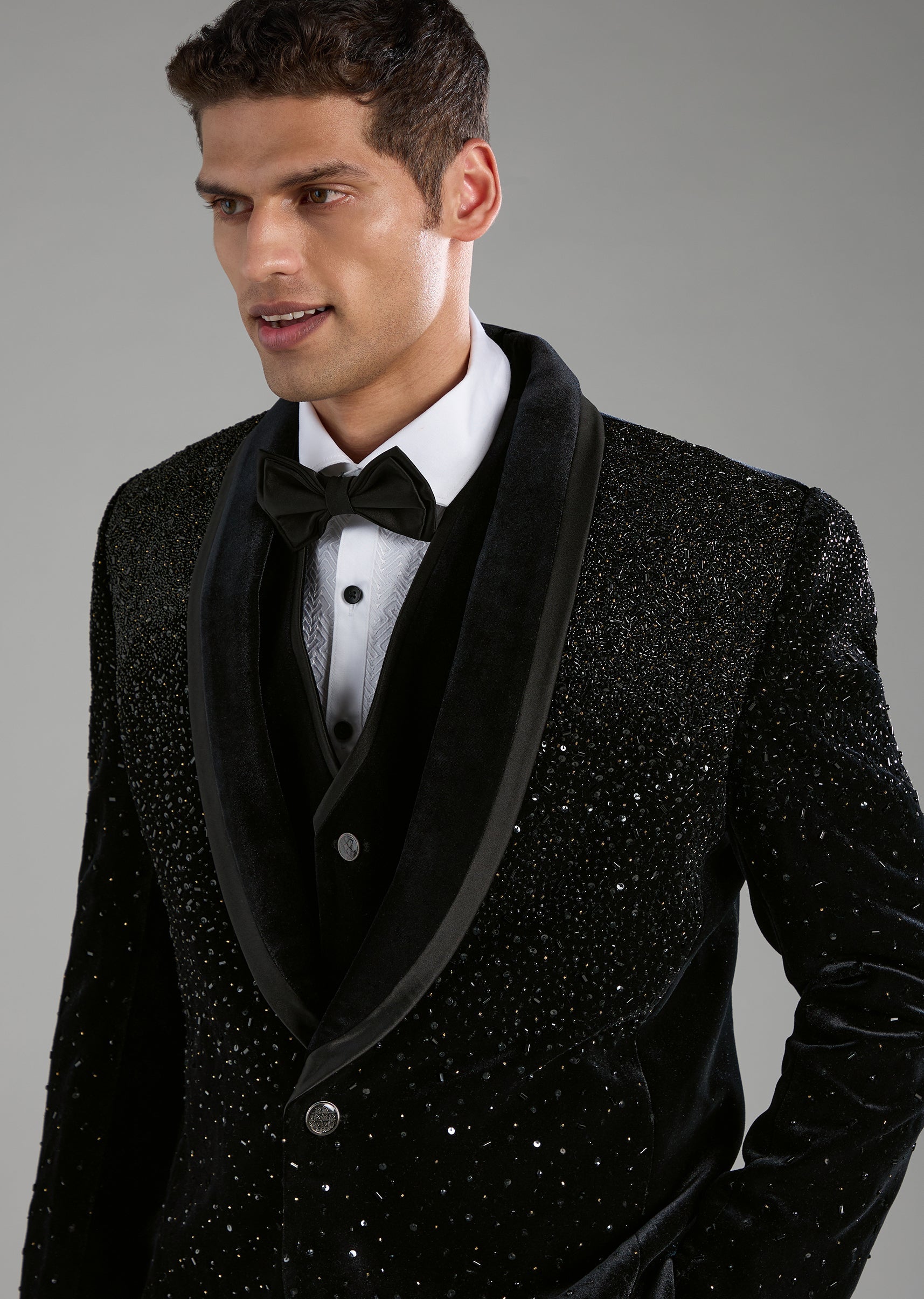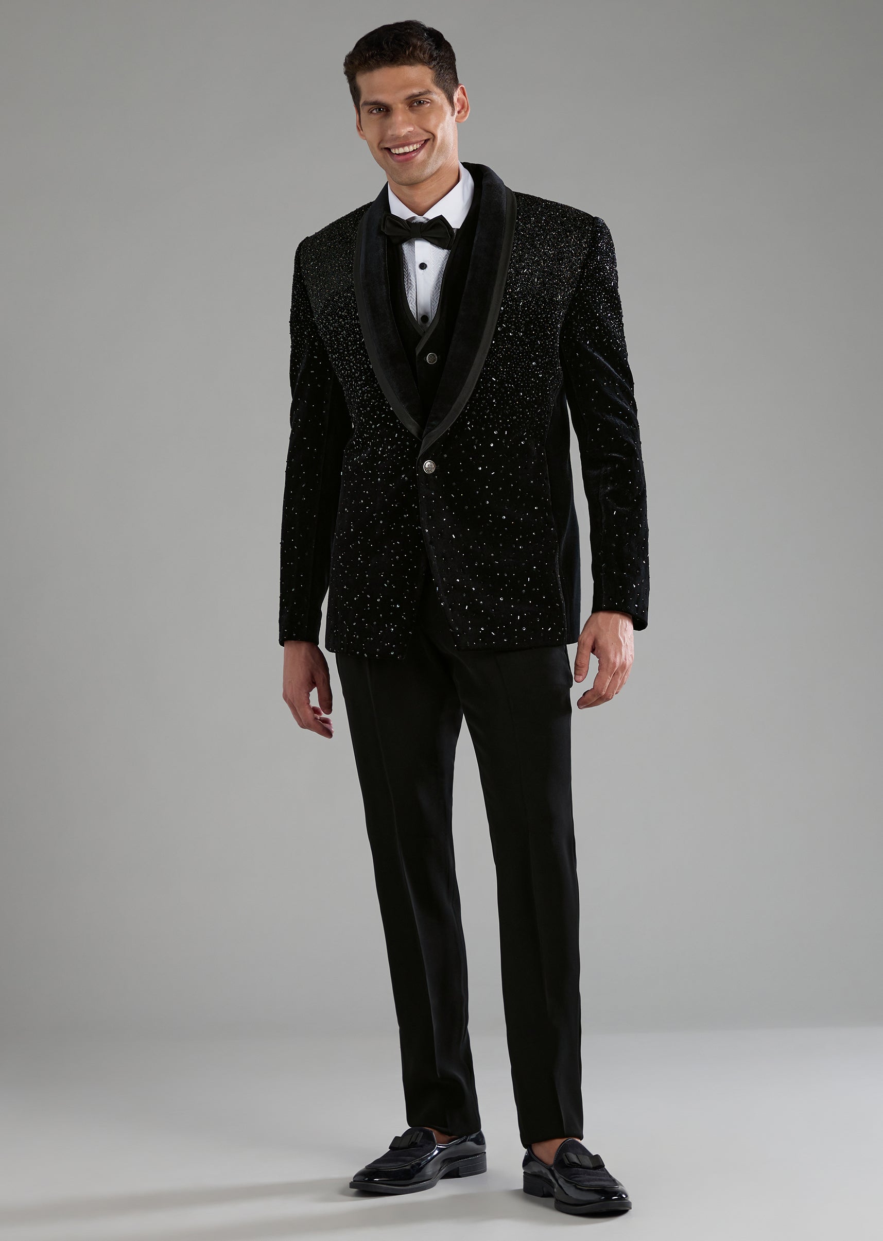 Black Velvet Embellished Tuxedo Set with Bow Tie