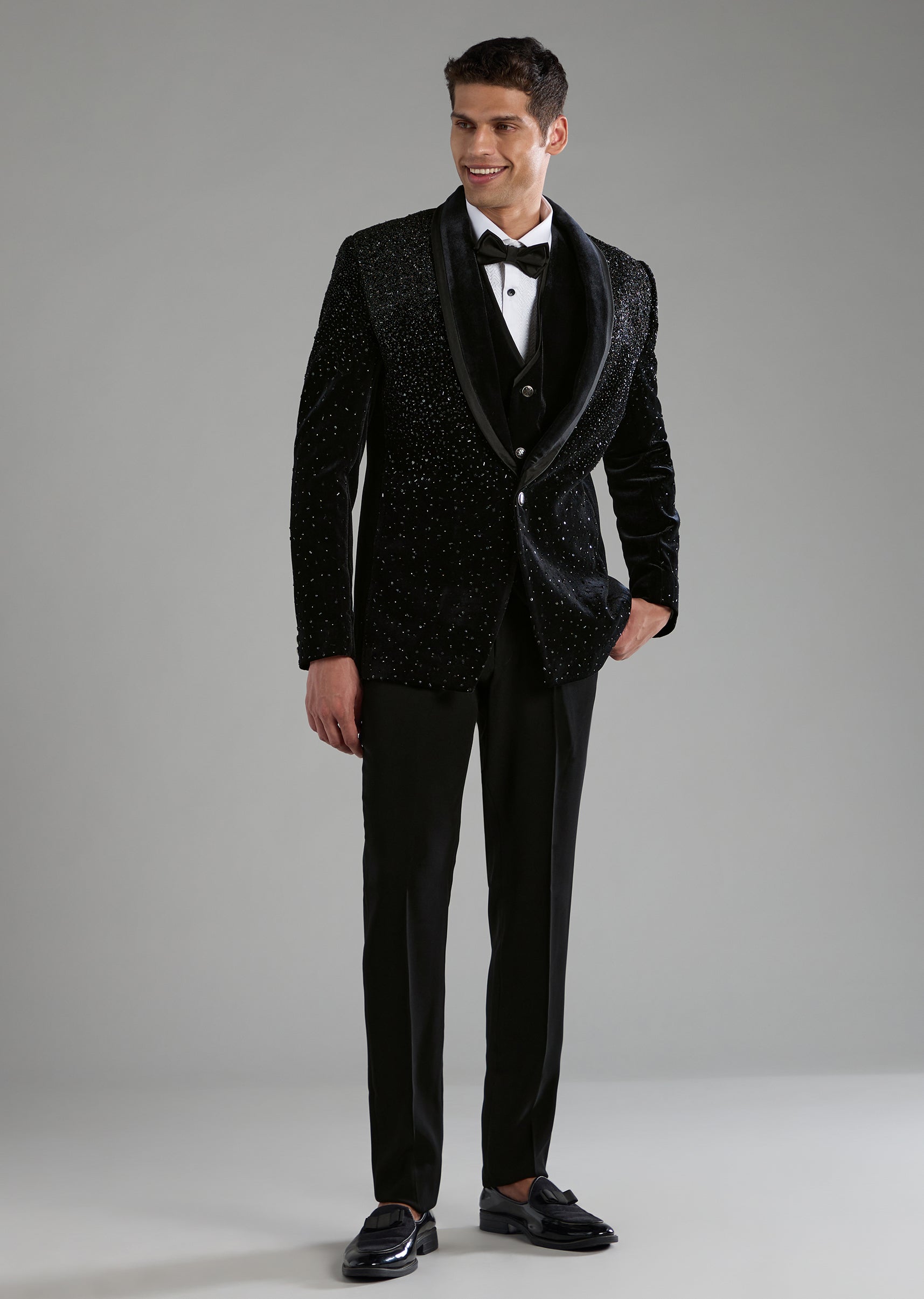 Make an unforgettable entrance in this luxe velvet tuxedo set, enriched with regal zardosi embroidery that adds depth, texture, and a touch of old-world sophistication. The mandarin collar and full sleeves elevate the silhouette with refined charm, while the coordinated waistcoat, bow, shirt, and trouser create a seamlessly polished formal ensemble, perfect for receptions, cocktails, and grand evening celebrations. Awarded as the Most Trusted Brand, we're delivering styles you love, just as promised.