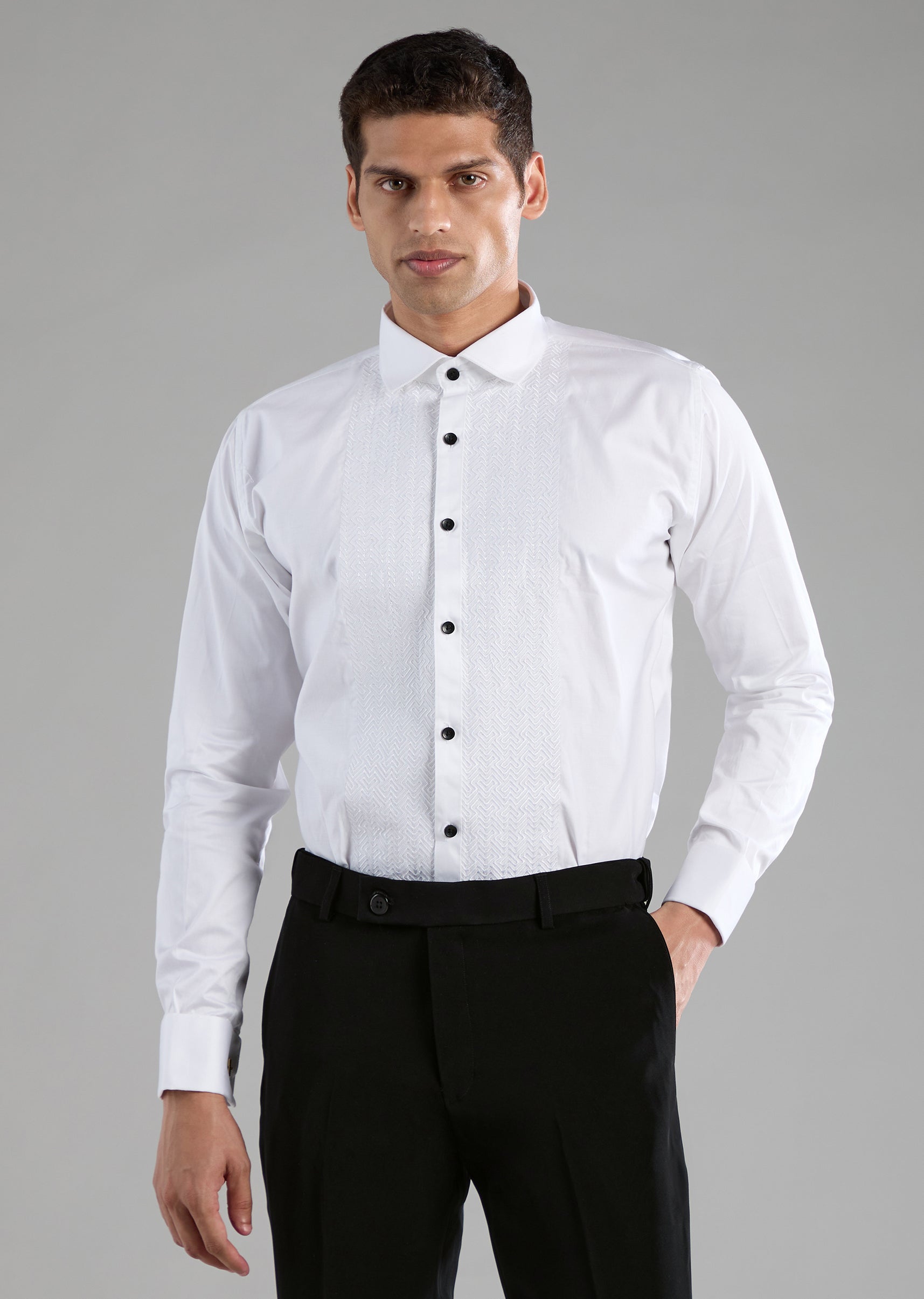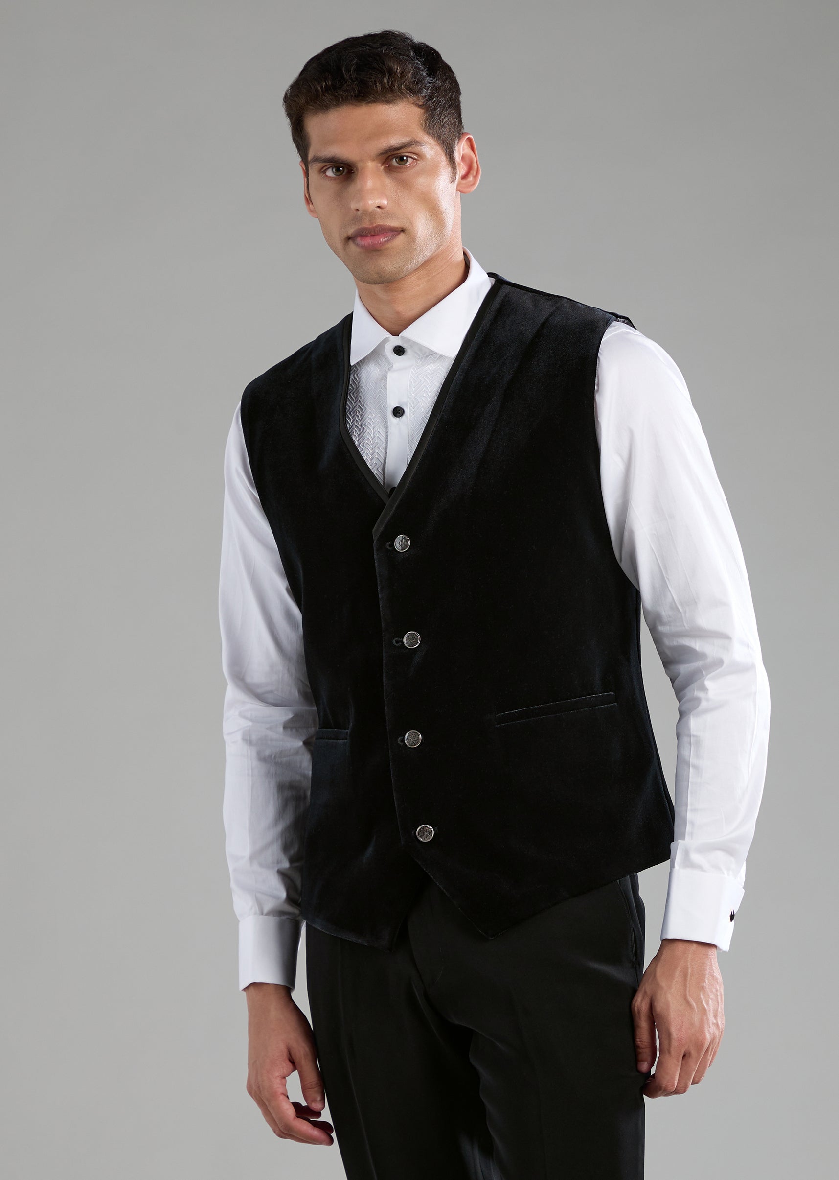 Fit Tips:Ensure the tuxedo fits cleanly across the chest and shoulders, with the waistcoat sitting snugly for a sharp, tailored finish.