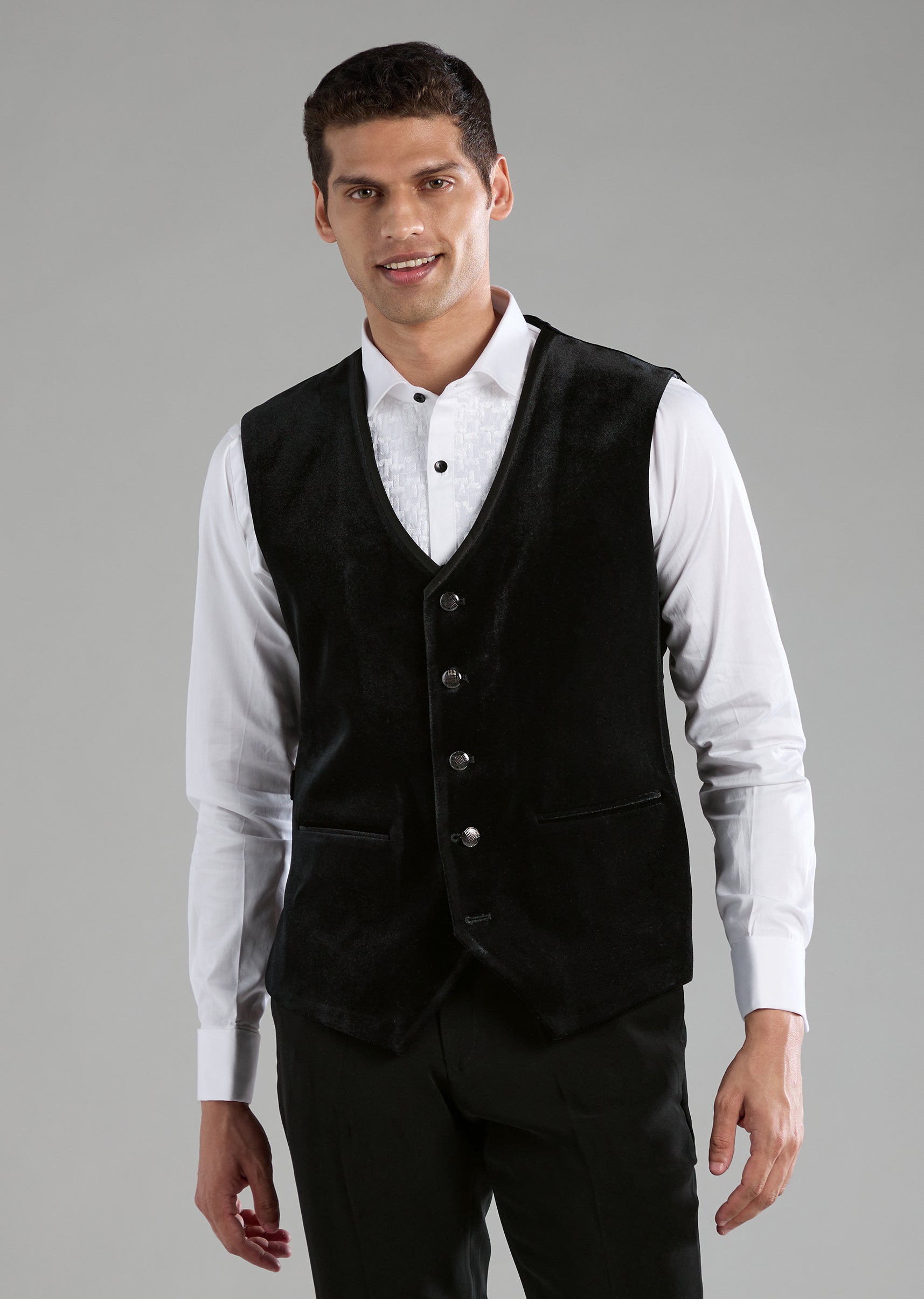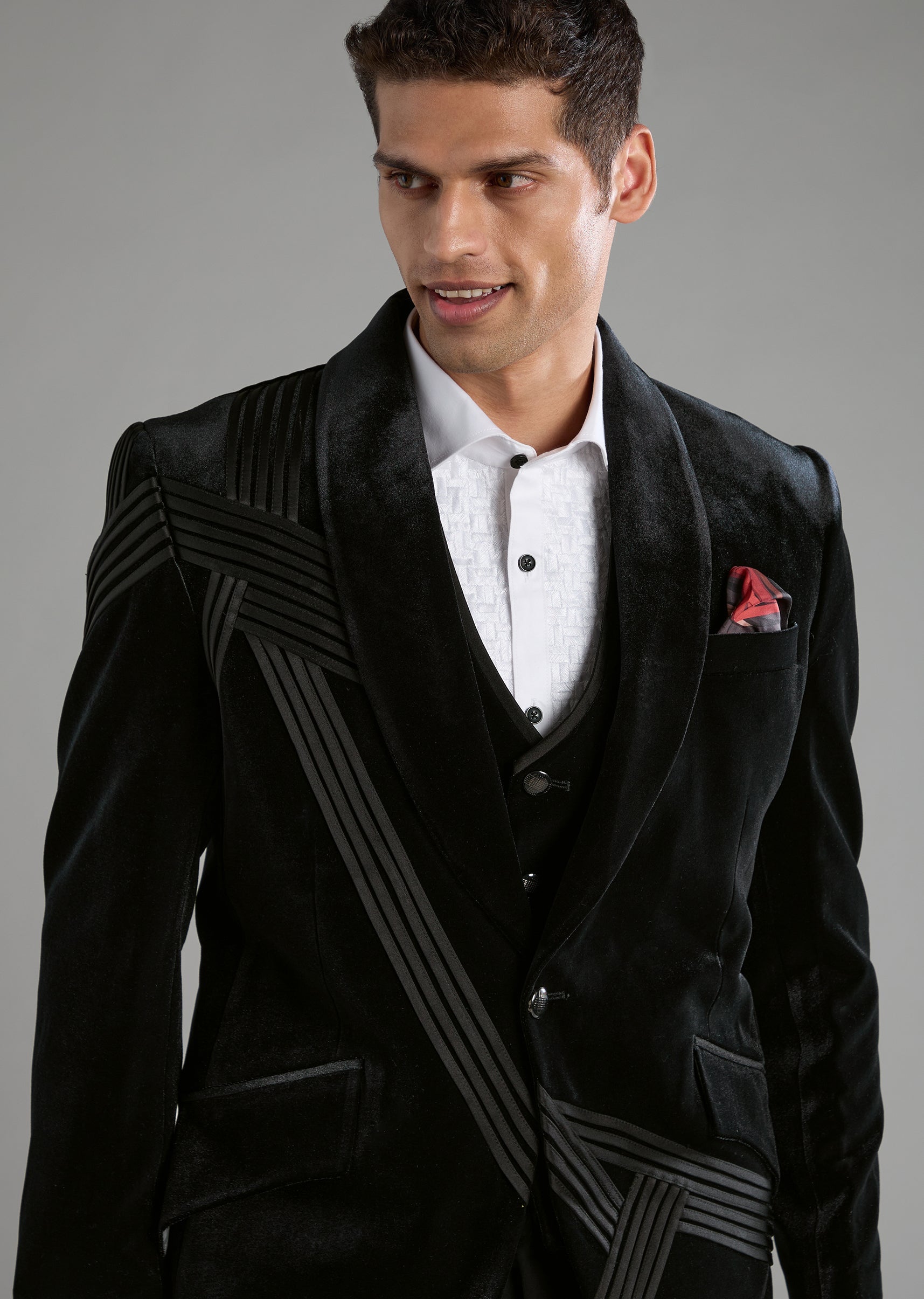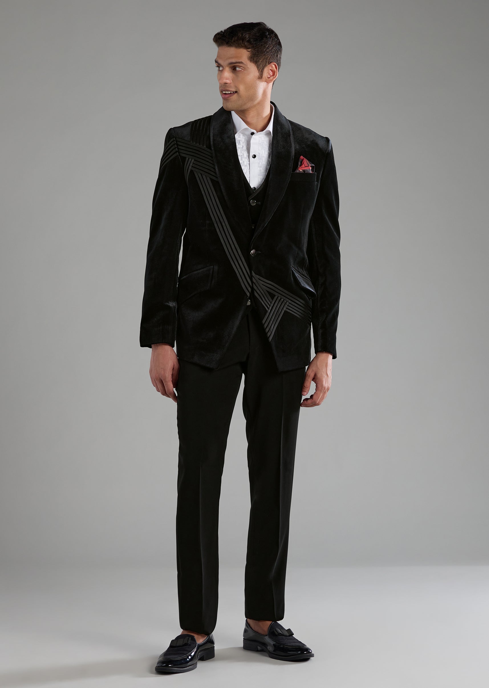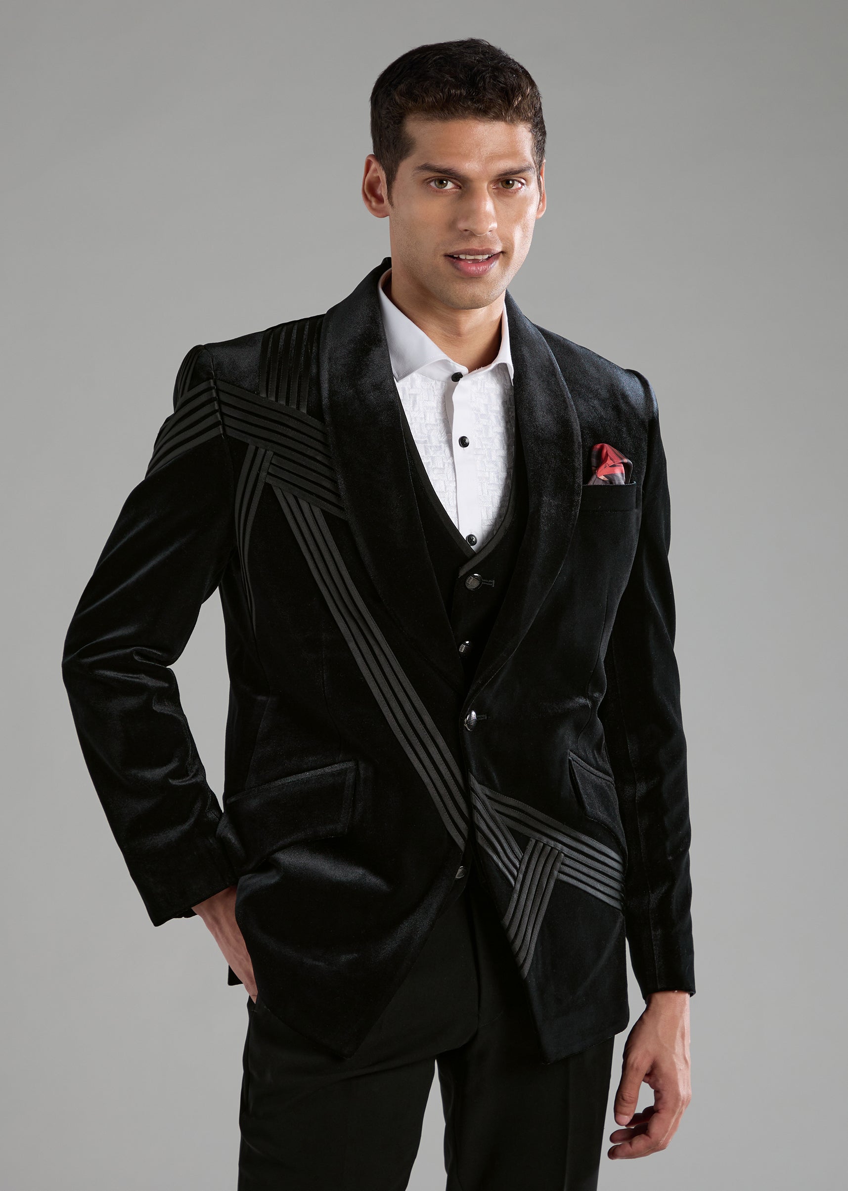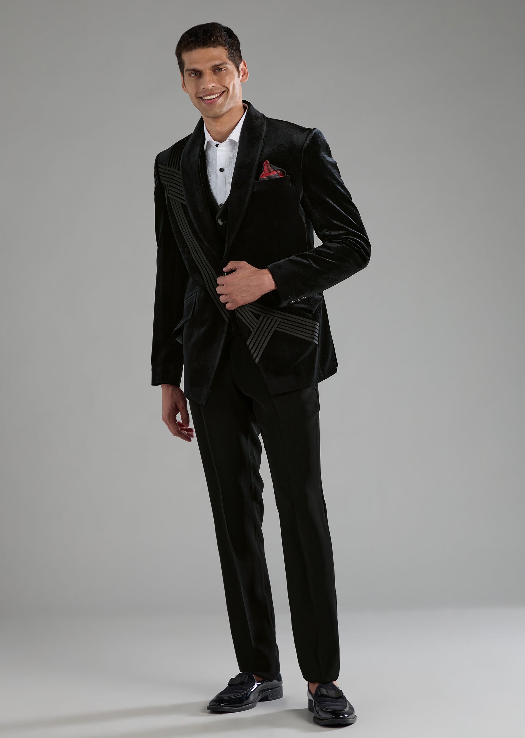 Make an unforgettable entrance with this luxurious velvet tuxedo set, designed to bring depth, richness, and effortless sophistication to any celebration. The smooth velvet jacket paired with a classic waistcoat, crisp shirt, and tailored trousers creates a refined ensemble that transitions seamlessly from receptions to black tie events. Its mandarin collar adds a contemporary twist, giving the outfit a bold yet elegant edge. Awarded as the Most Trusted Brand, we're delivering styles you love, just as promised.