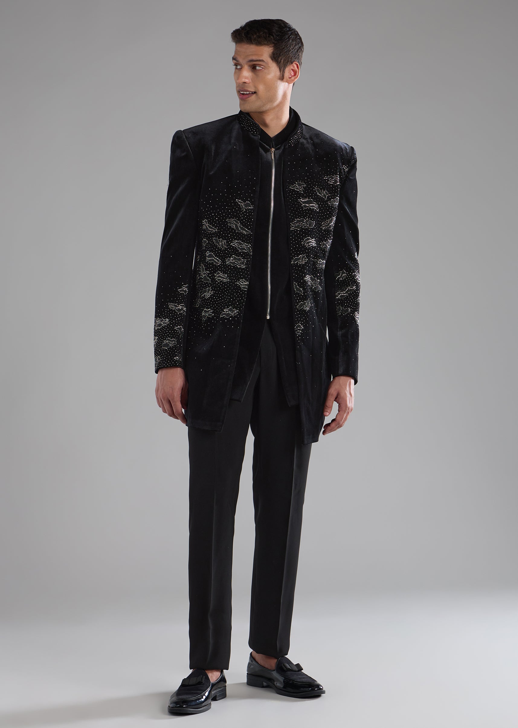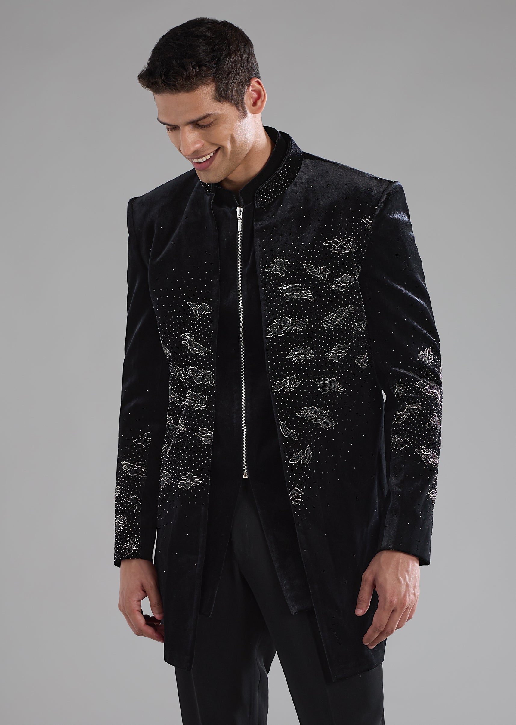 Refined opulence meets modern ethnic styling in this velvet indo western kurta set. Embellished with stone and bead detailing, the rich velvet fabric adds depth and a subtle festive shimmer to the silhouette. Full sleeves and a mandarin collar bring a structured, elegant finish, while the front zip and button detailing add a contemporary edge. Paired with coordinated pants, this ensemble is ideal for weddings, festive evenings, and upscale celebrations.Awarded as the Most Trusted Brand, we're delivering styles you love, just as promised.