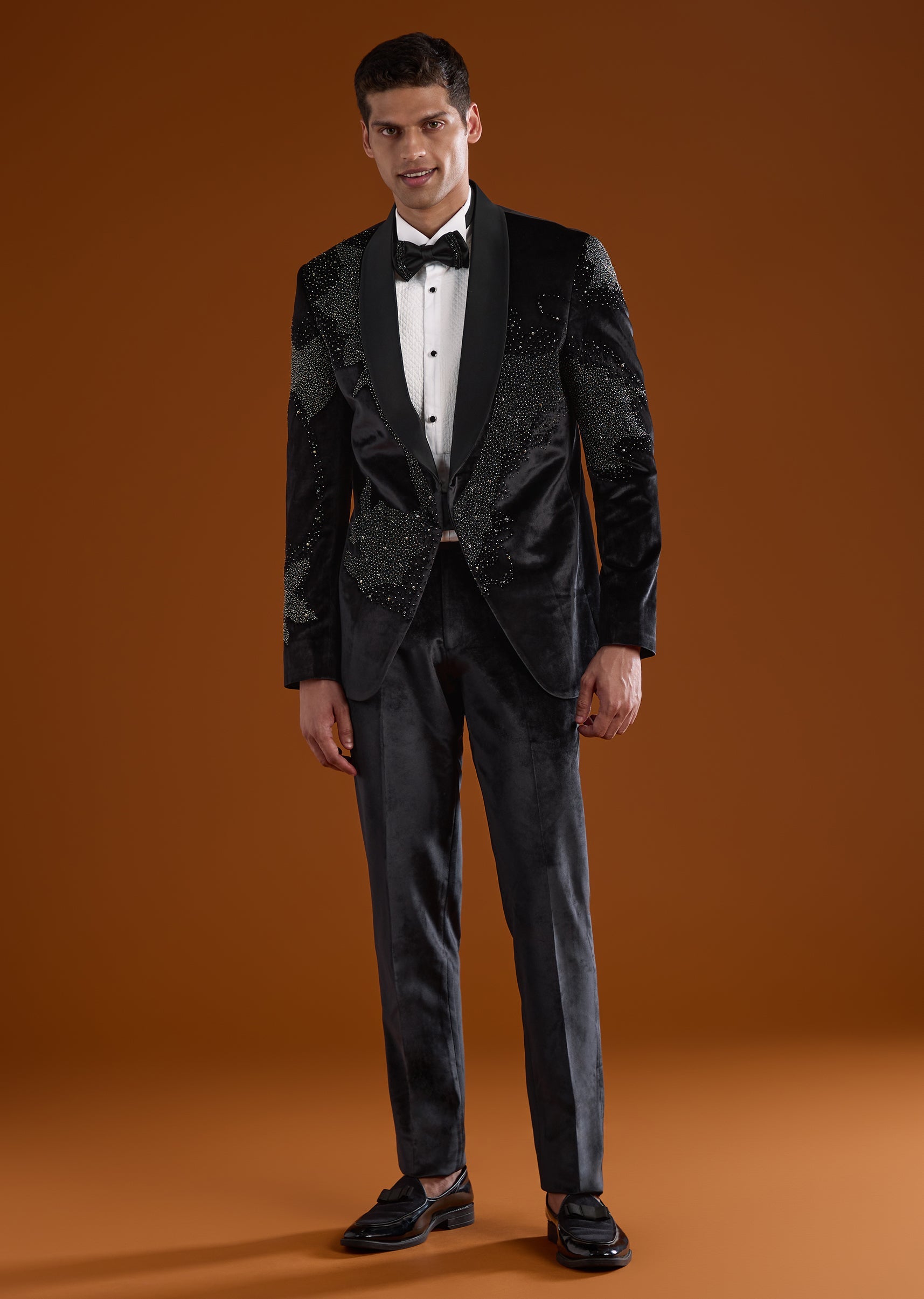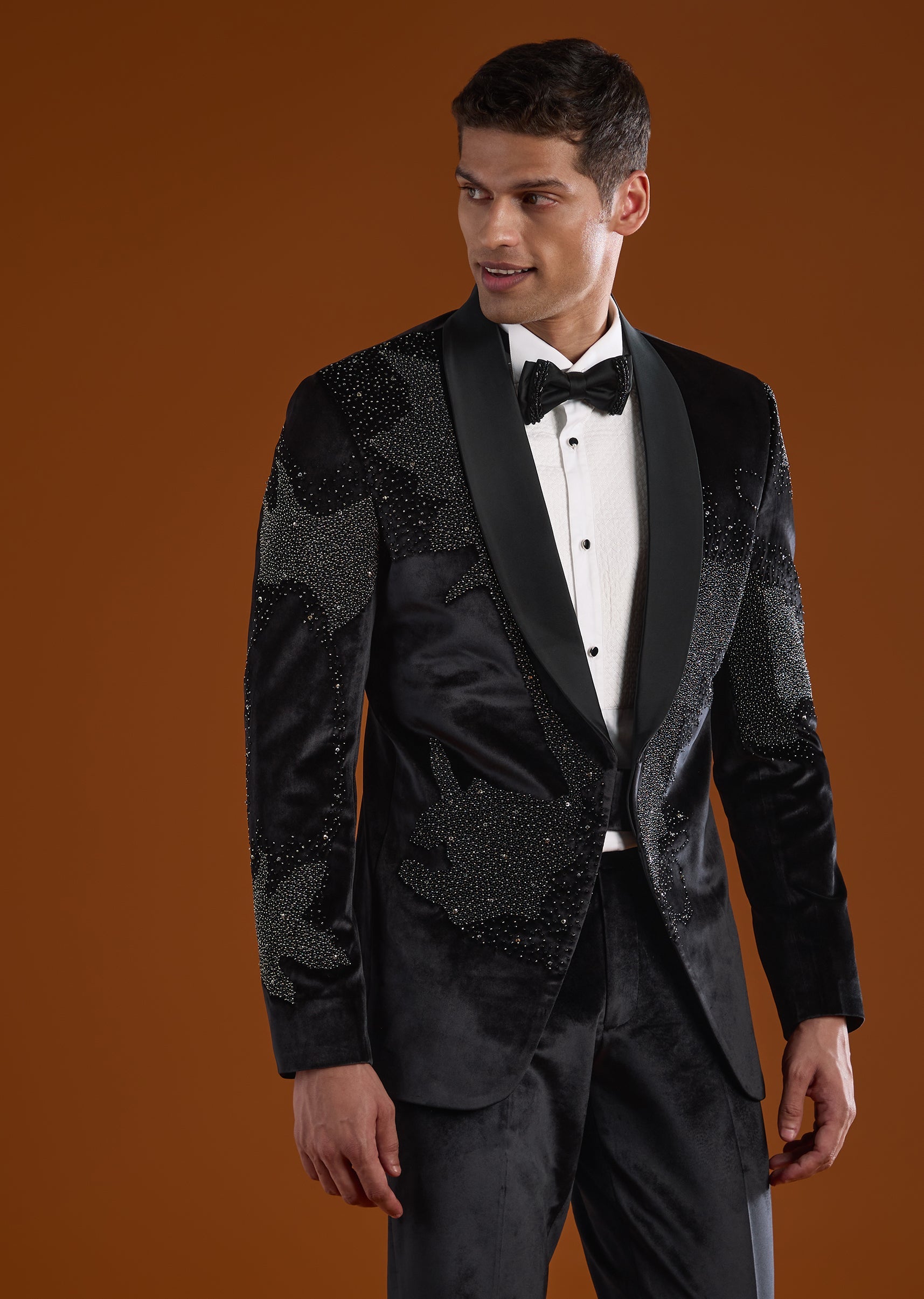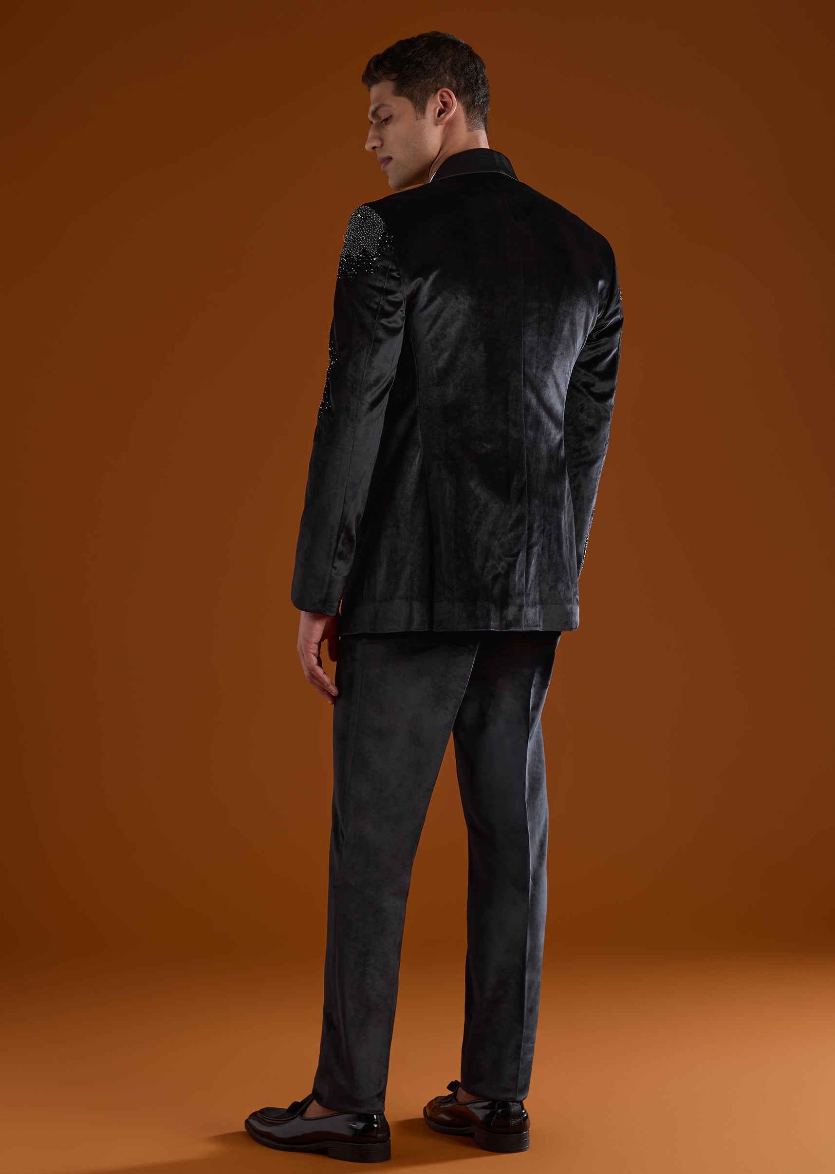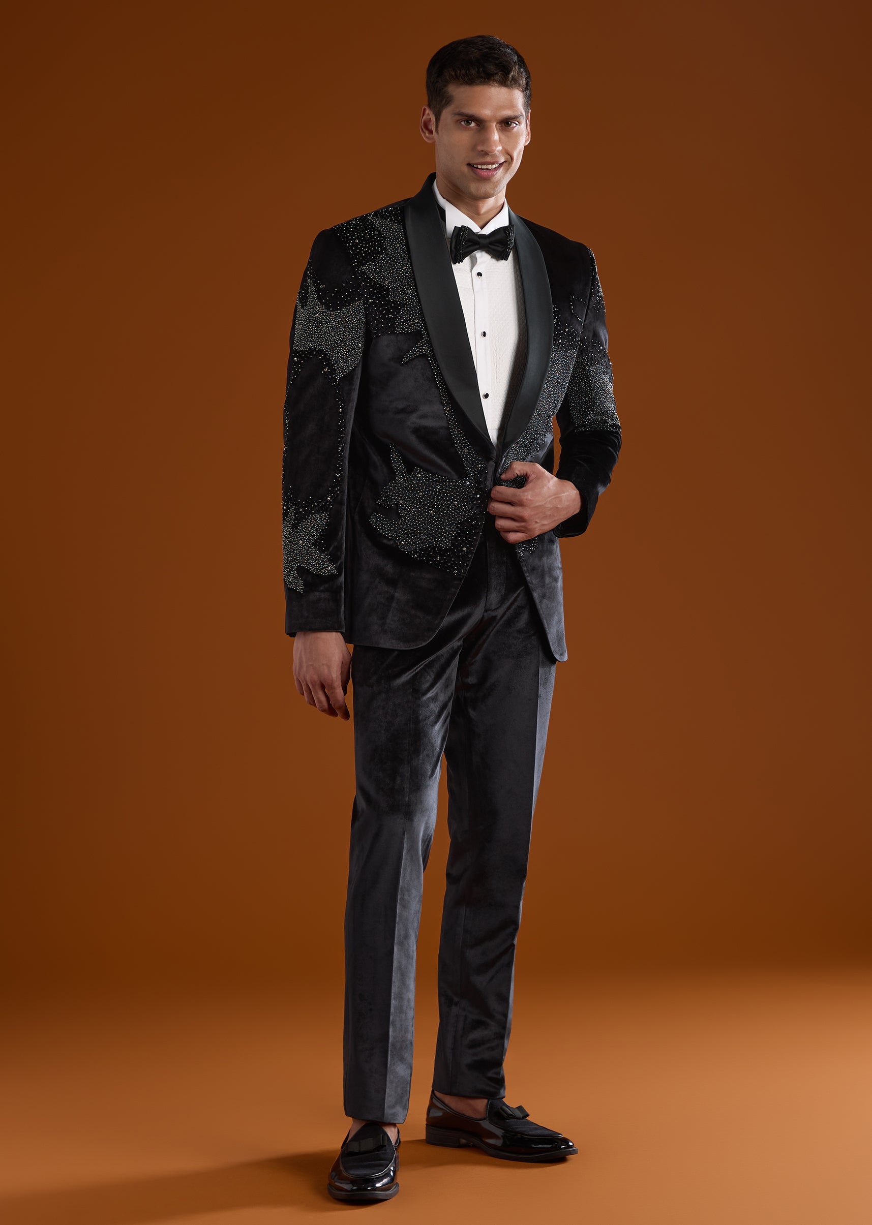 A luxurious black velvet tuxedo designed for sangeet, cocktail, and reception celebrations, perfect for groomsmen. With a contemporary cut and structured silhouette, it combines modern elegance with festive charm. The full sleeves and mandarin collar complete a polished and stylish look for evening wedding occasions. Awarded as the Most Trusted Brand, we're delivering styles you love, just as promised.