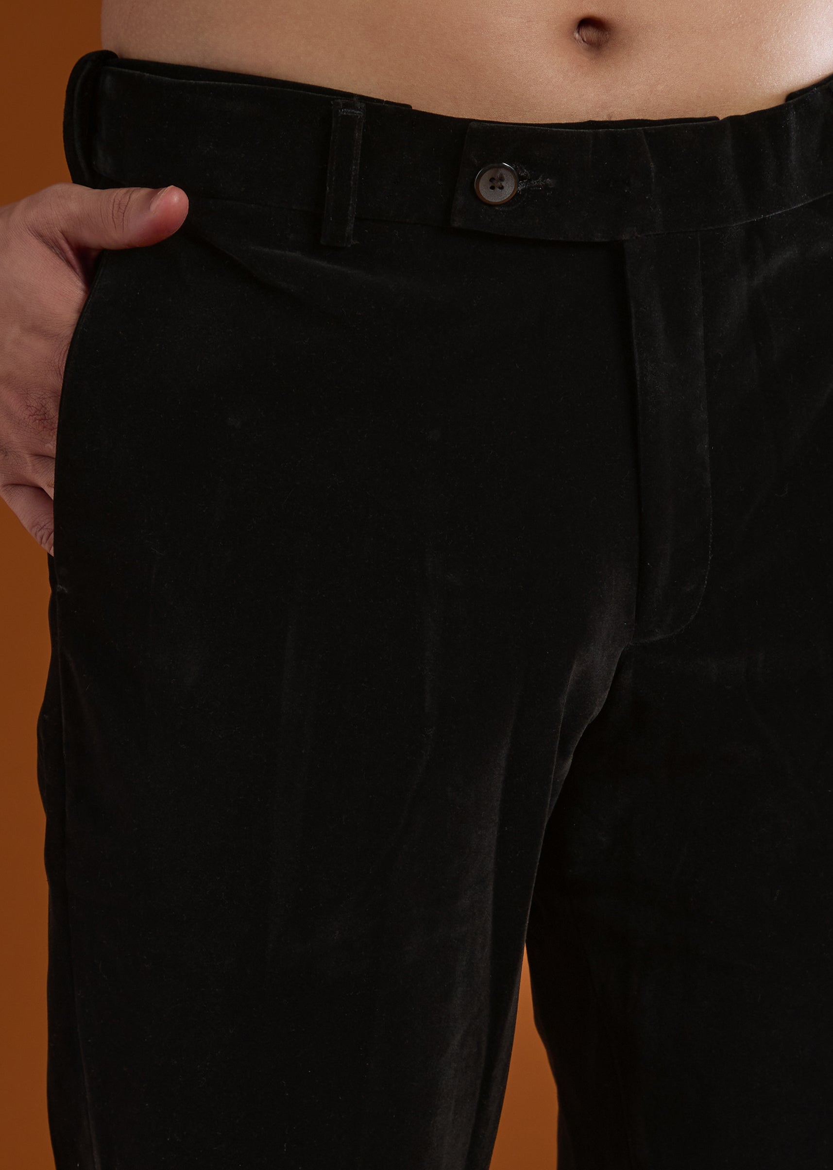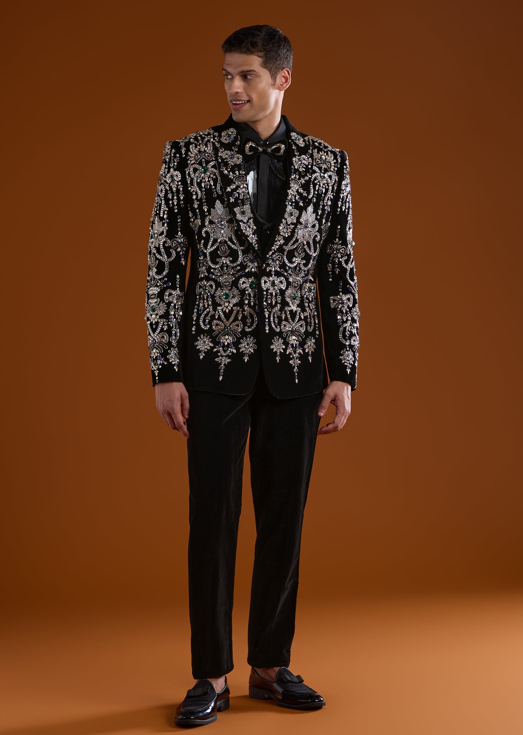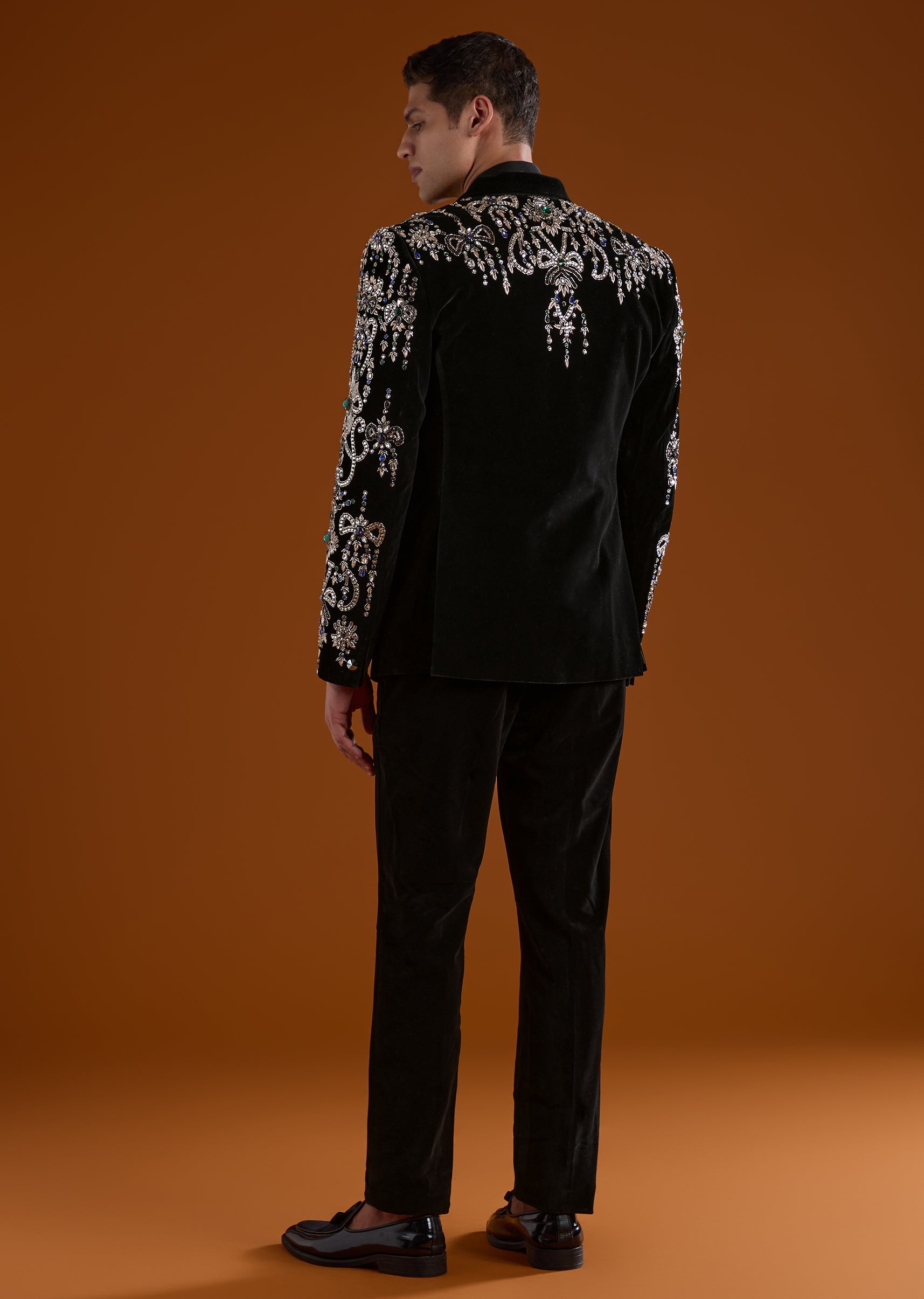 Pair it with classic black footwear and a sleek watch to highlight the rich velvet and detailed work.