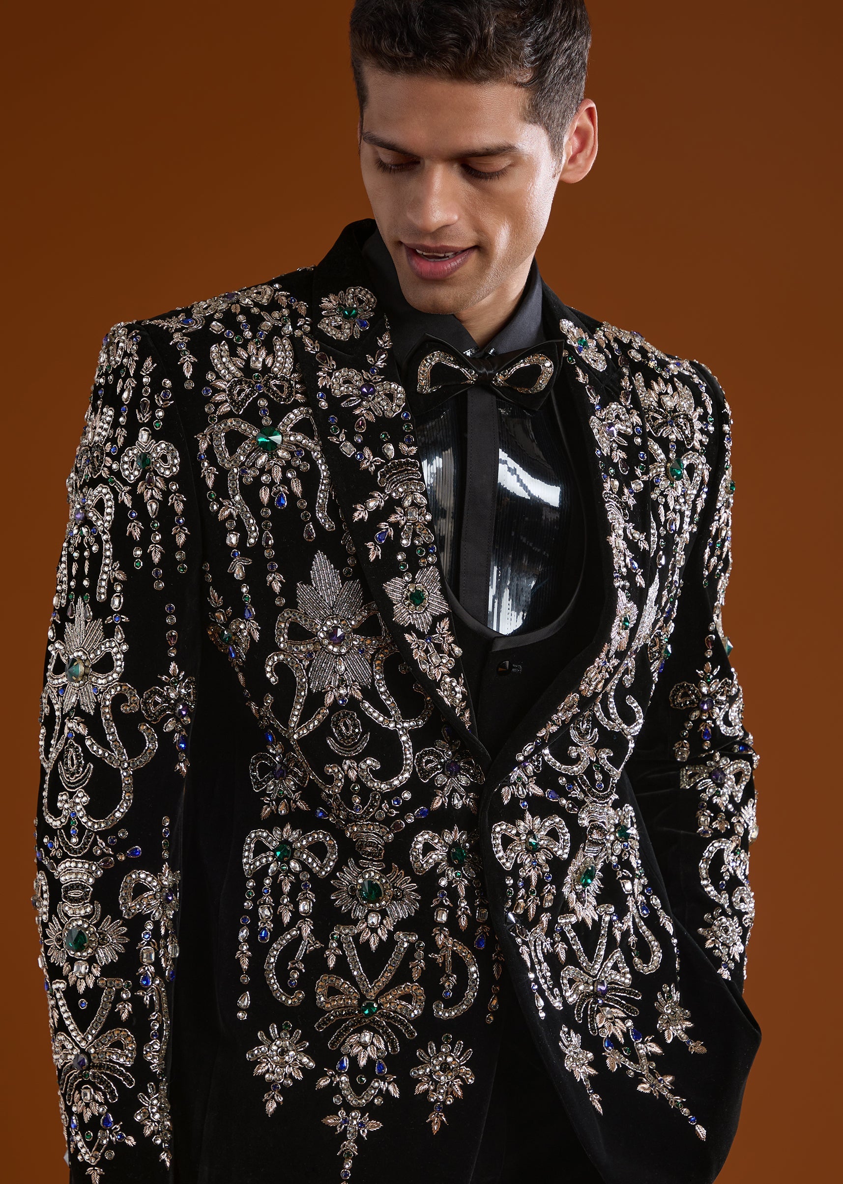 Black Velvet Mens Tuxedo With Stone Zari Cut Dana And Thread Work