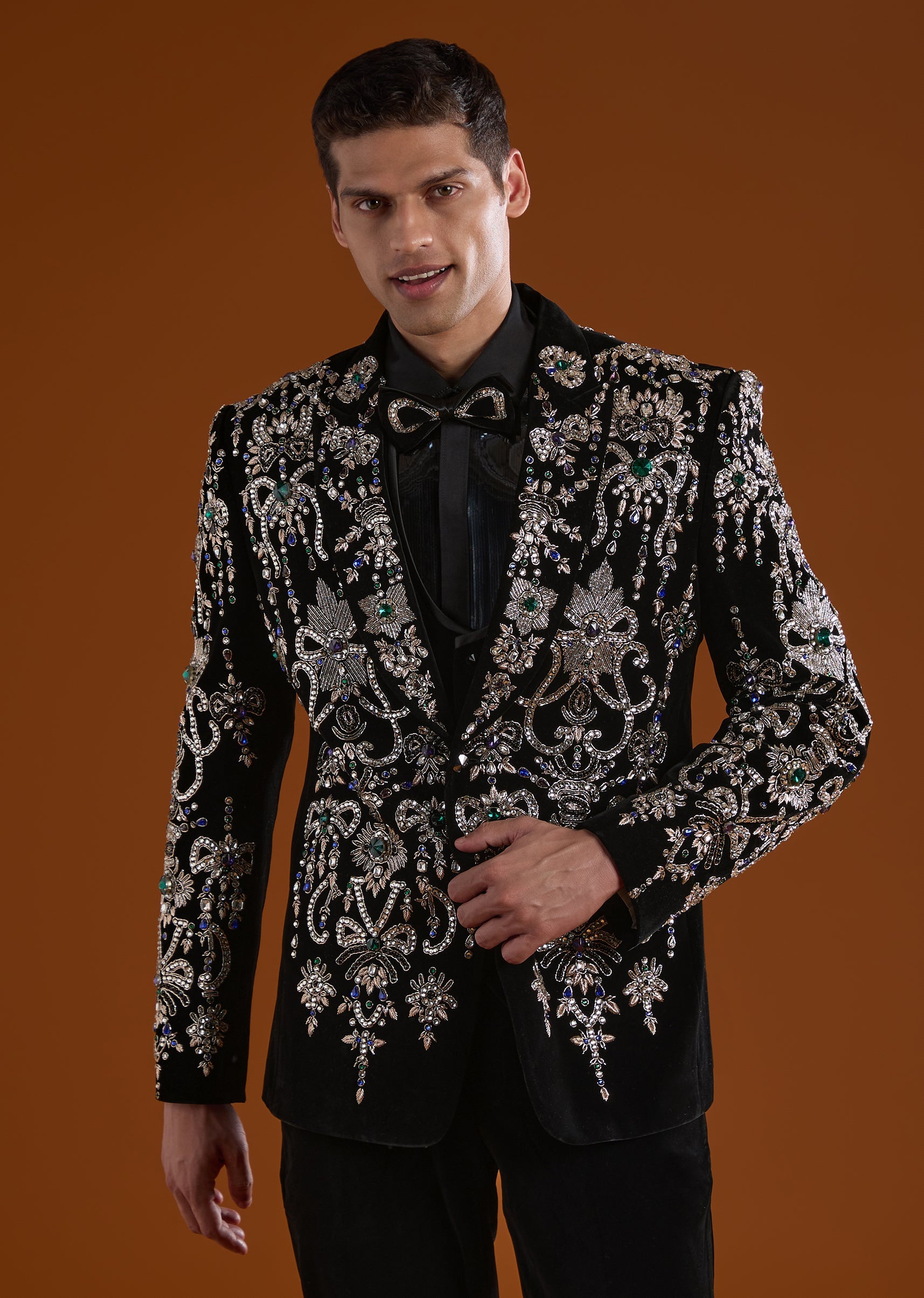 A luxurious black velvet tuxedo crafted for sangeet, reception, engagement, and cocktail celebrations, perfect for groomsmen. Enhanced with intricate stone, zari, cut Dana, and thread work, it exudes festive sophistication... More Product Details