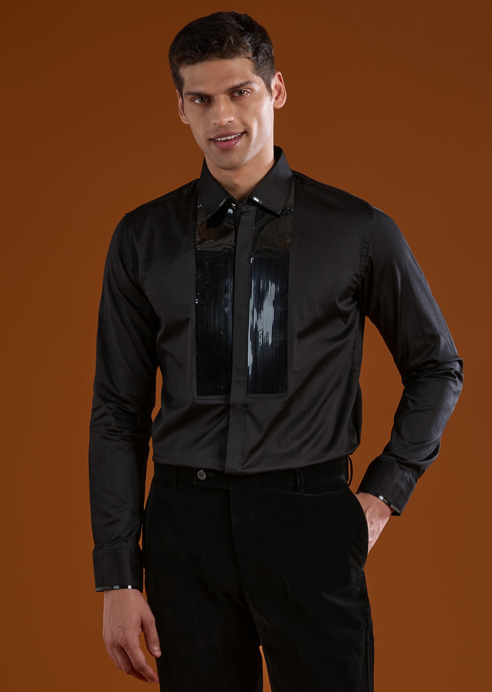 A luxurious black velvet tuxedo crafted for sangeet, reception, engagement, and cocktail celebrations, perfect for groomsmen. Enhanced with intricate stone, zari, cut Dana, and thread work, it exudes festive sophistication while maintaining a polished silhouette. The full sleeves and mandarin collar complete a structured and elegant look for wedding occasions. Awarded as the Most Trusted Brand, we're delivering styles you love, just as promised.