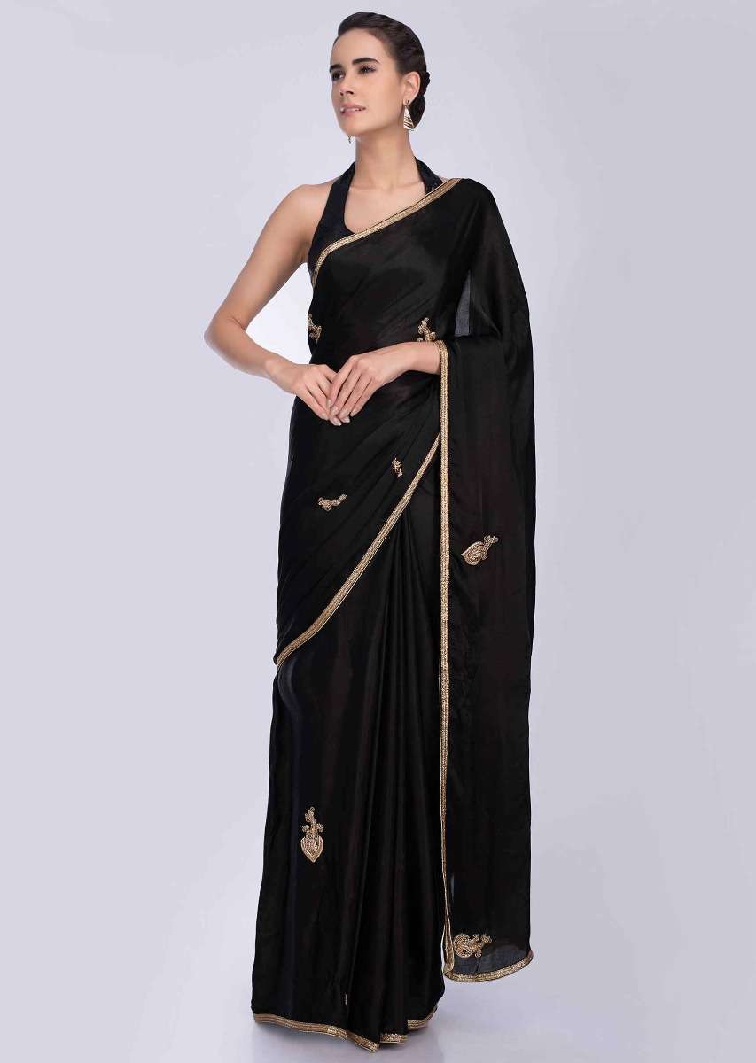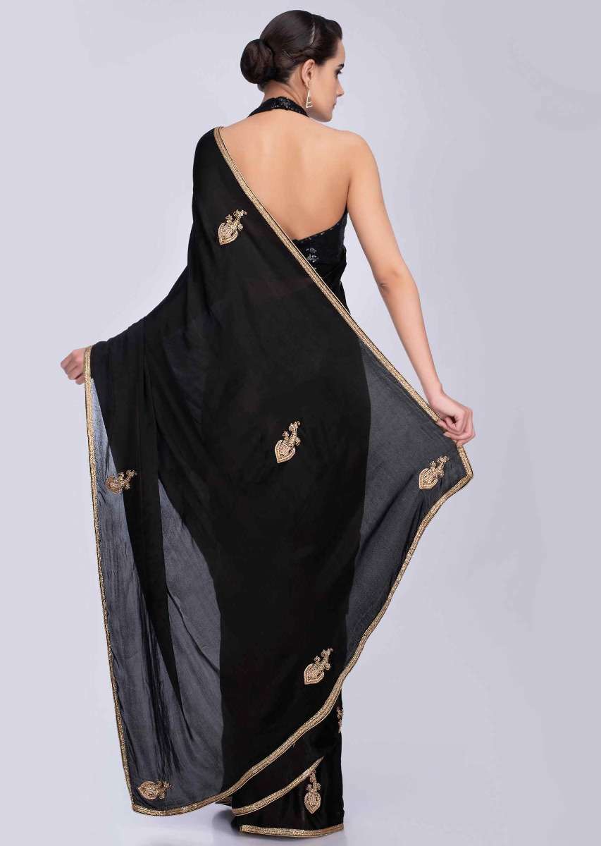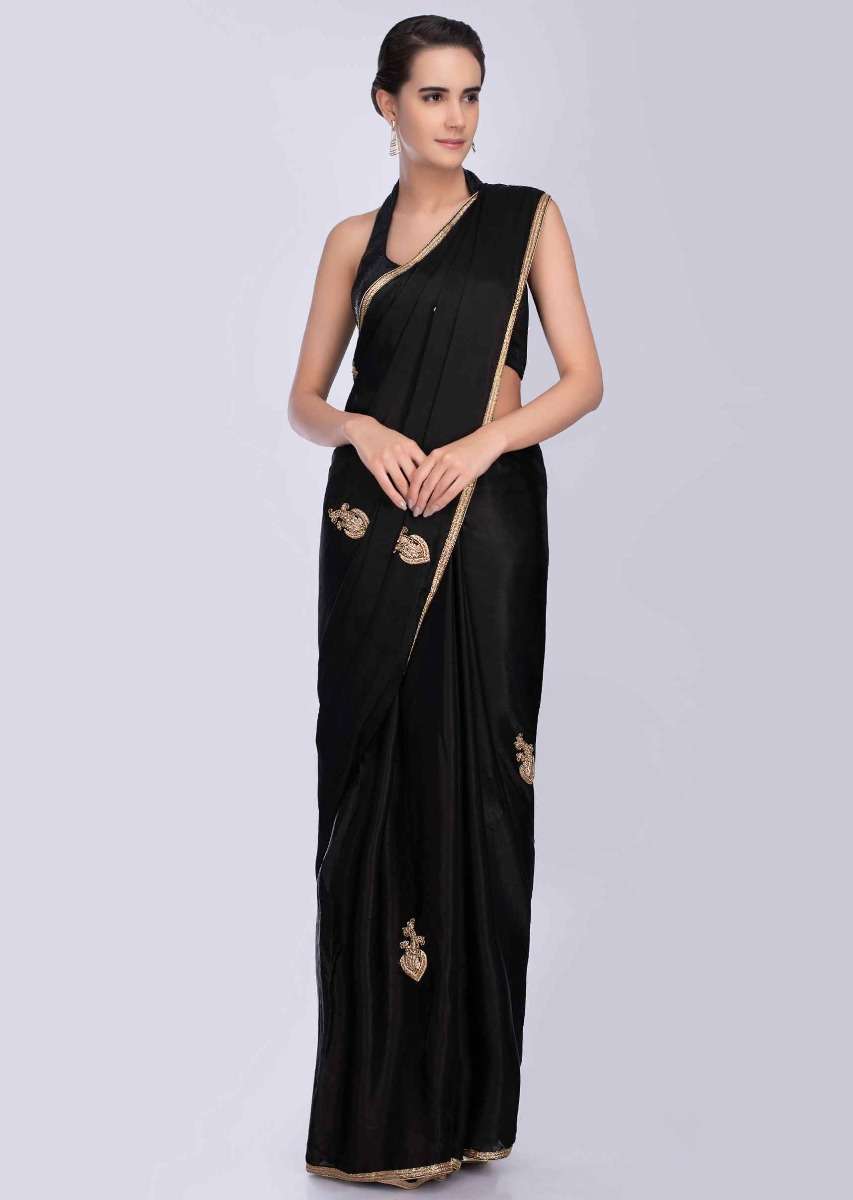 Blazzing black satin crepe saree with golden embroidered butti and border only on Kalki