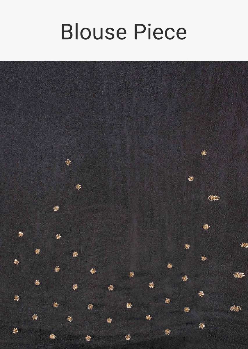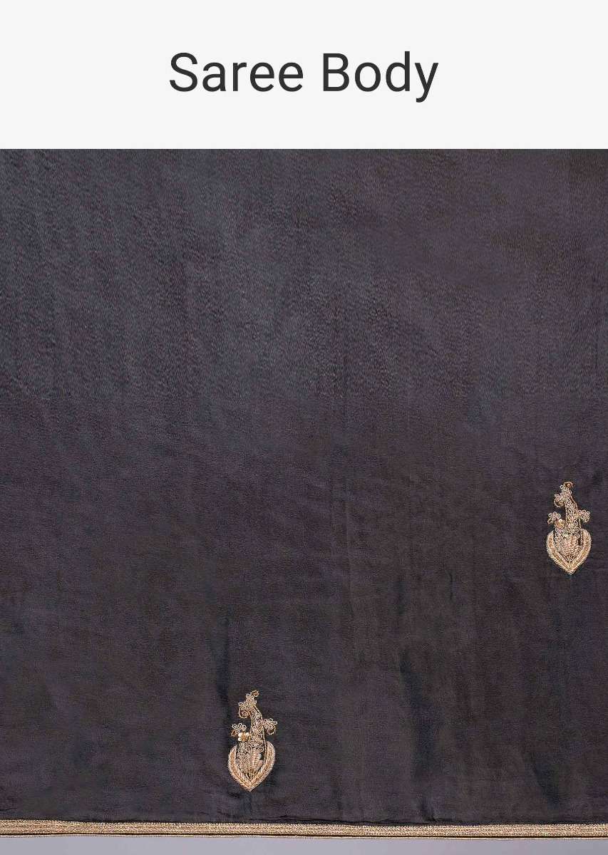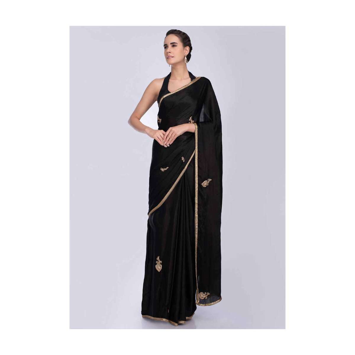Blazzing black satin crepe saree with golden embroidered butti and border only on Kalki