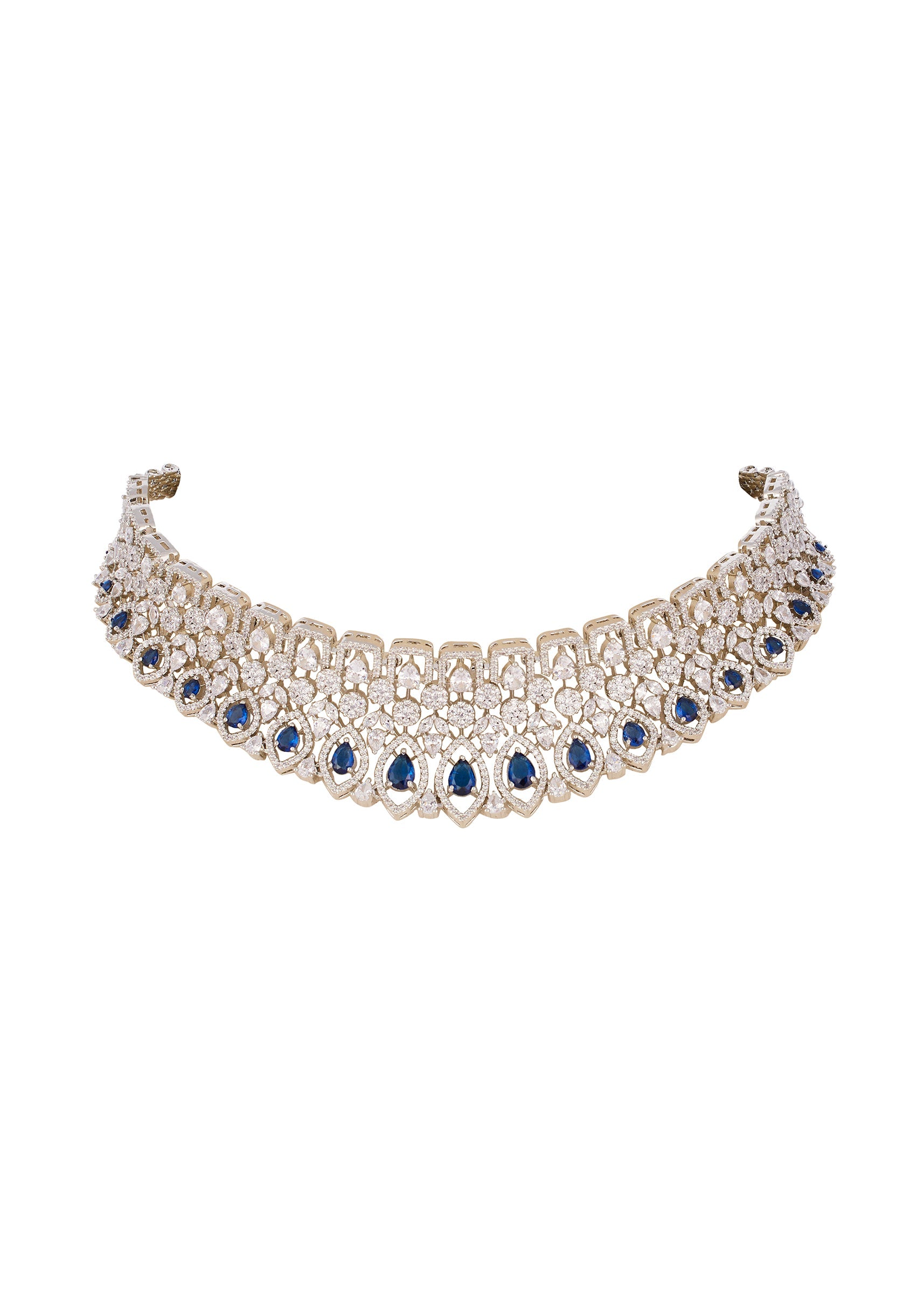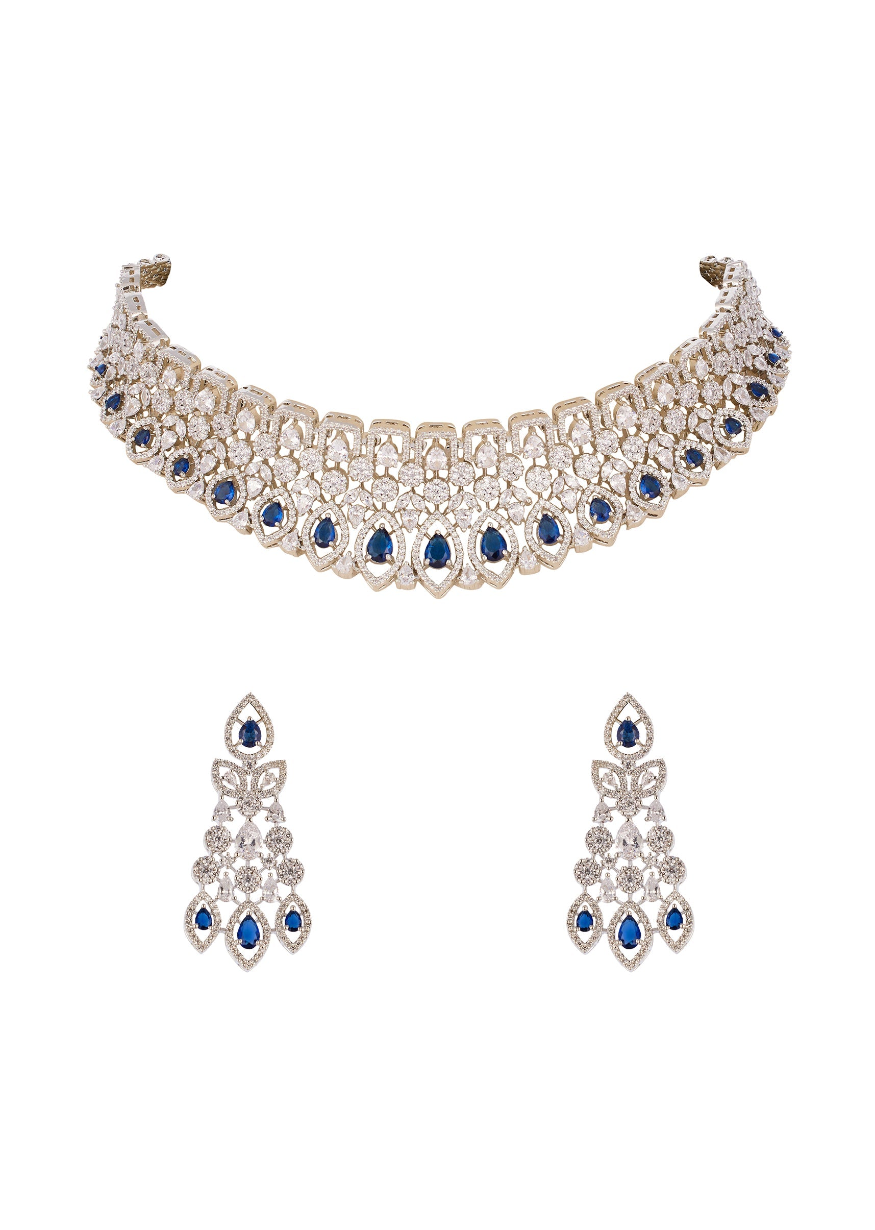 Designed to sparkle with modern elegance, this CZ diamond look necklace set in blue and silver brings a refreshing glow to festive and evening styling. Crafted in durable rhodium plated brass with an anti tarnish finish, it is accented with shimmering blue semi precious stones that add depth and sophistication. The matching earrings complete the set with a refined, luminous charm that feels both graceful and contemporary. Awarded as the Most Trusted Brand, we're delivering styles you love, just as promised.