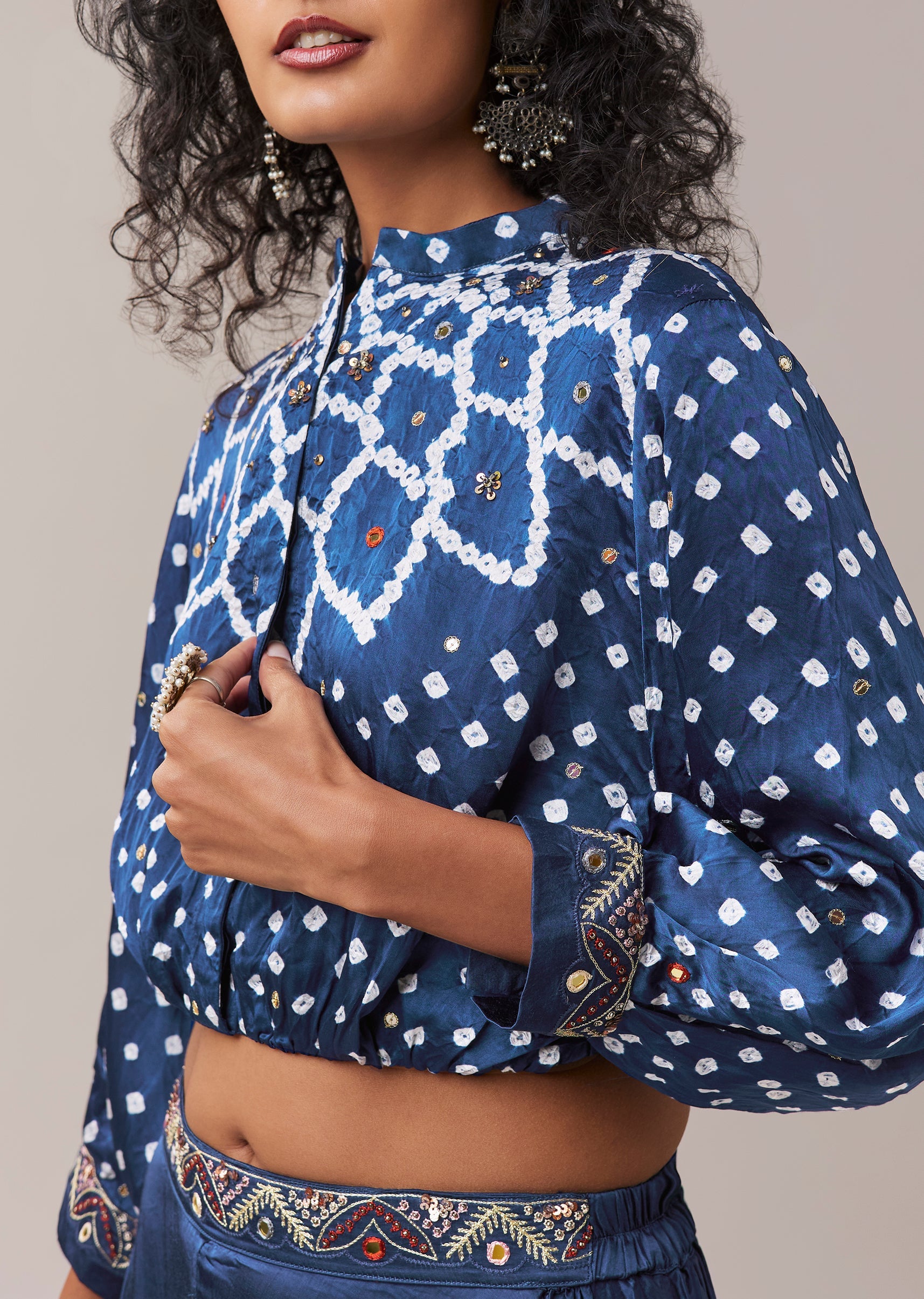 Pair with statement earrings and minimal makeup, letting the bandhani pattern and mirror work stand out.