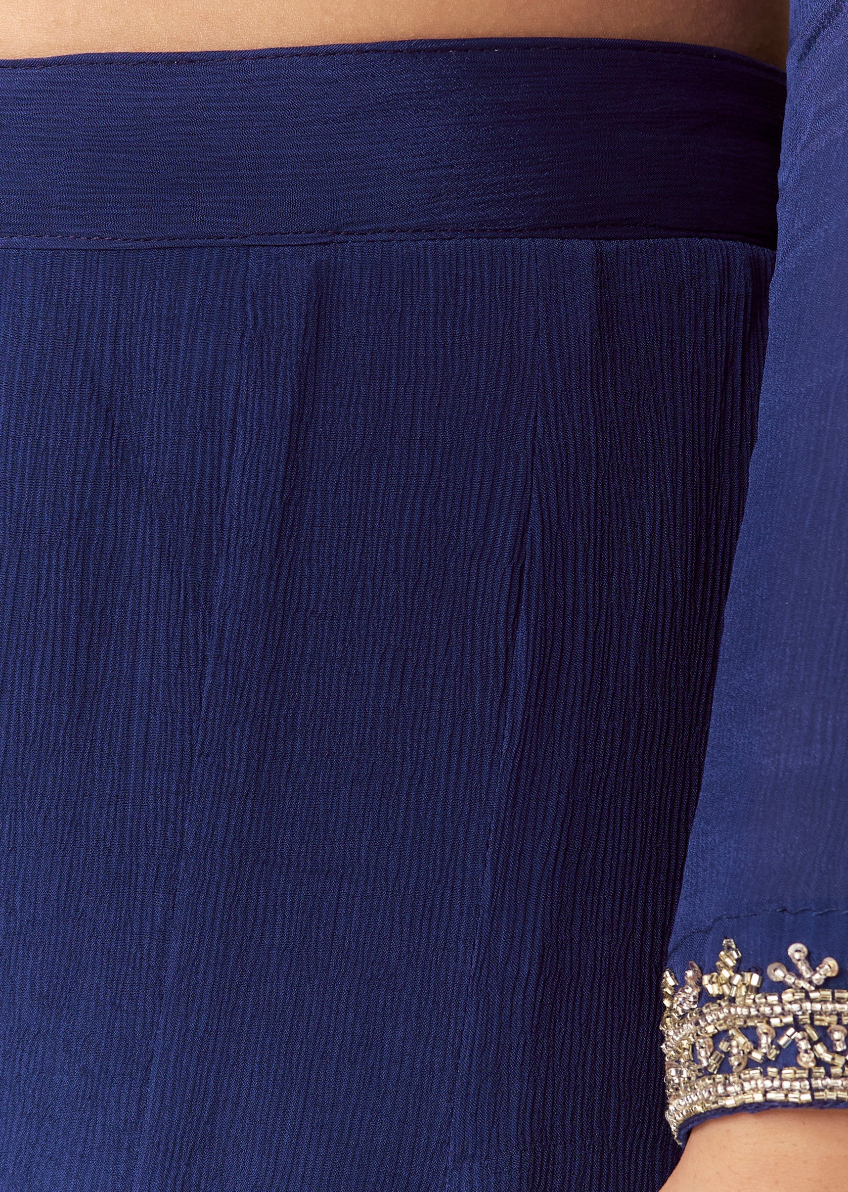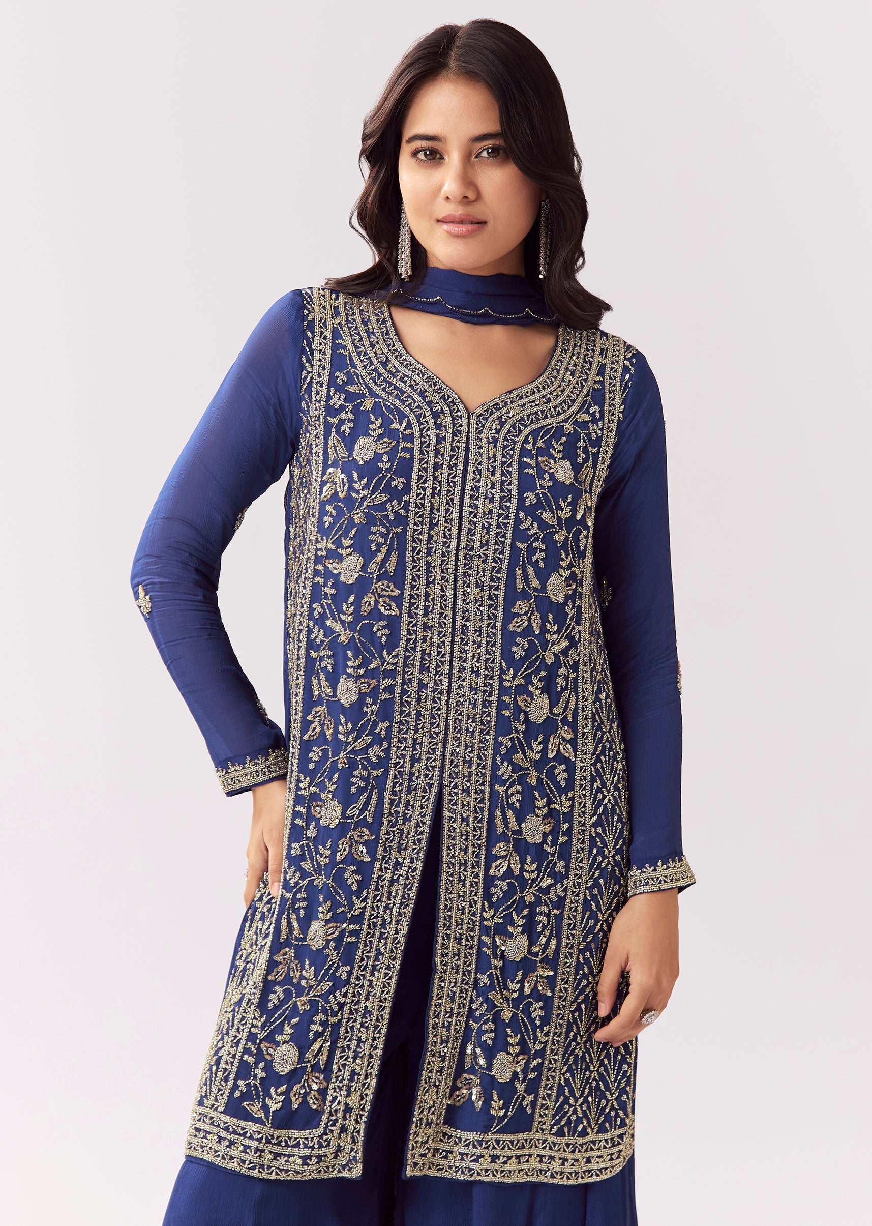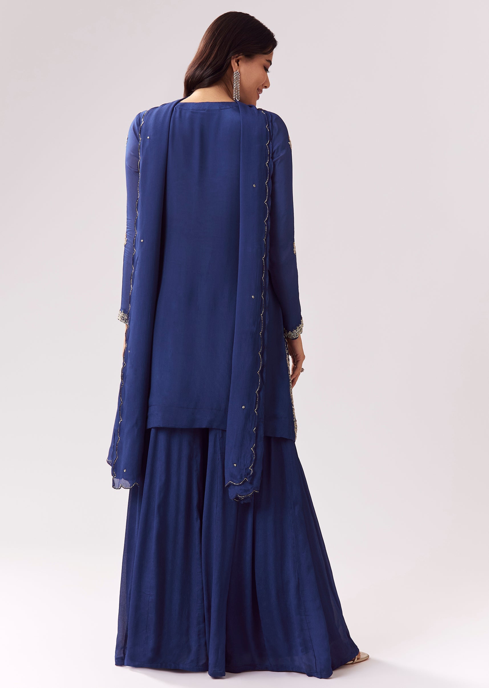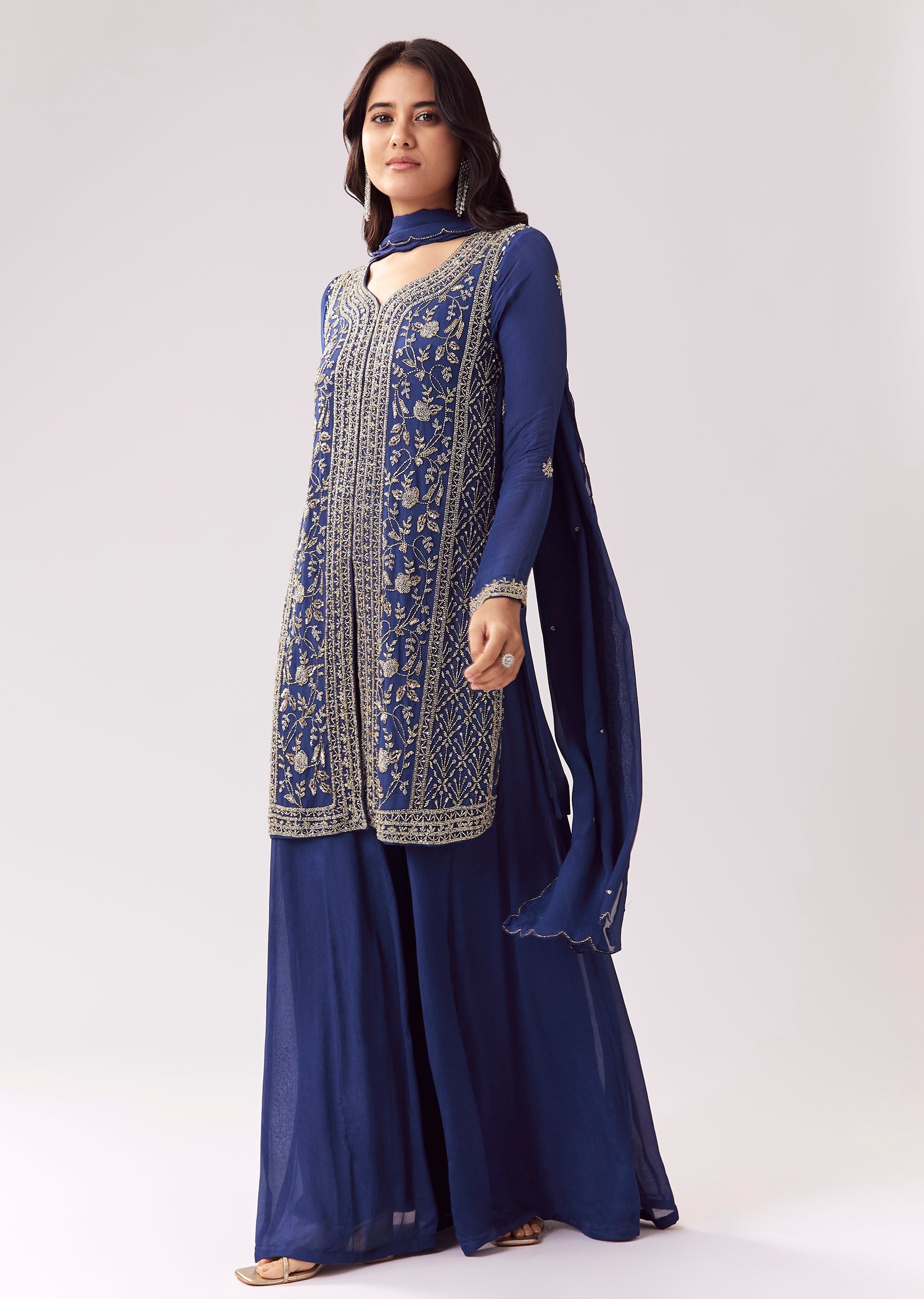 This palazzo suit is designed for festive and mehendi functions with a vibrant blue tone. The chinon kurta features cut-dana and beadwork detailing for sparkle and texture. Full sleeves balance... More Product Details