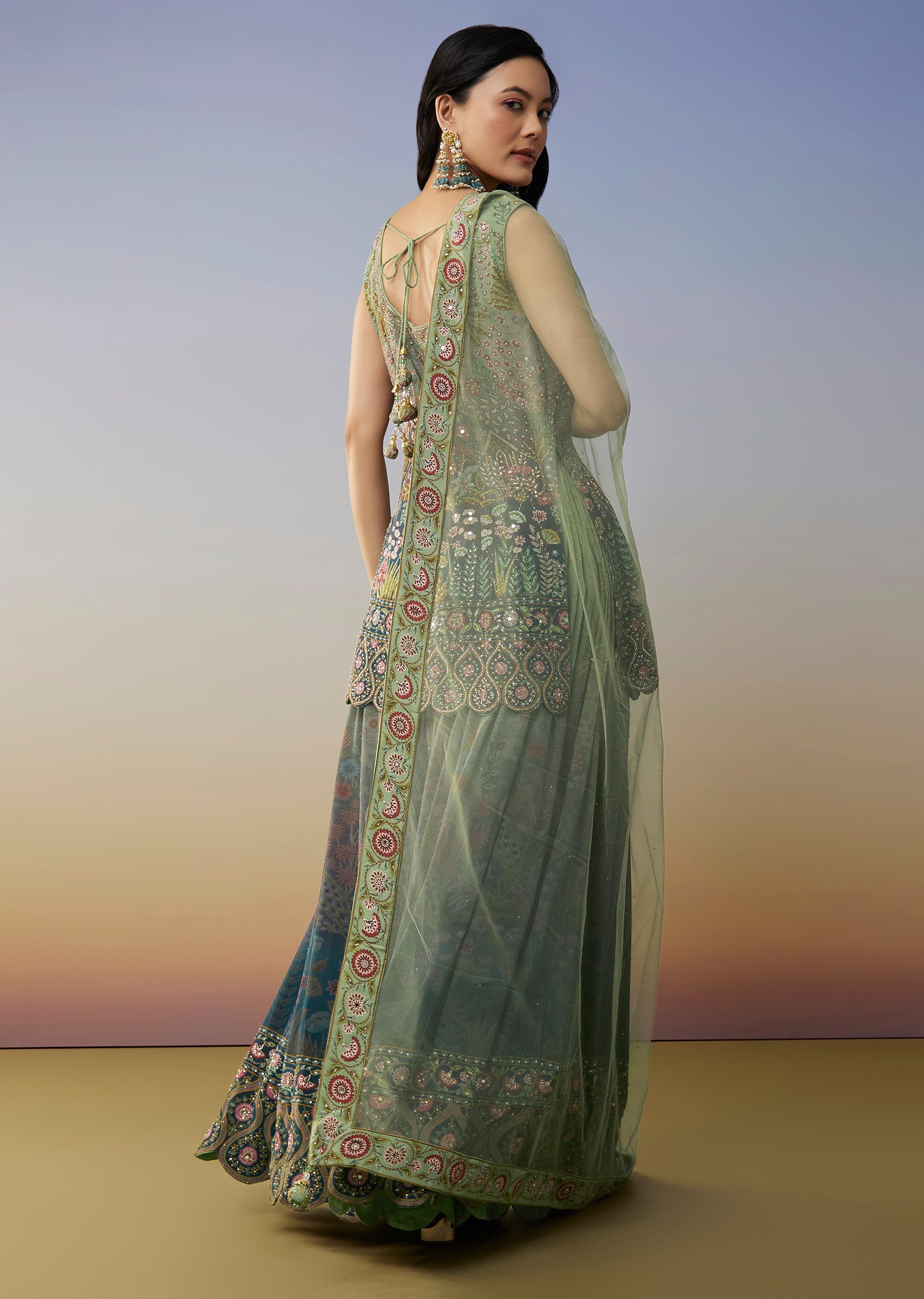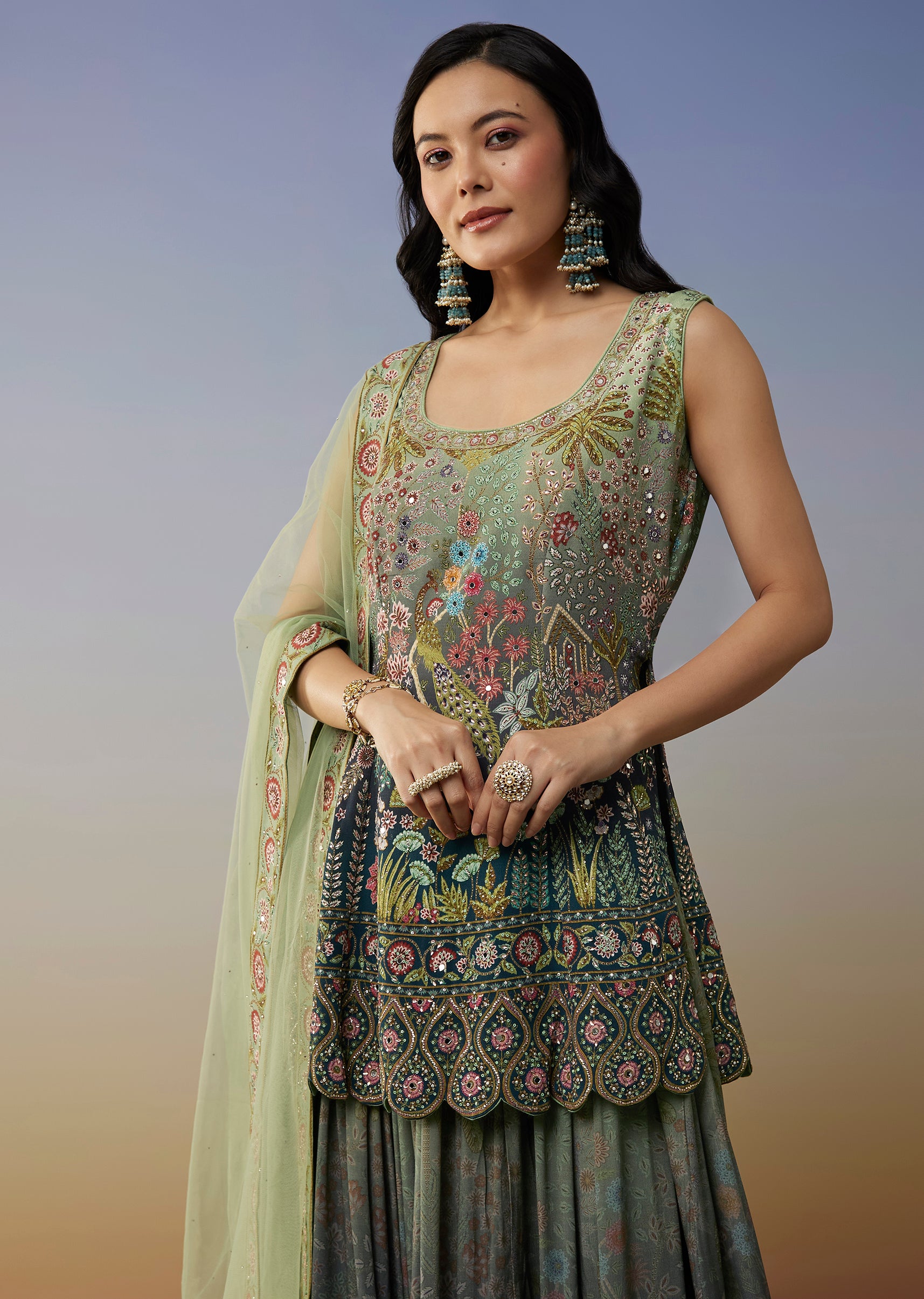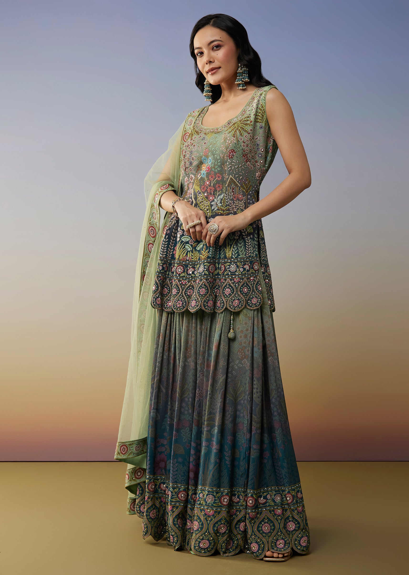 This blue palazzo suit features an ombré series blending shades of blue and green for a refreshing festive look. Designed in a straight style it comes with a coordinated dupatta... More Product Details