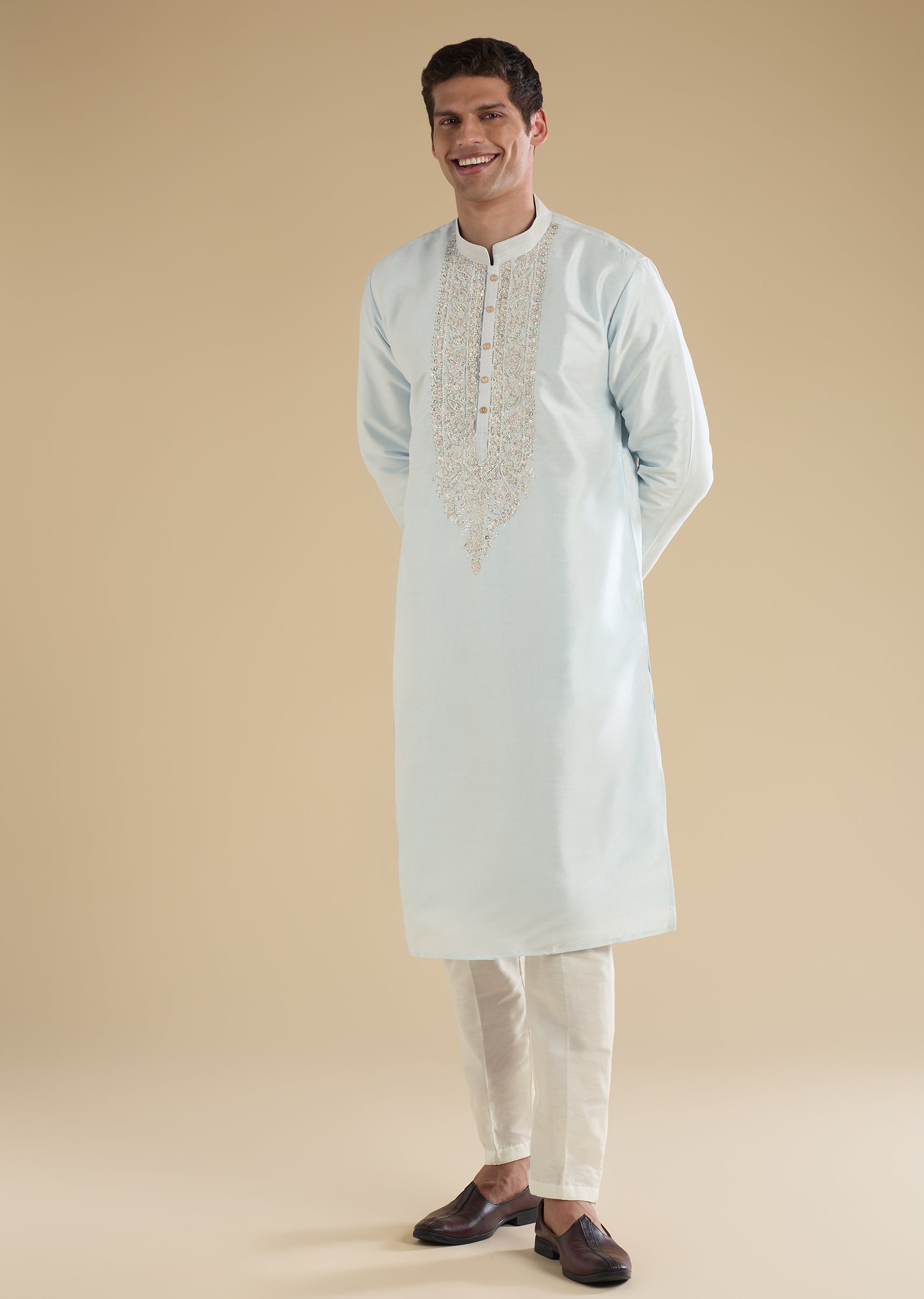 A classic blue kurta set in art silk, detailed with subtle resham, sequin, and bead accents for festive wear. Styled with a mandarin collar, full sleeves, and front button closure,... More Product Details