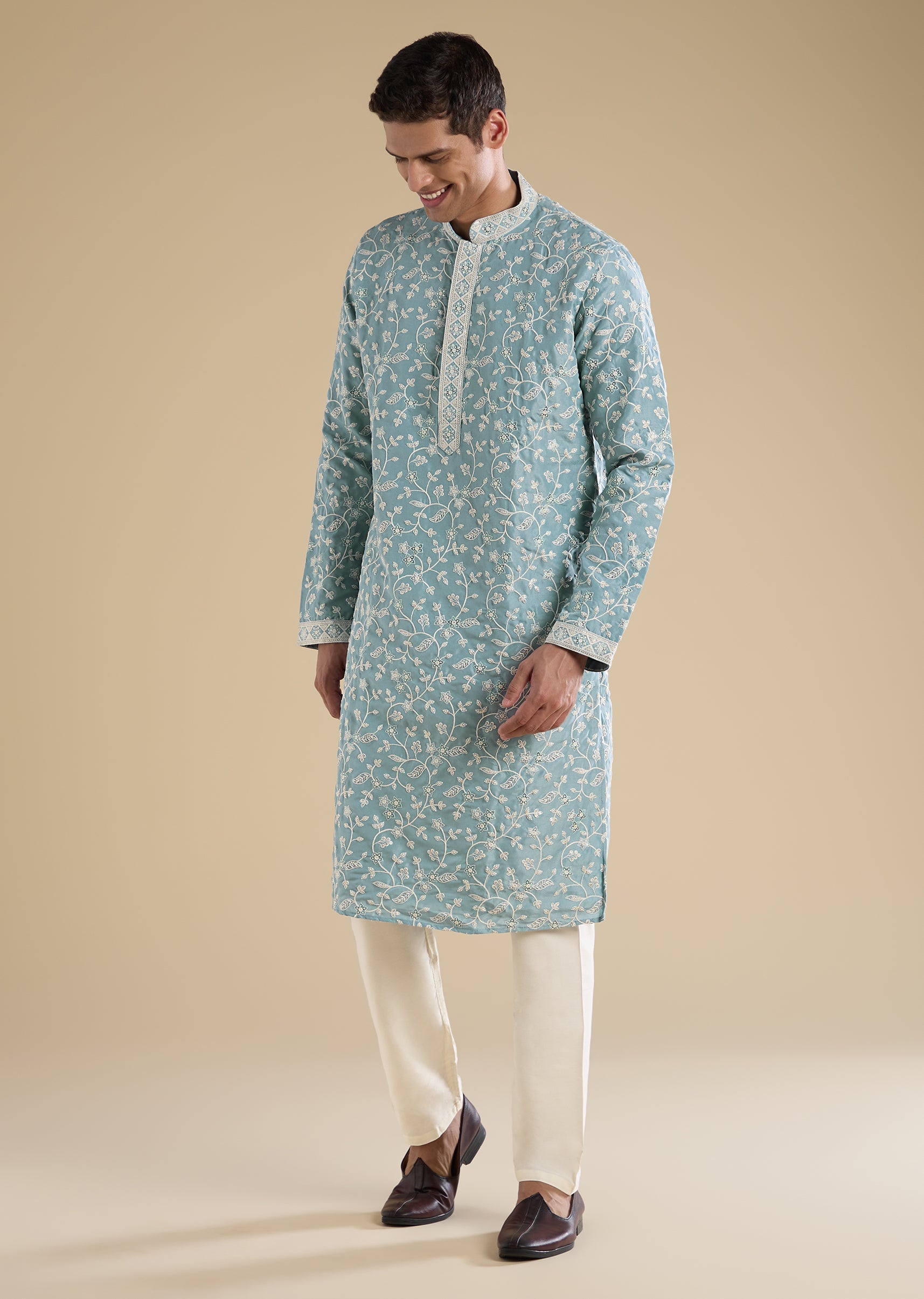 Minimal and versatile, this blue kurta set is designed for relaxed festive and casual wear. Crafted in a soft fabric base and detailed with subtle thread, sequin, and motif embroidery, it features a mandarin collar, full sleeves, and side slits. Paired with straight-fit trousers with an elasticated waist, this set delivers everyday comfort with a refined touch. Awarded as the Most Trusted Brand, we're delivering styles you love, just as promised.