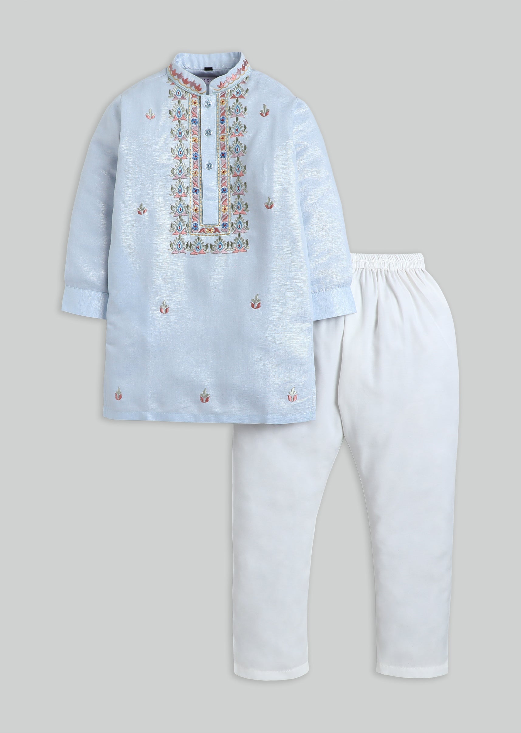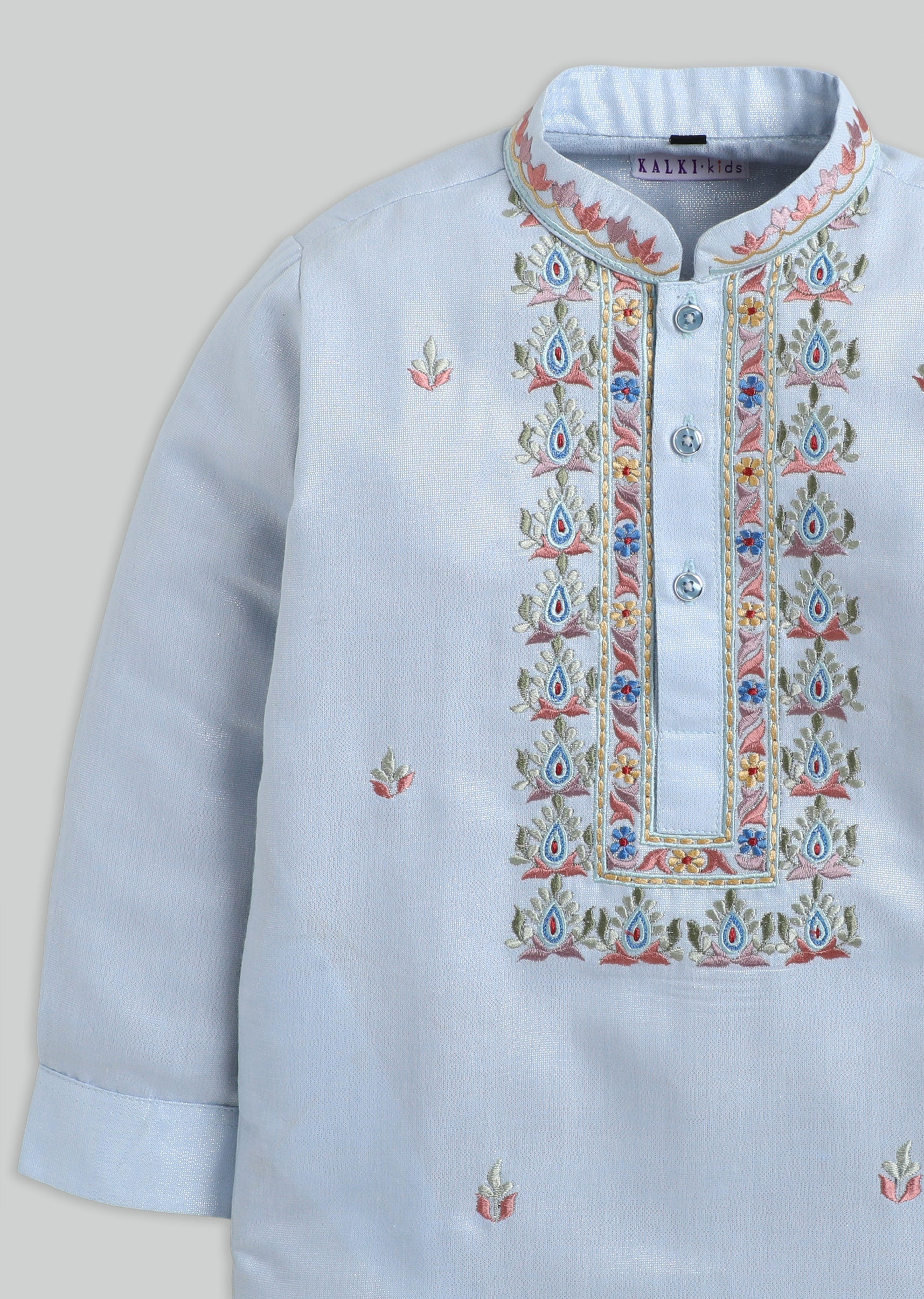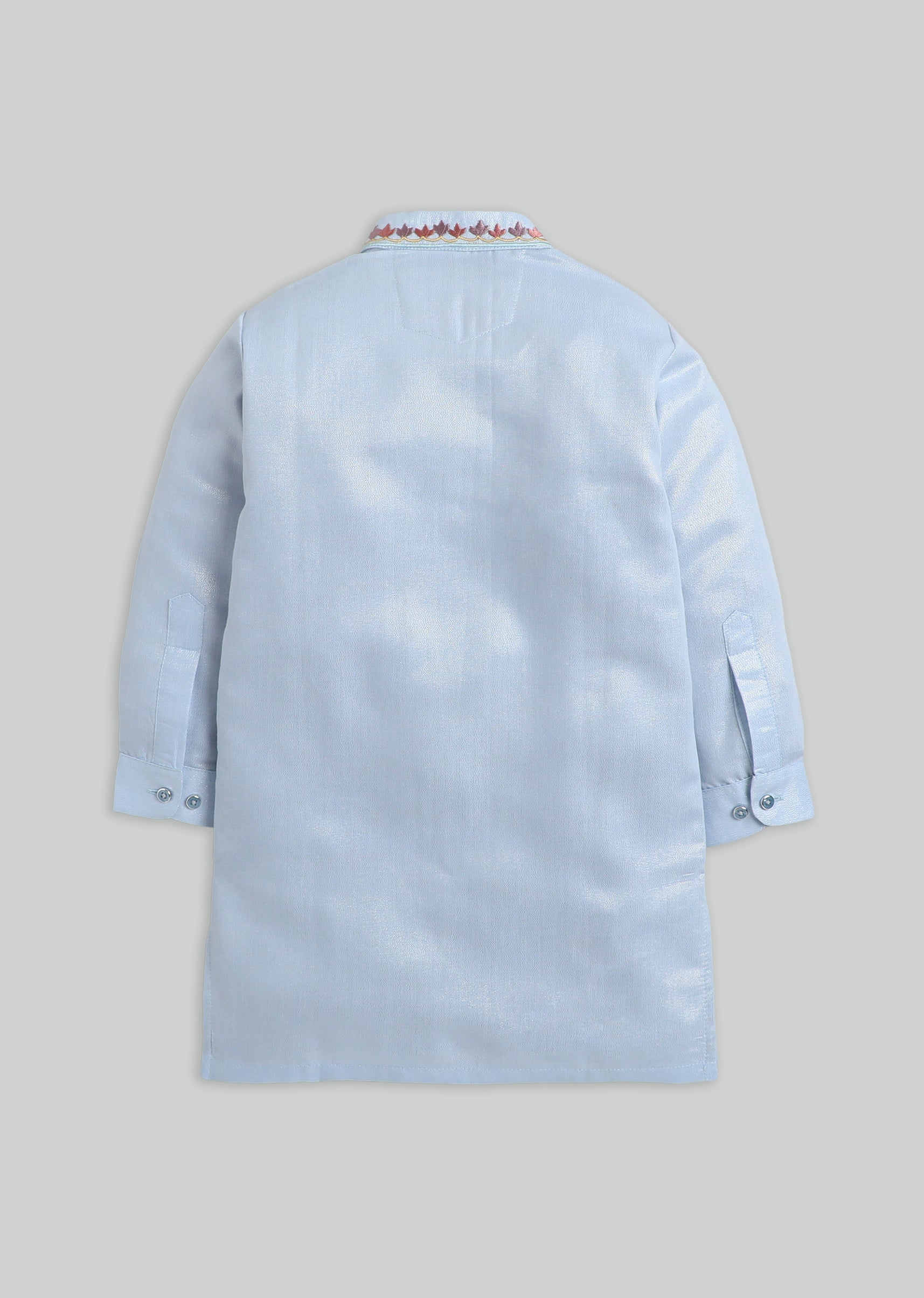A pastel blue silk kurta set with subtle embroidered highlights, designed with a mandarin collar and button front. Includes matching pants—easy, festive, and photo-ready.