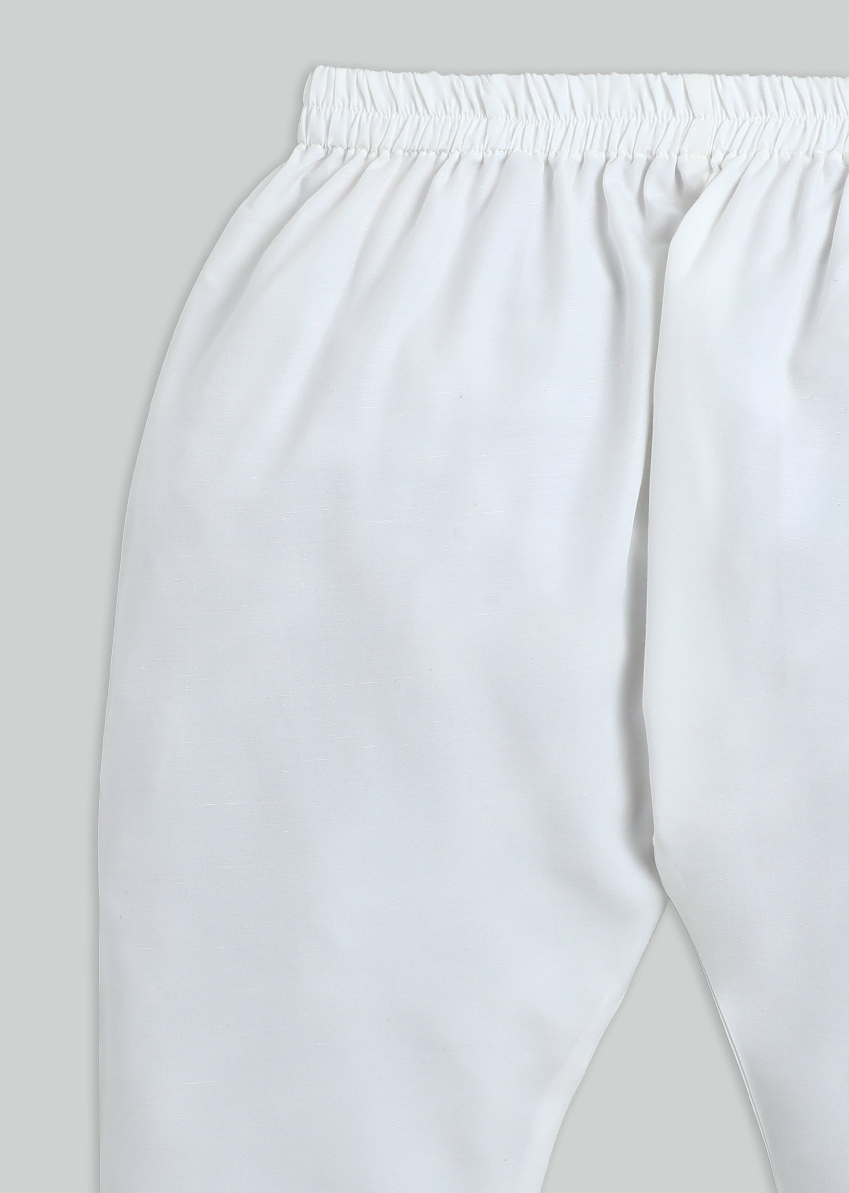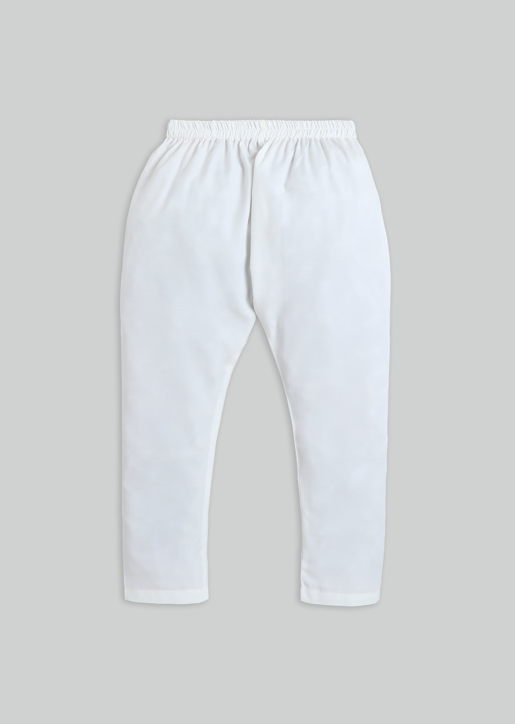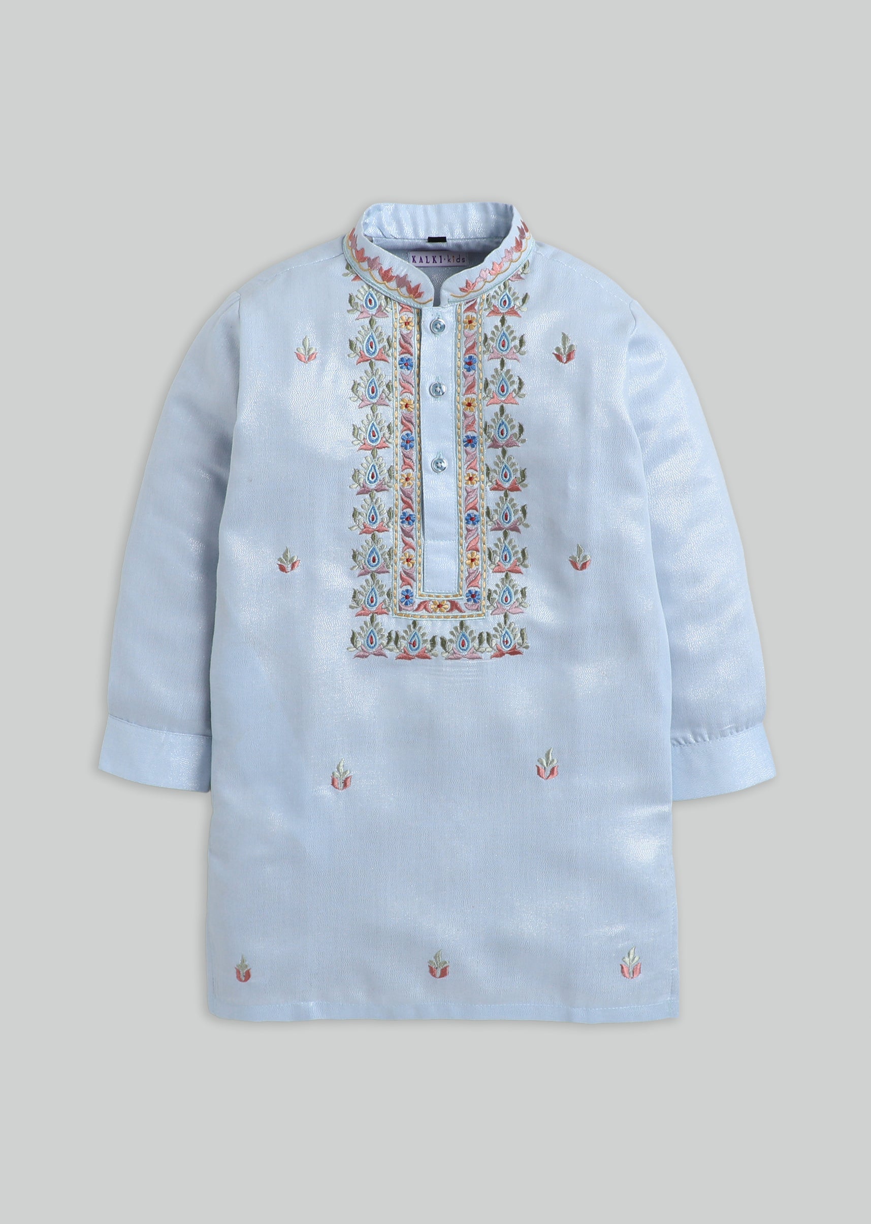 A pastel blue silk kurta set with subtle embroidered highlights, designed with a mandarin collar and button front. Includes matching pants—easy, festive, and photo-ready.