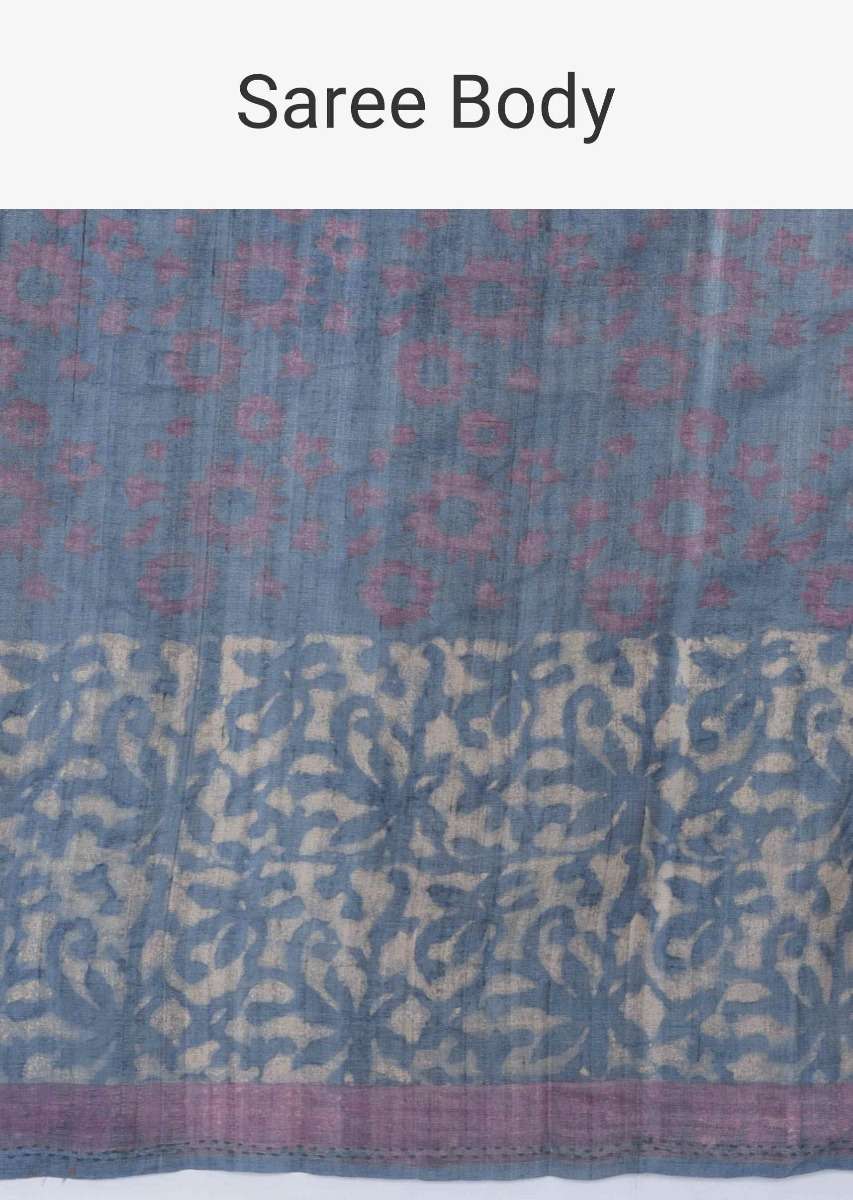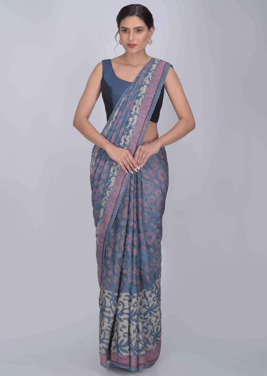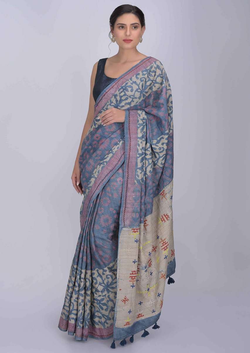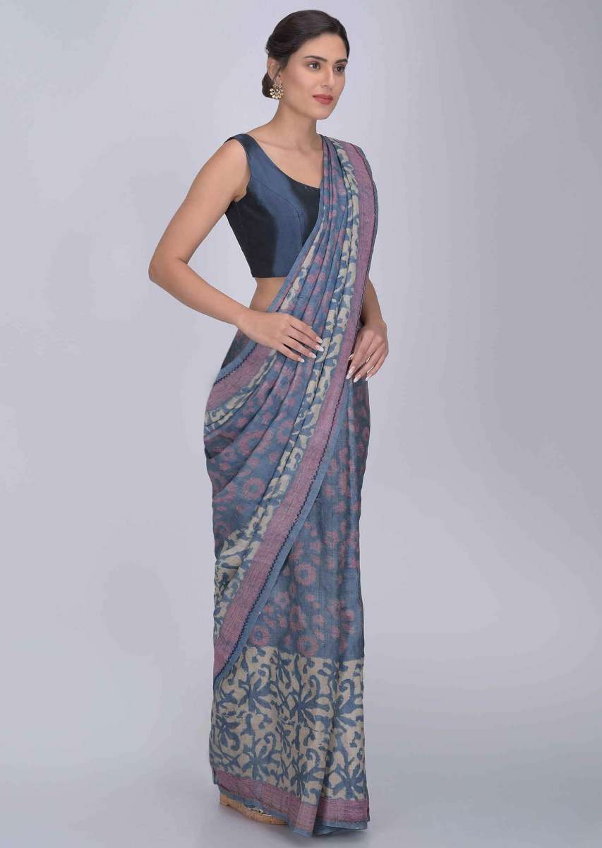 Blue Gray Saree In Tussar Silk With Batik Print Online - Kalki Fashion