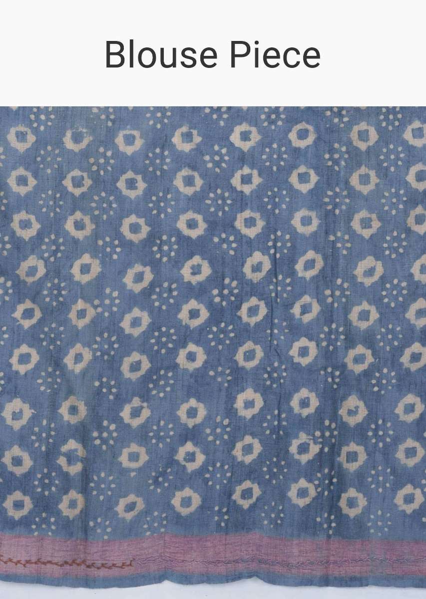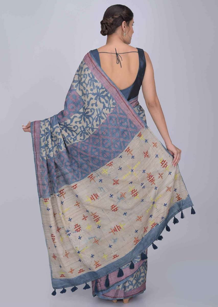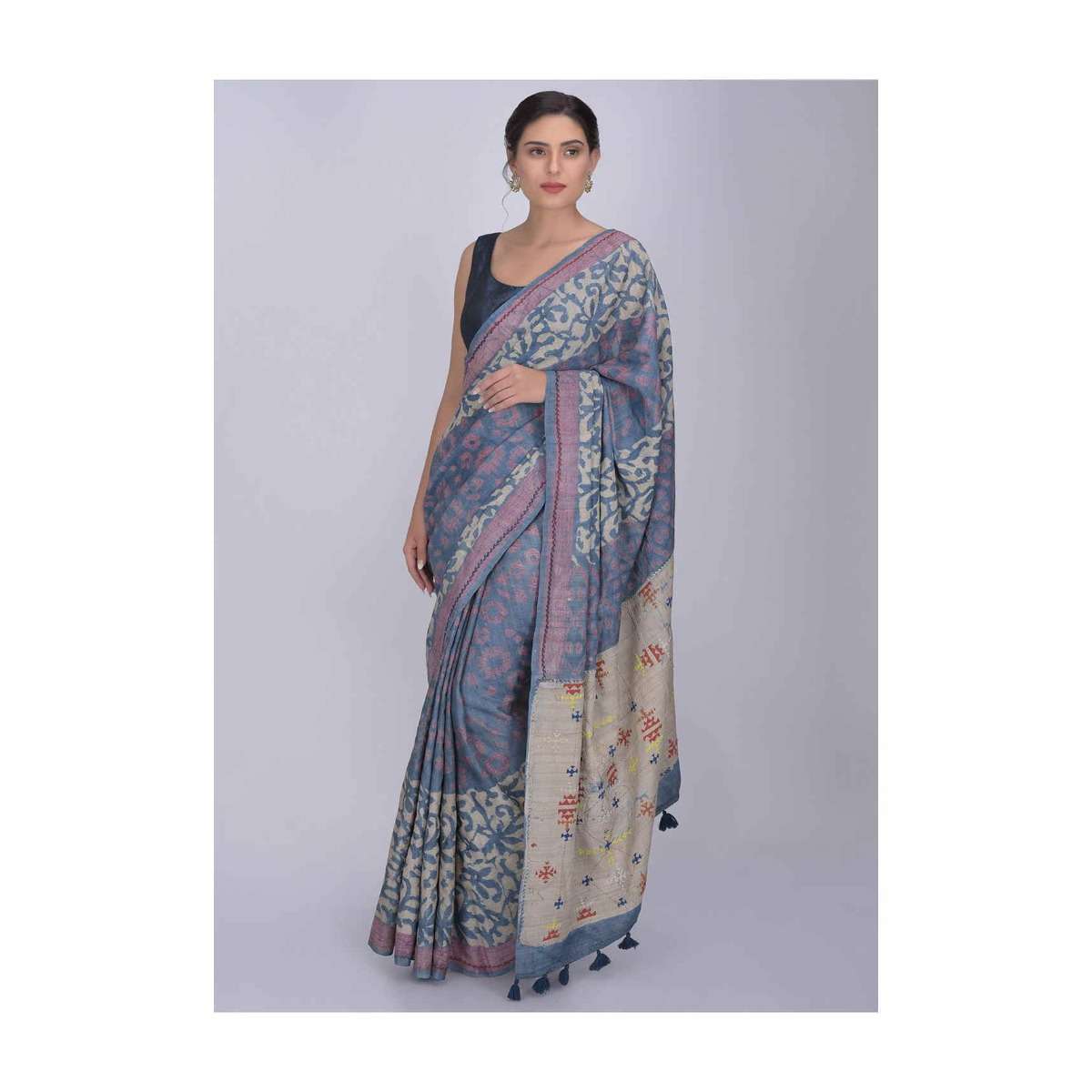 Blue Gray Saree In Tussar Silk With Batik Print Online - Kalki Fashion