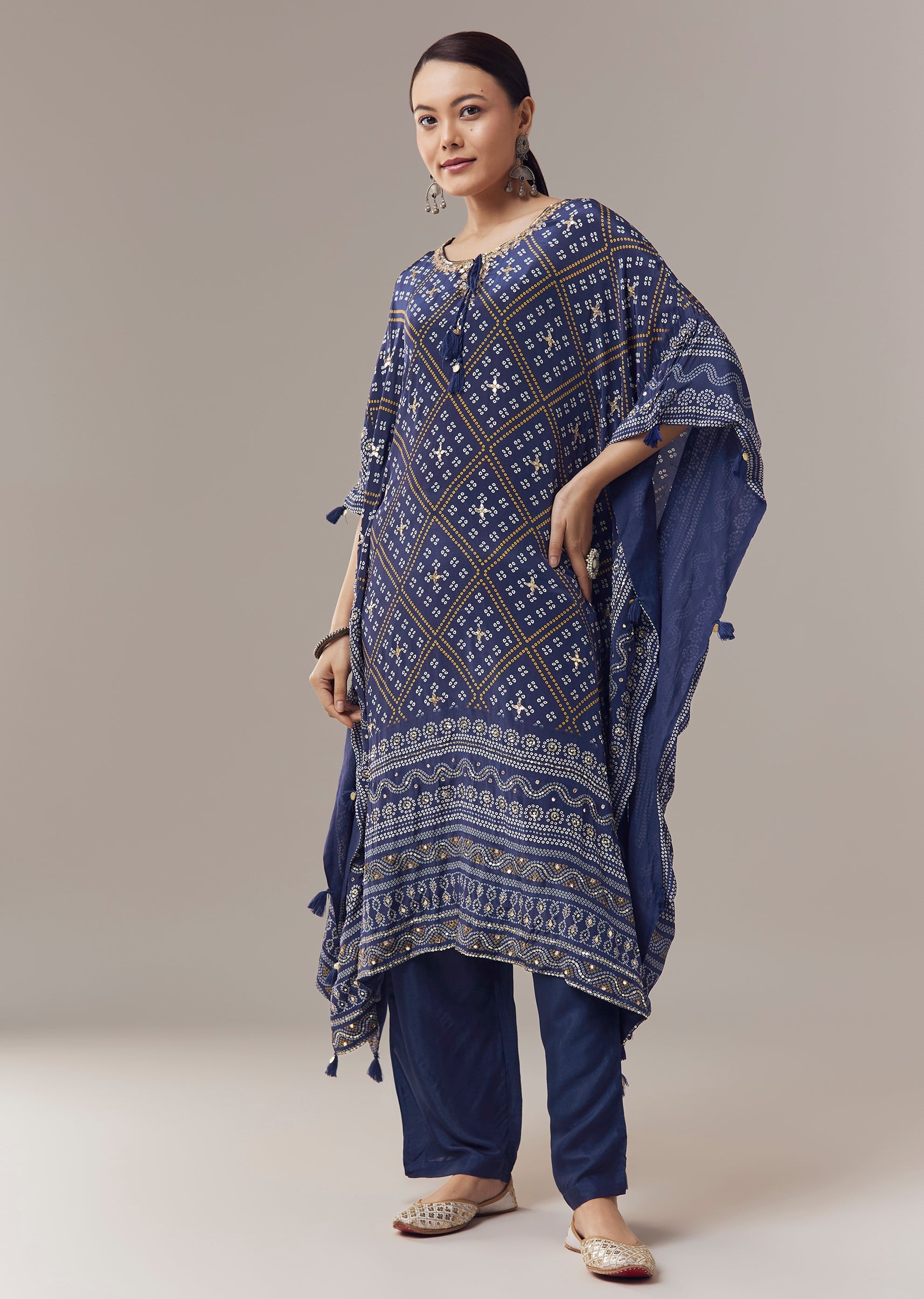 Vibrant and festive, this blue kaftan kurti is crafted in soft crepe fabric for a comfortable and elegant look. The asymmetric silhouette is adorned with colorful bandhani prints and delicate gotta work, adding subtle texture and festive charm. Featuring flared sleeves and a keyhole neckline, it creates a graceful ensemble perfect for daytime celebrations and festive gatherings. Awarded as the Most Trusted Brand, we're delivering styles you love, just as promised.