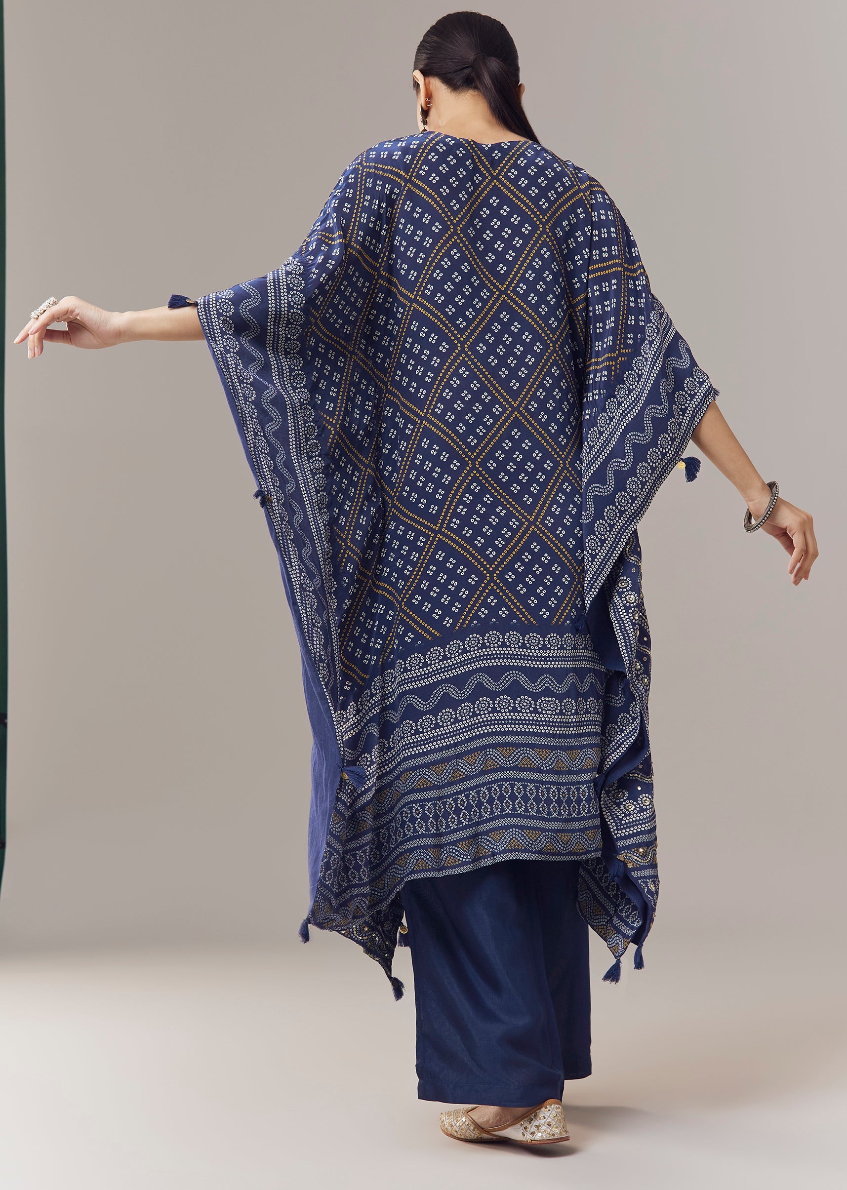 Blue Kaftan Kurti In Bandhani Print With Gotta Work