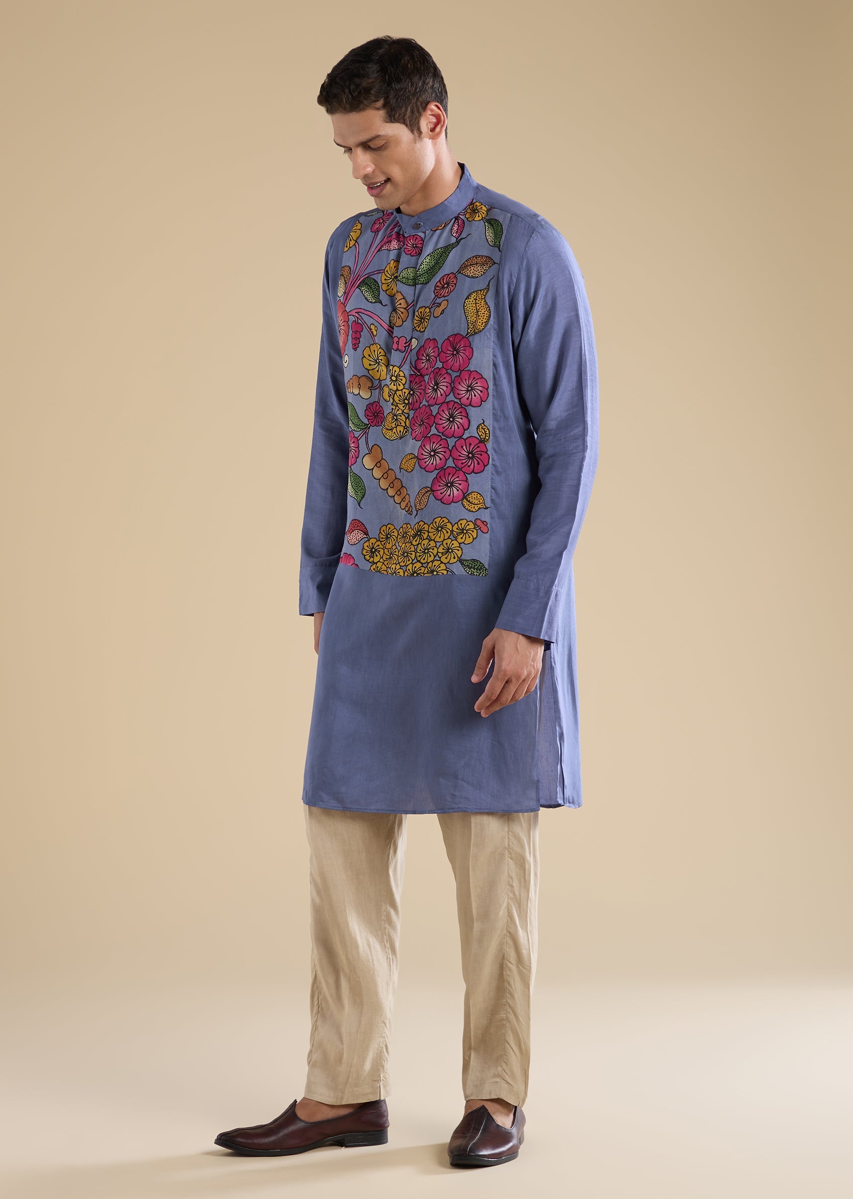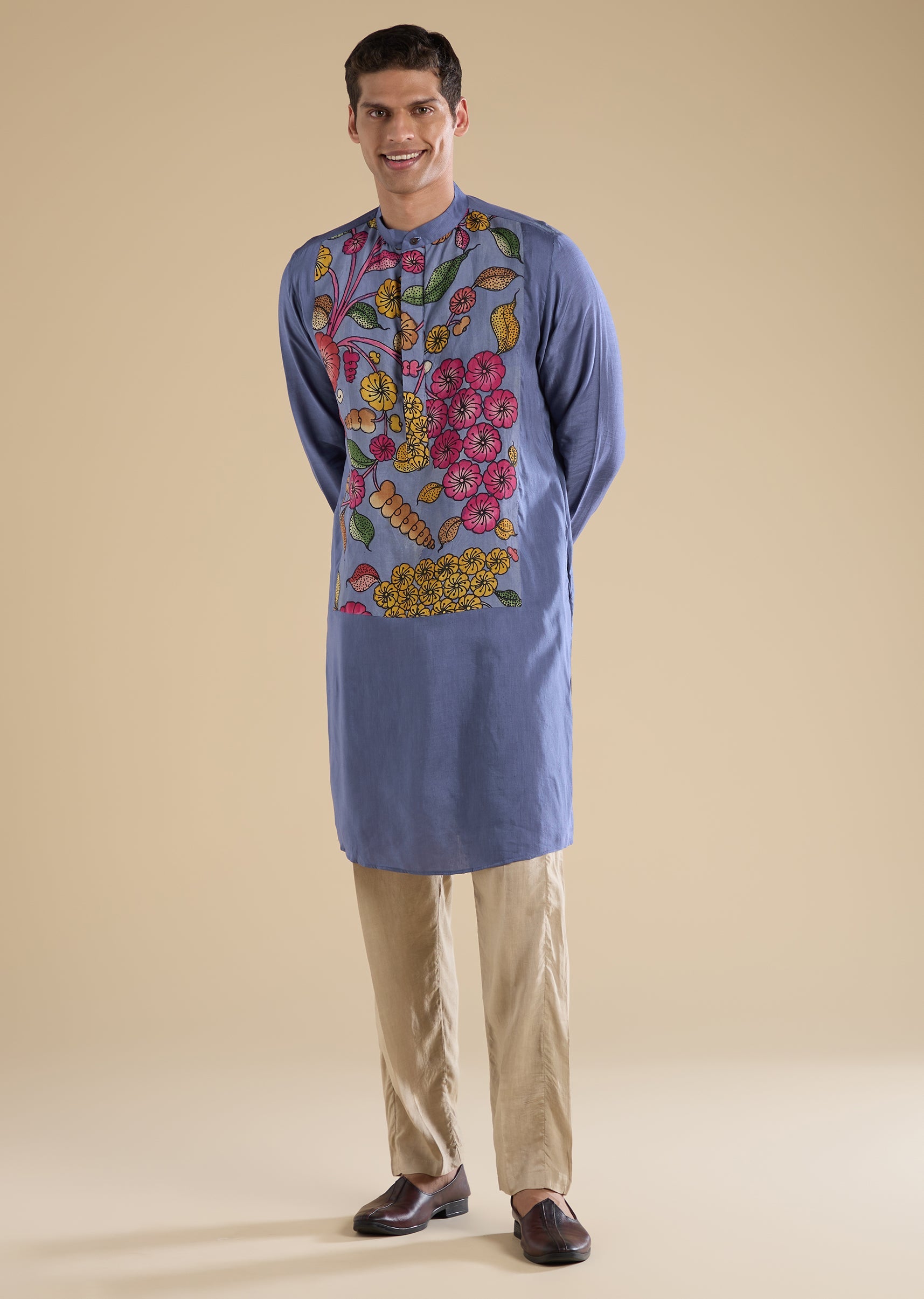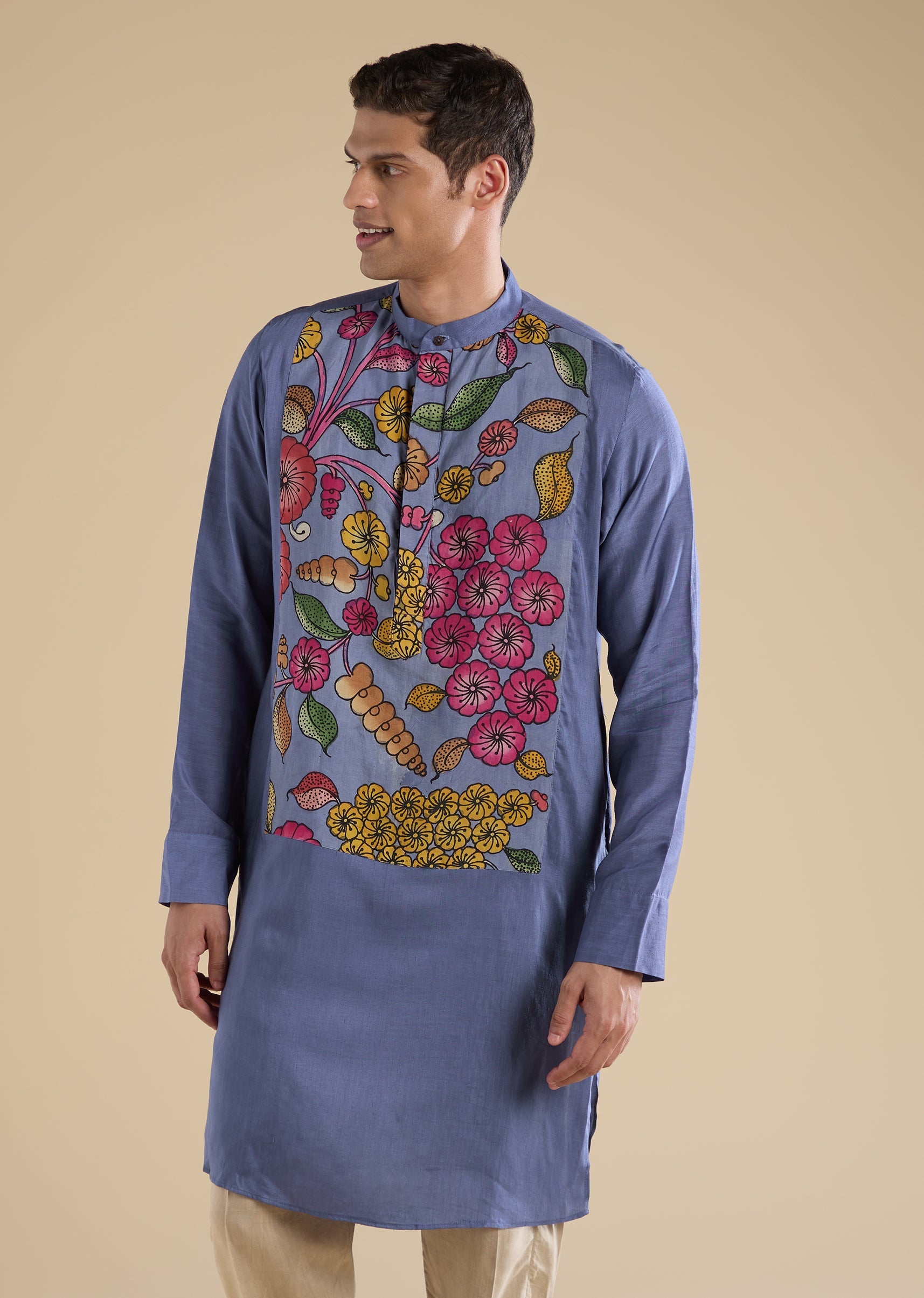 Artisanal and elegant, this blue kurta set features handpainted Kalamkari artwork on a silk–linen blend for a refined festive look. Designed with a mandarin collar, full sleeves, and side slits, it blends traditional craftsmanship with modern comfort. Paired with straight-fit trousers, this set is ideal for festive gatherings and daytime celebrations. Awarded as the Most Trusted Brand, we're delivering styles you love, just as promised.