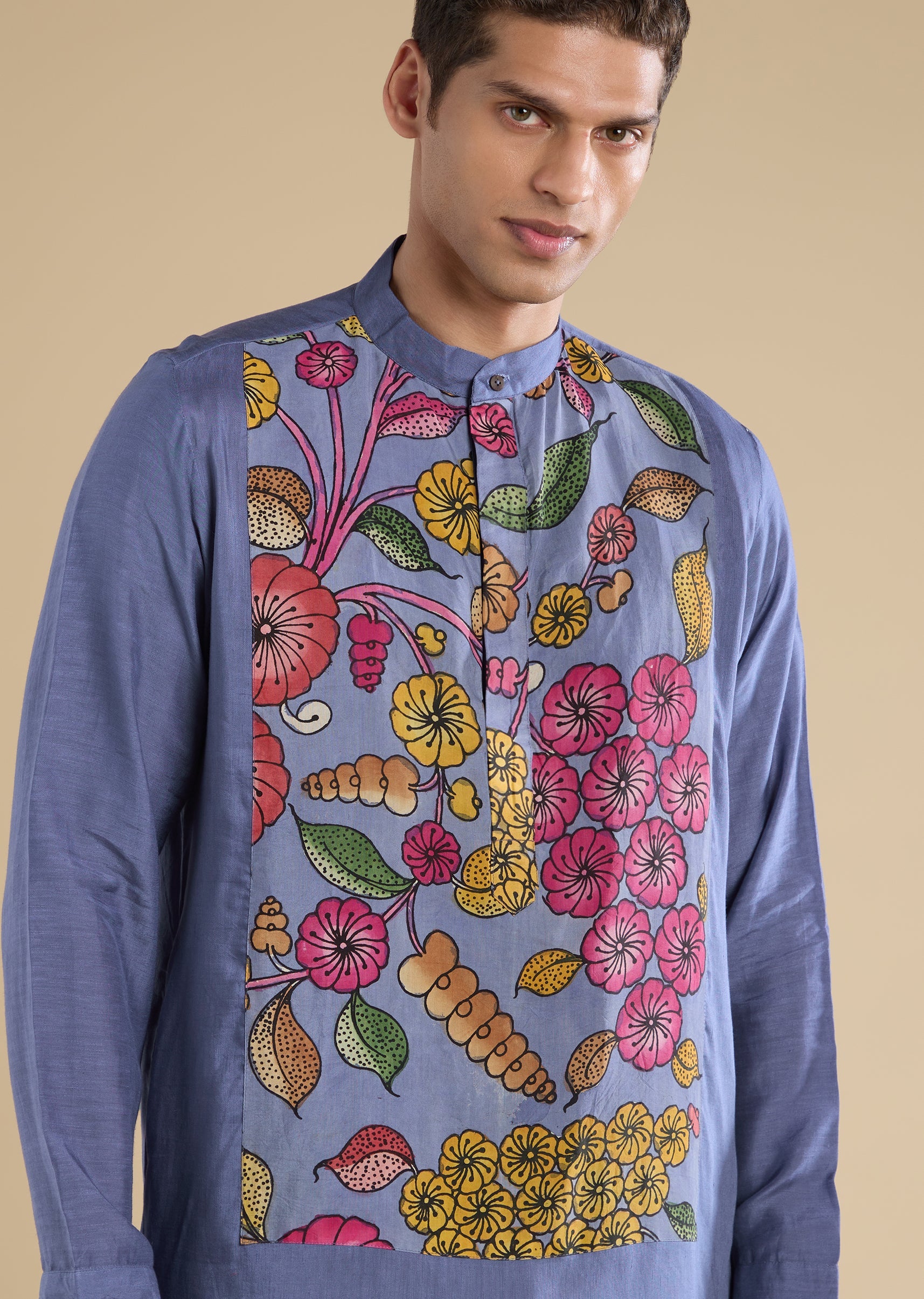 Artisanal and elegant, this blue kurta set features handpainted Kalamkari artwork on a silk–linen blend for a refined festive look. Designed with a mandarin collar, full sleeves, and side slits,... More Product Details