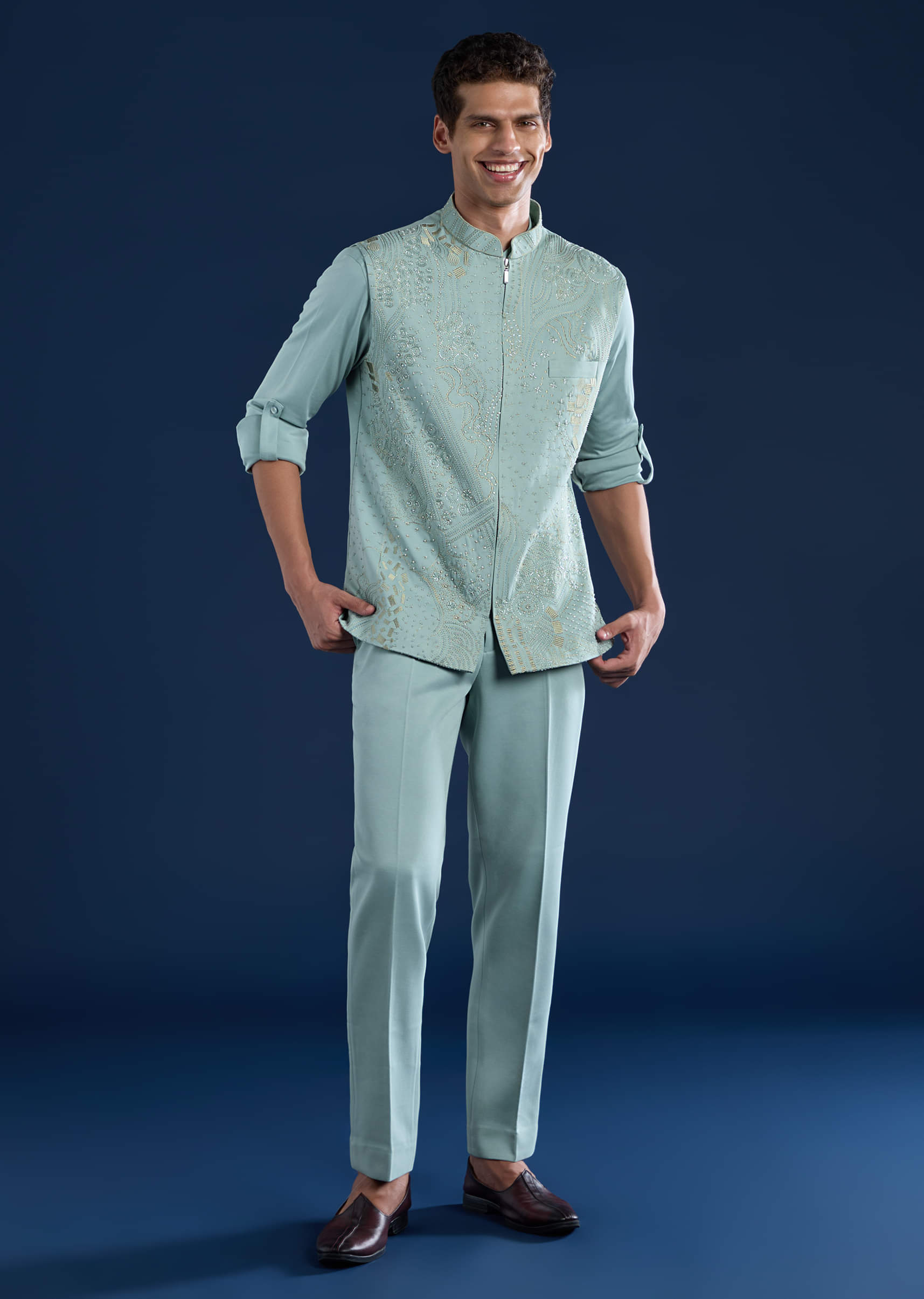 Blue Mens Cutdana Work Jacket Kurta and Pant Set