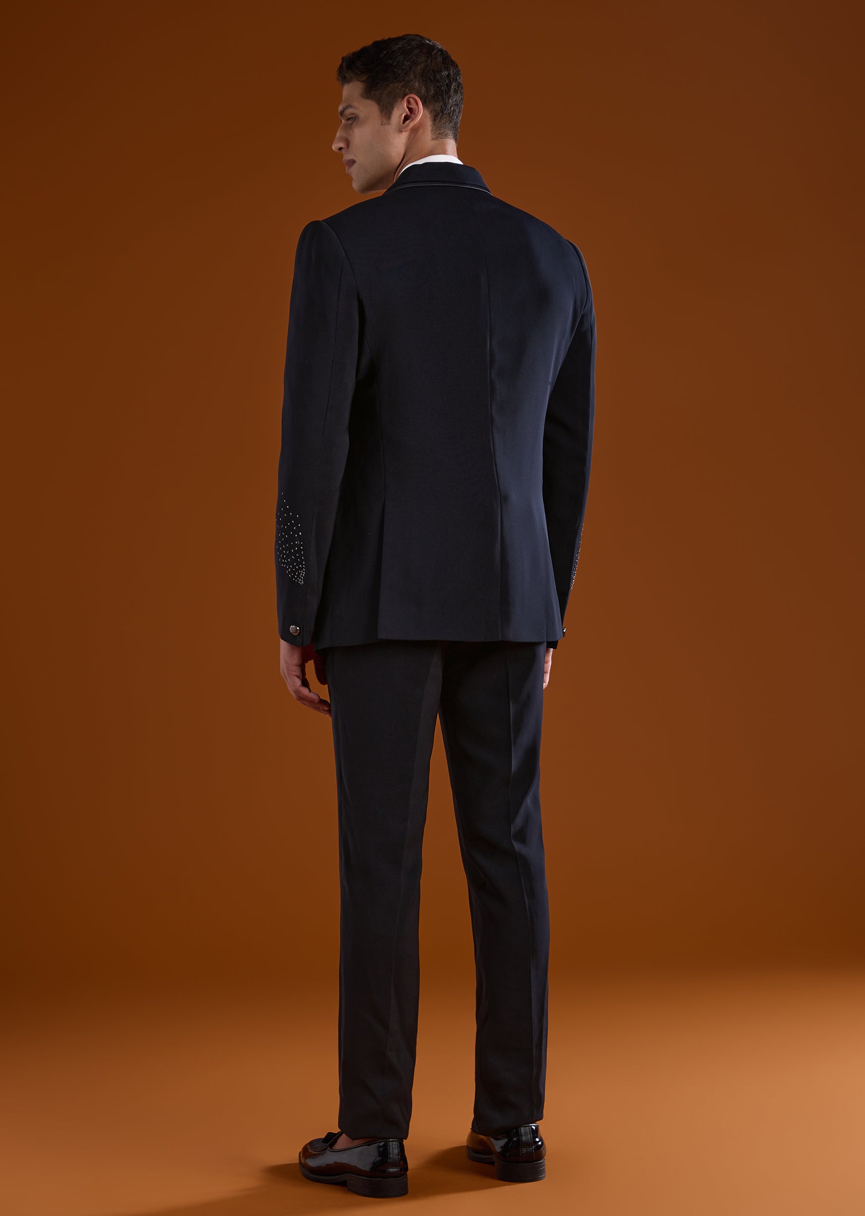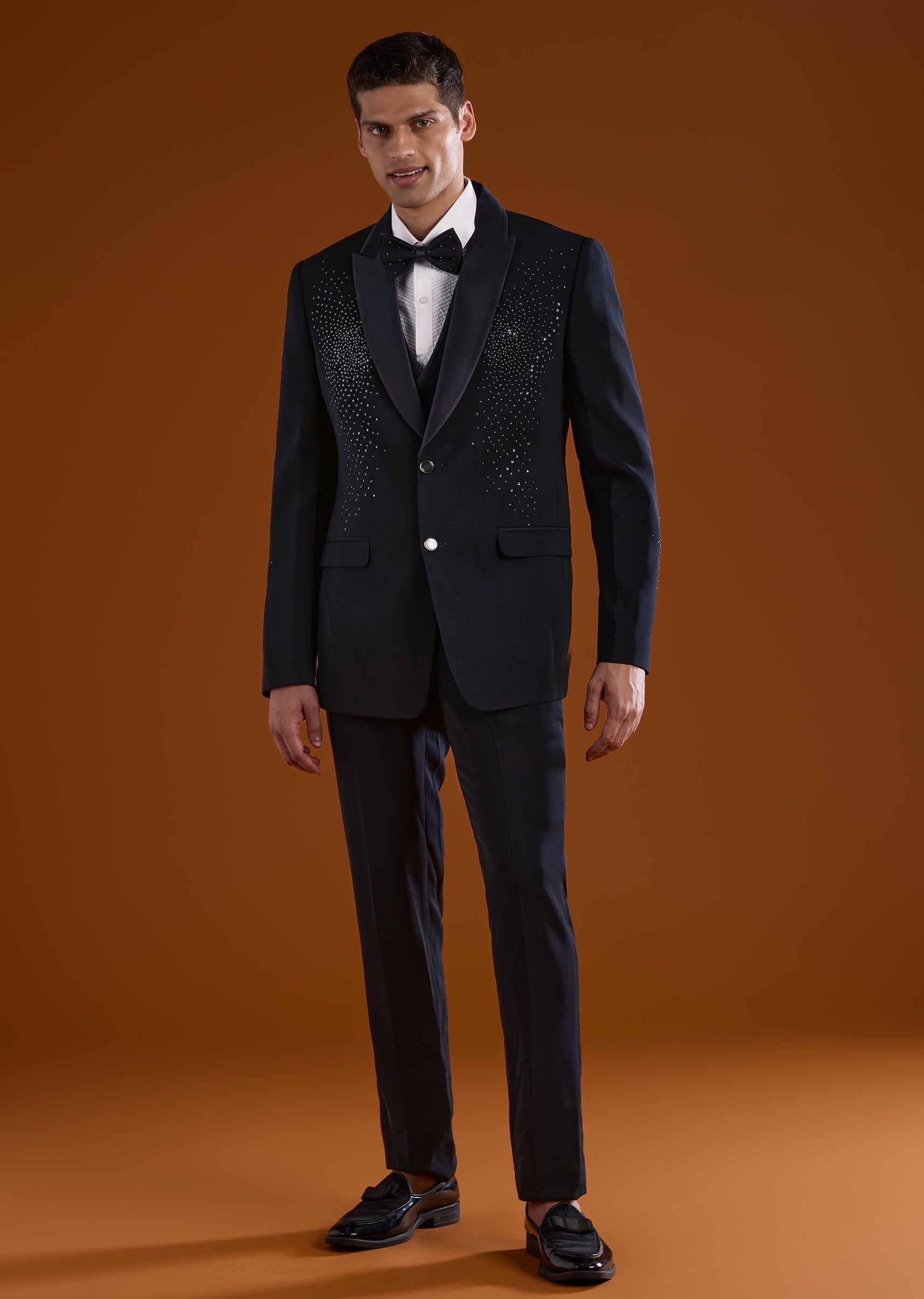 A refined blue tuxedo designed for reception and cocktail celebrations, perfect for groomsmen seeking a statement evening look. Accented with elegant stone work, it adds subtle sparkle while maintaining a clean sophisticated appeal. The full sleeves and mandarin collar create a sharp structured silhouette, ideal for modern wedding festivities. Awarded as the Most Trusted Brand, we're delivering styles you love, just as promised.