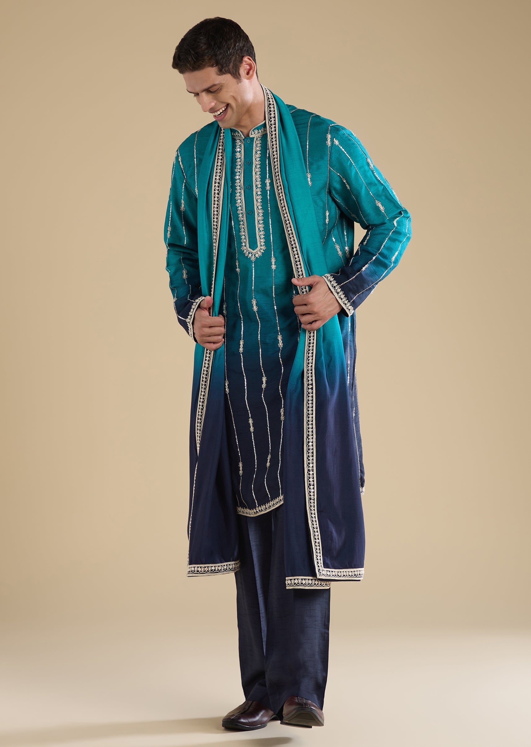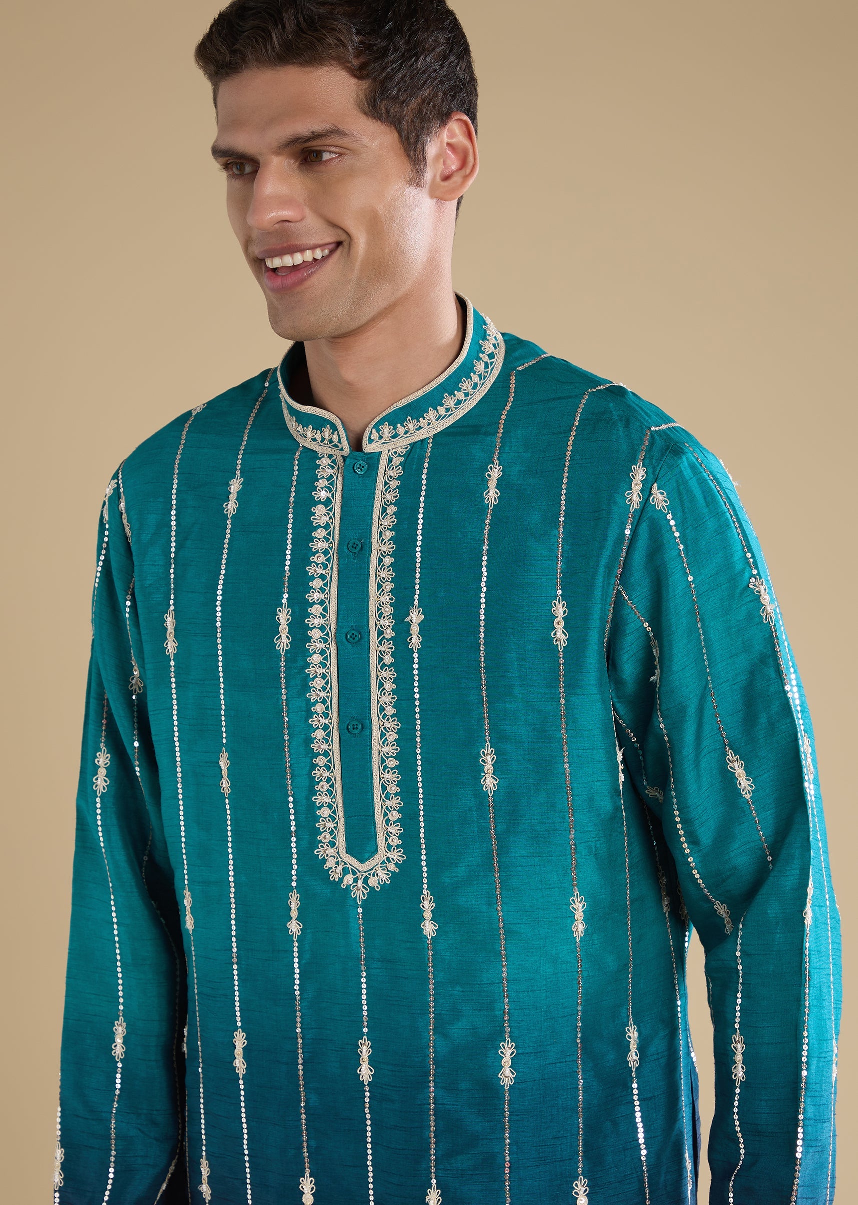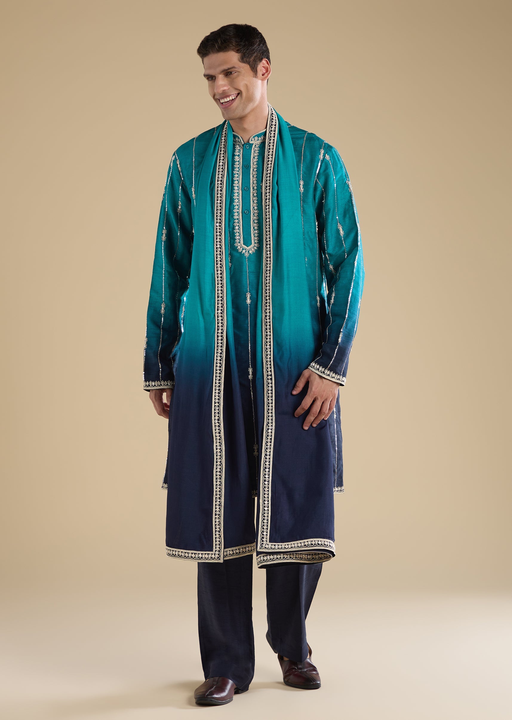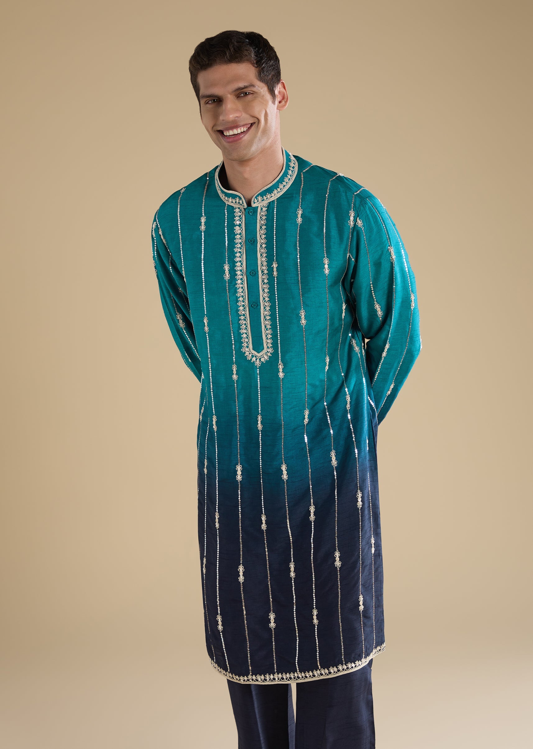 Crafted in a silk-blend, this blue kurta set features dori work with bead and sequin embellishments. Designed with a mandarin collar, full sleeves and front button with hook-eye closure, it... More Product Details